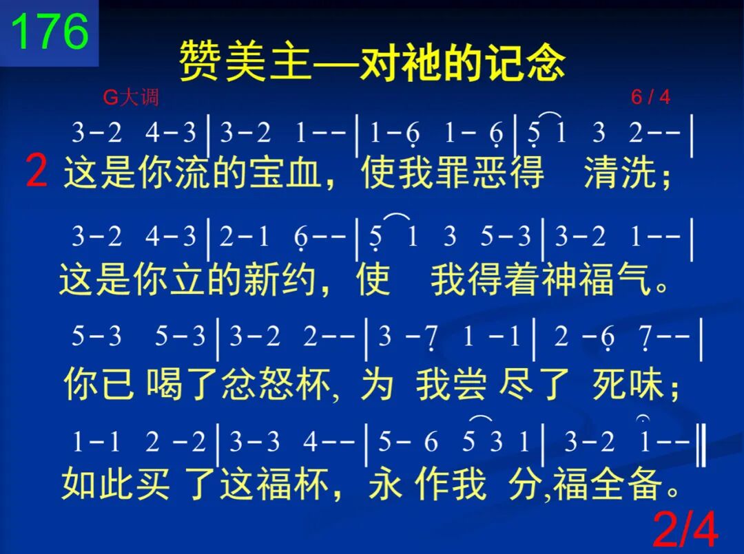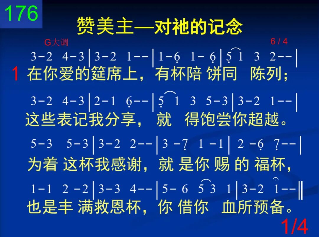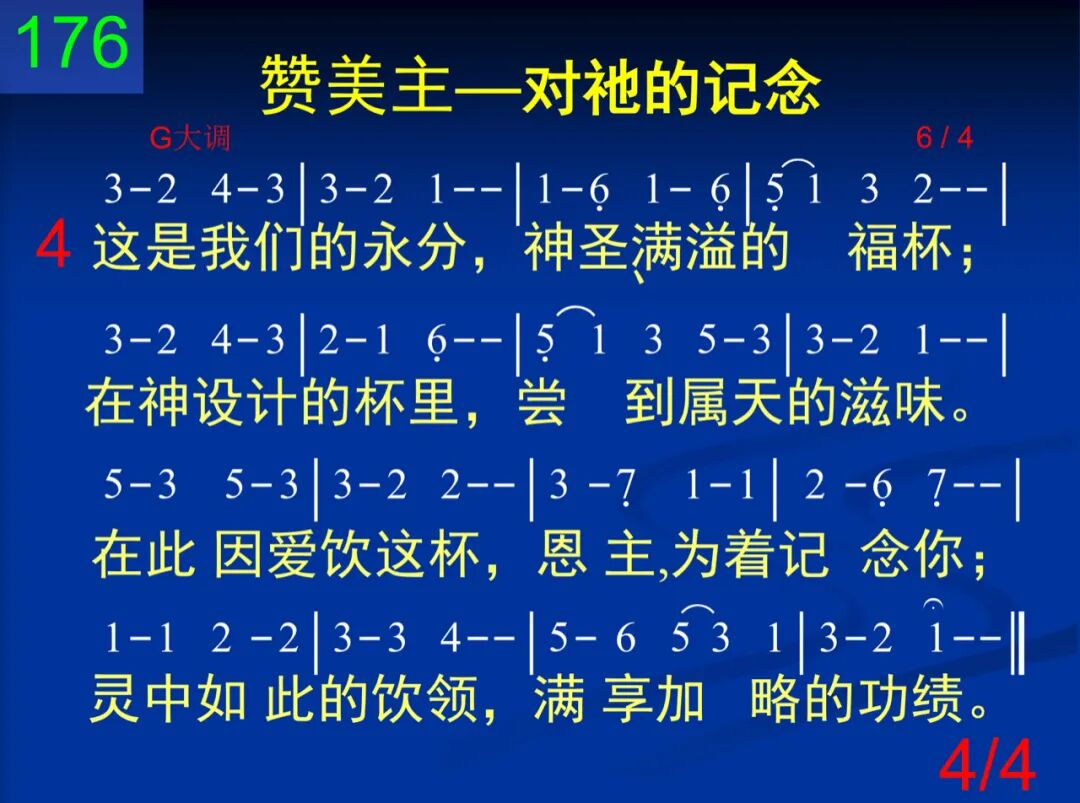 在你爱的筵席上,有杯陪饼同陈列;这些表记我分享,就得饱尝你超越。为着这杯我感谢,就是你赐的福杯,也是丰满救恩杯,你藉你血所预备。 二 这是你流的宝血,使我罪恶得清洗;这是你立的新约,使我得着神福气。你已喝了忿怒杯,为我尝尽了死味;如此买了这福杯,永作我分,福全备。 三 亚当堕落失去神,在这分内我得回;藉着你所流的血,神就成为我恩惠。救赎、生命并一切,在这分内都包括;凡神所愿并所筹,在这分内全归我。 四 这是我们的永分,神圣、满溢的福杯;在神设计的杯里,尝到属天的滋味。在此因爱饮这杯,恩主,为着记念你;灵中如此的饮领,满享加略的功绩。