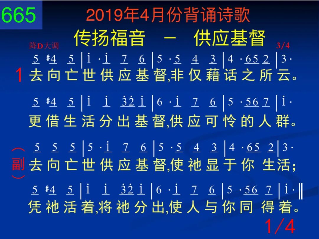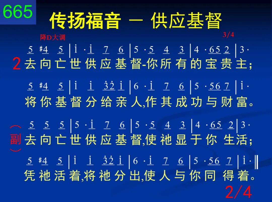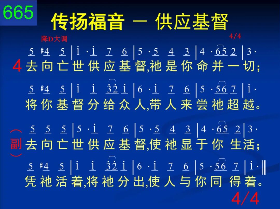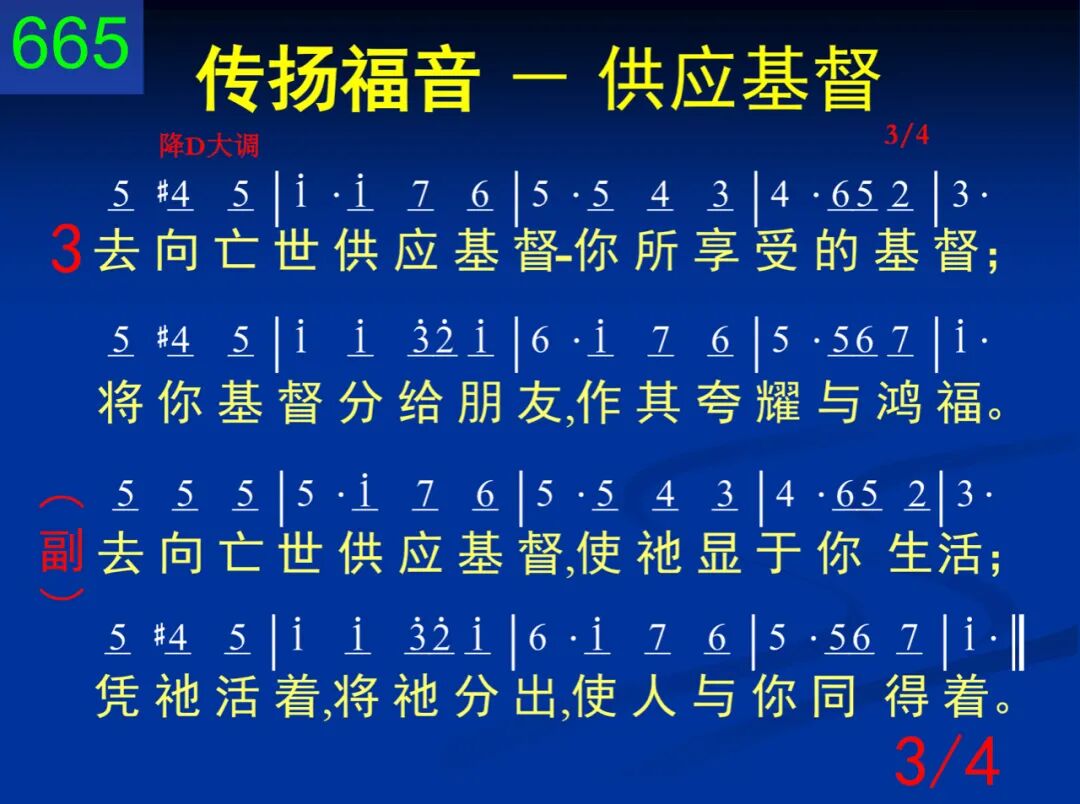 去向亡世供应基督,非仅藉话之所云。更藉生活分出基督,供应可怜的人群。 去向亡世供应基督,使祂显于你生活;凭祂活着,将祂分出,使人与你同得着。 二 去向亡世供应基督─你所有的宝贵主;将你基督分给亲人,作其成功与财富。 去向亡世供应基督,使祂显于你生活;凭祂活着,将祂分出,使人与你同得着。 三 去向亡世供应基督─你所享受的基督;将你基督分给朋友,作其夸耀与鸿福。 去向亡世供应基督,使祂显于你生活;凭祂活着,将祂分出,使人与你同得着。 四 去向亡世供应基督,祂是你命并一切;将你基督分给众人,带人来尝祂超越。 去向亡世供应基督,使祂显于你生活;凭祂活着,将祂分出,使人与你同得着。