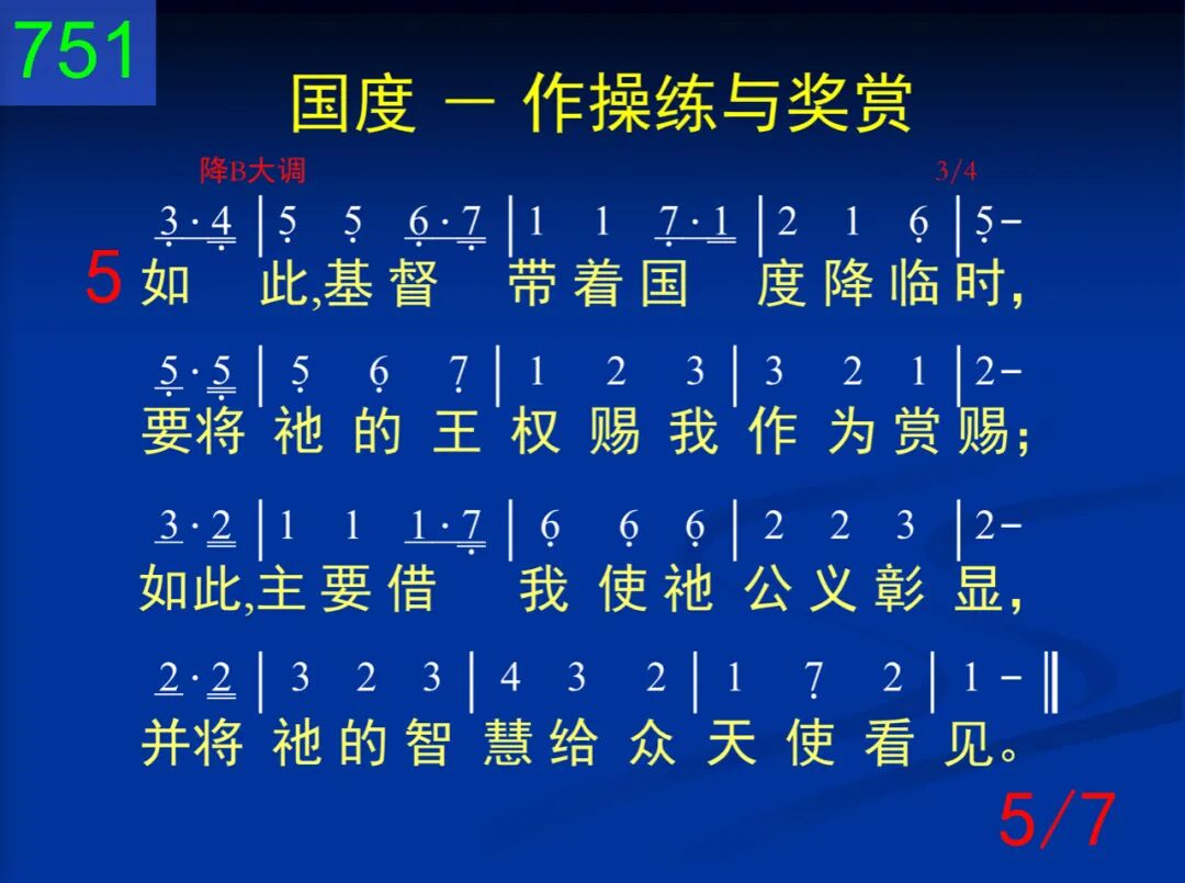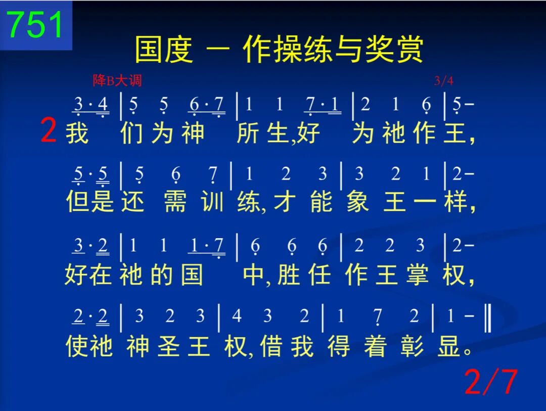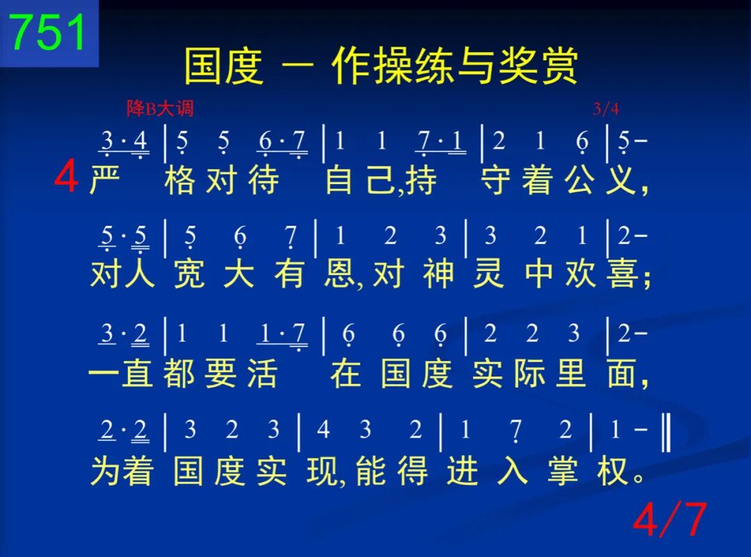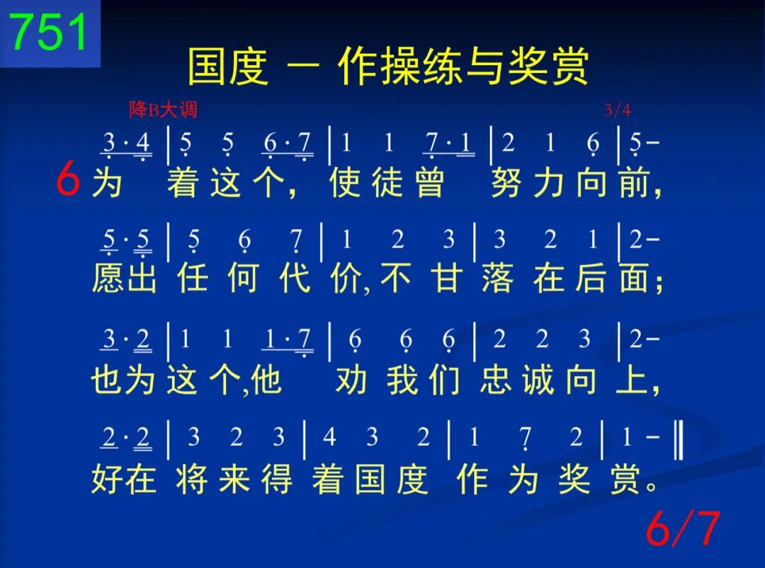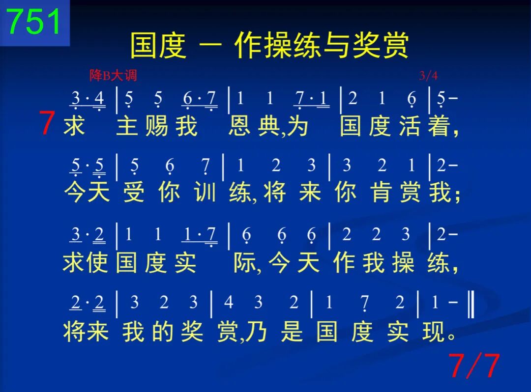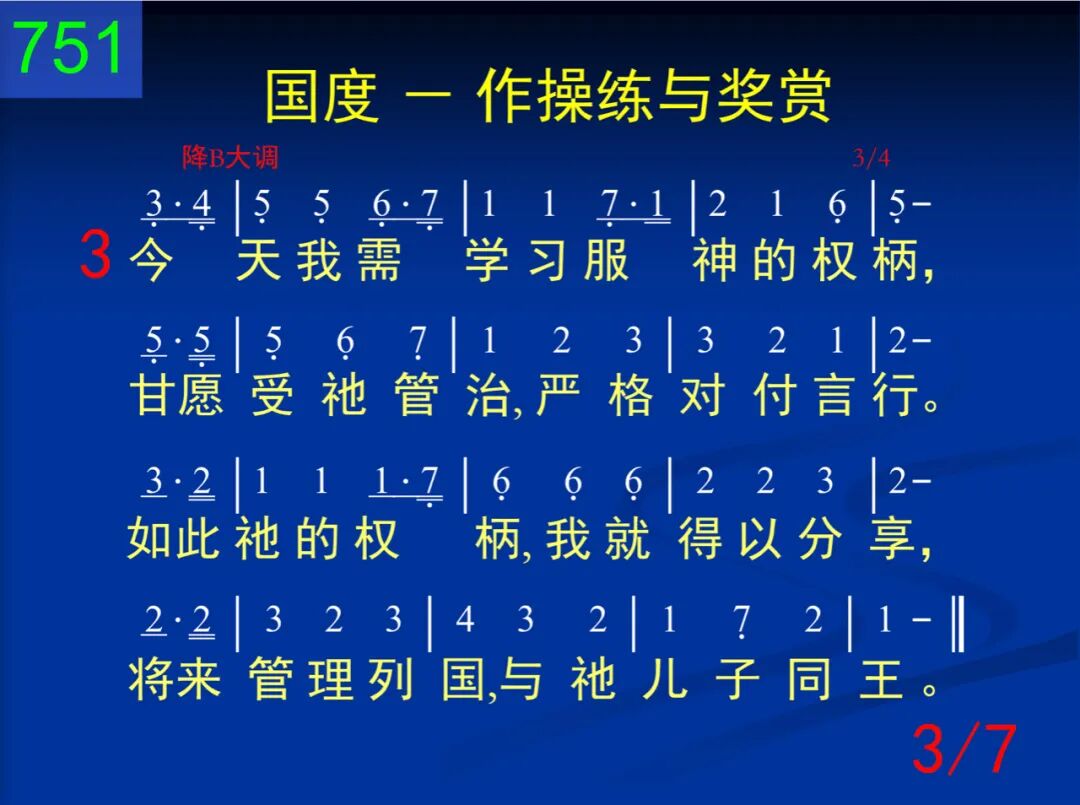今天神的国度,对我是操练,将来却是奖赏,与主一同掌权。这是神的智慧,现今将我训练,使祂计划完成,将祂公义彰显。 二 我们为神所生,好为祂作王,但是还需训练,才能像王一样,好在祂的国中,胜任作王掌权,使祂神圣王权,藉我得着彰显。 三 今天我需学习服神的权柄,甘愿受祂管治,严格对付言行。如此祂的权柄,我就得以分享,将来管理列国,与祂儿子同王。 四 严格对待自己,持守着公义,对人宽大有恩,对神灵中欢喜;一直都要活在国度实际里面,为着国度实现,能得进入掌权。 五 如此,基督带着国度降临时,要将祂的王权赐我作为赏赐;如此,主要藉我使祂公义彰显,并将祂的智慧给众天使看见。 六 为着这个,使徒曾努力向前,愿出任何代价,不甘落在后面;也为这个,他劝我们忠诚向上,好在将来得着国度作为奖赏。 七 求主赐我恩典,为国度活着,今天受你训练,将来你肯赏我;求使国度实际,今天作我操练,将来我的奖赏,乃是国度实现。