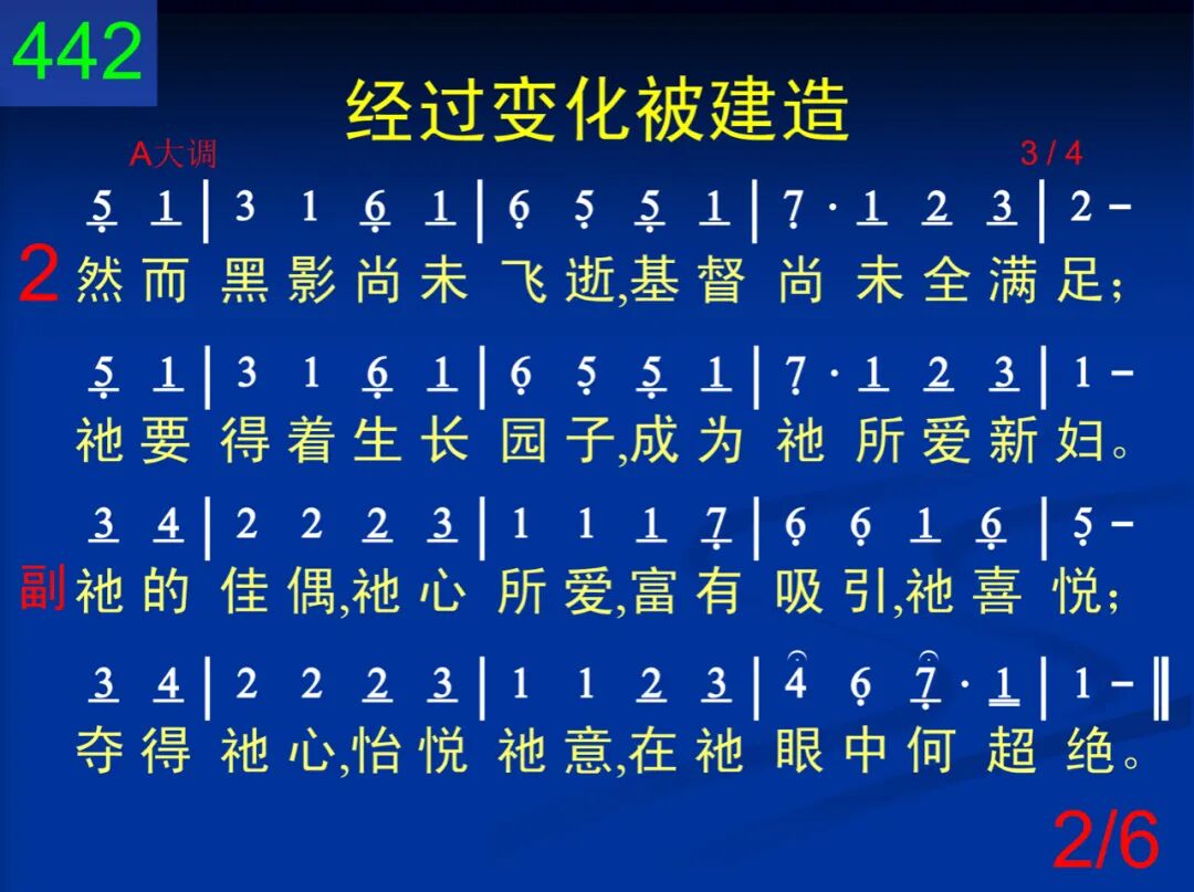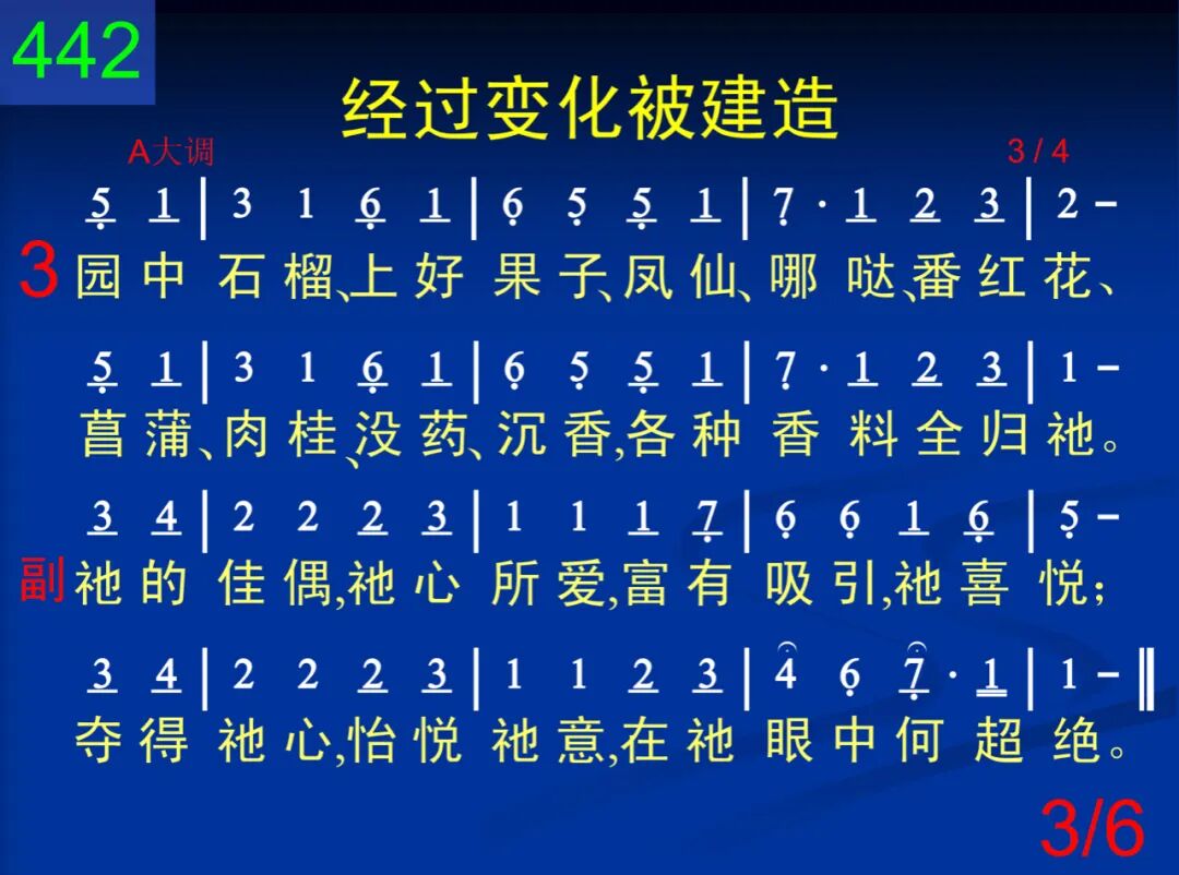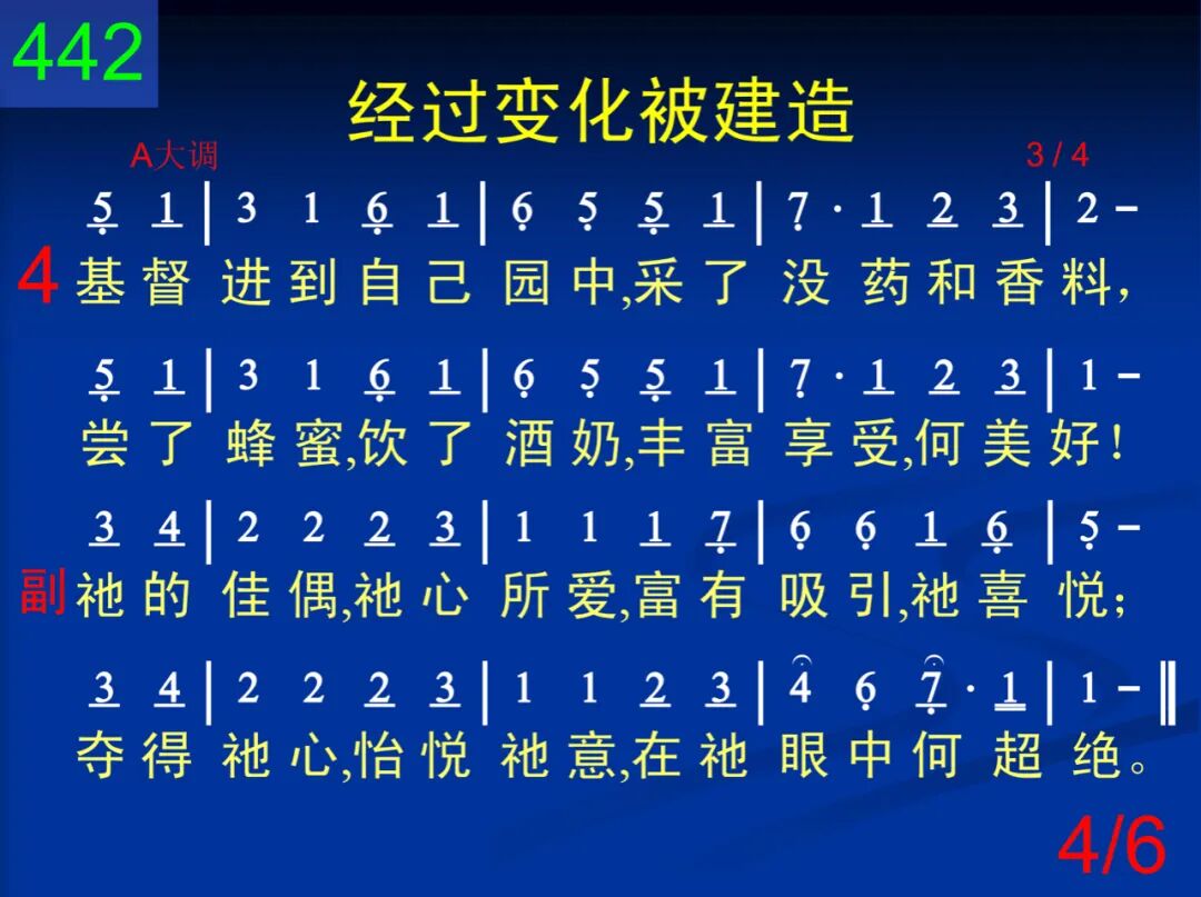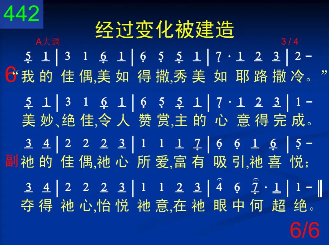 基督要使寻求祂者,成为烟柱和卧榻,且成华轿、荣耀冠冕,主必作成绝无差。 祂的佳偶,祂心所爱,富有吸引,祂喜悦;夺得祂心,怡悦祂意,在祂眼中何超绝。 二 然而黑影尚未飞逝,基督尚未全满足;祂要得着生长园子,成为祂所爱新妇。 祂的佳偶,祂心所爱,富有吸引,祂喜悦;夺得祂心,怡悦祂意,在祂眼中何超绝。 三 园中石榴、上好果子、凤仙、哪哒、番红花、菖蒲、肉桂、没药、沉香,各种香料全归祂。 祂的佳偶,祂心所爱,富有吸引,祂喜悦;夺得祂心,怡悦祂意,在祂眼中何超绝。 四 基督进到自己园中,采了没药和香料,尝了蜂蜜,饮了酒奶,丰富享受,何美好! 祂的佳偶,祂心所爱,富有吸引,祂喜悦;夺得祂心,怡悦祂意,在祂眼中何超绝。 五 佳美园子产生材料,经过变化被建造,成为圣城使神满意,且使仇敌全窜逃。 祂的佳偶,祂心所爱,富有吸引,祂喜悦;夺得祂心,怡悦祂意,在祂眼中何超绝。 六 “我的佳偶,美如得撒,秀美如耶路撒冷。”美妙、绝佳,令人赞赏,主的心意得完成。 祂的佳偶,祂心所爱,富有吸引,祂喜悦;夺得祂心,怡悦祂意,在祂眼中何超绝。