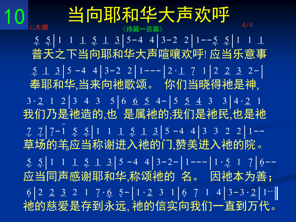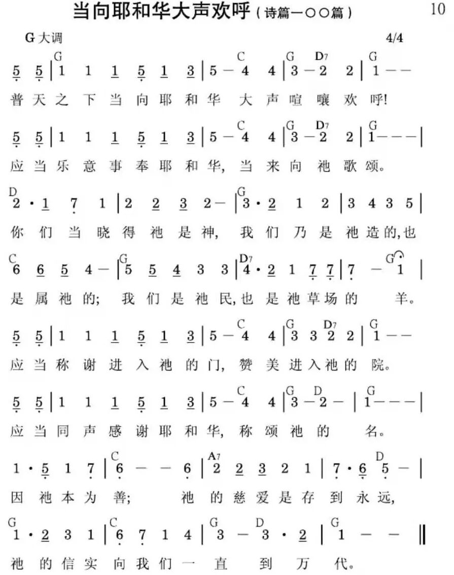 普天之下当向耶和华大声喧嚷欢呼!应当乐意事奉耶和华,当来向祂歌颂。你们当晓得祂是神,我们乃是祂造的,也是属祂的;我们是祂民,也是祂草场的羊。应当称谢进入祂的门,赞美进入祂的院。应当同声感谢耶和华,称颂祂的名。因祂本为善;祂的慈爱是存到永远,祂的信实向我们一直到万代。