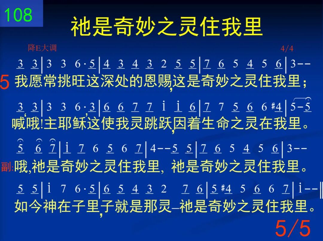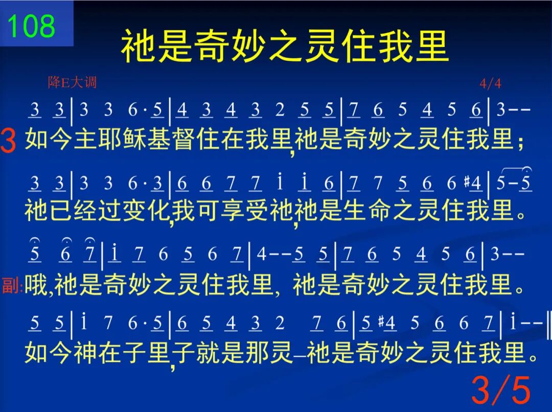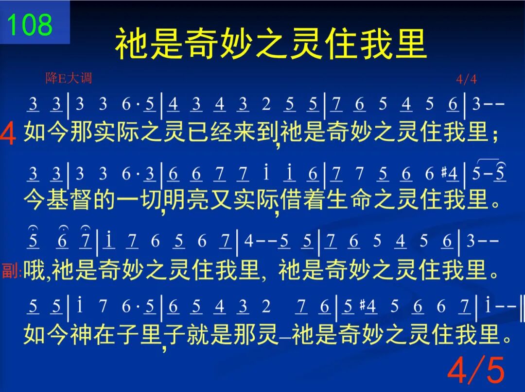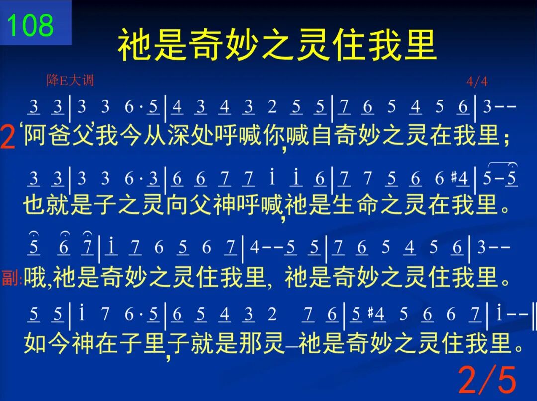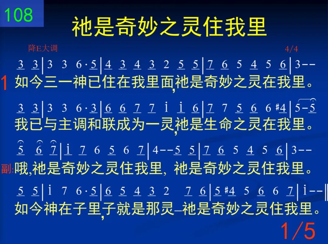 如今三一神已住在我里面,祂是奇妙之灵在我里。我已与主调和联成为一灵,祂是生命之灵在我里。 哦,祂是奇妙之灵住我里,祂是奇妙之灵住我里。如今神在子里,子就是那灵─祂是奇妙之灵住我里。 二 “阿爸父”我今从深处呼喊你,喊自奇妙之灵在我里;也就是子之灵向父神呼喊,祂是生命之灵在我里。 哦,祂是奇妙之灵住我里,祂是奇妙之灵住我里。如今神在子里,子就是那灵─祂是奇妙之灵住我里。 三 如今主耶稣基督住在我里,祂是奇妙之灵住我里;祂已经过变化,我可享受祂,祂是生命之灵住我里。 哦,祂是奇妙之灵住我里,祂是奇妙之灵住我里。如今神在子里,子就是那灵─祂是奇妙之灵住我里。 四 如今那实际之灵已经来到,祂是奇妙之灵住我里;今基督的一切,明亮又实际,藉着生命之灵住我里。 哦,祂是奇妙之灵住我里,祂是奇妙之灵住我里。如今神在子里,子就是那灵─祂是奇妙之灵住我里。 五 我愿常挑旺这深处的恩赐,这是奇妙之灵住我里;喊“哦!主耶稣,”这使我灵跳跃,因着生命之灵在我里。 哦,祂是奇妙之灵住我里,祂是奇妙之灵住我里。如今神在子里,子就是那灵─祂是奇妙之灵住我里。