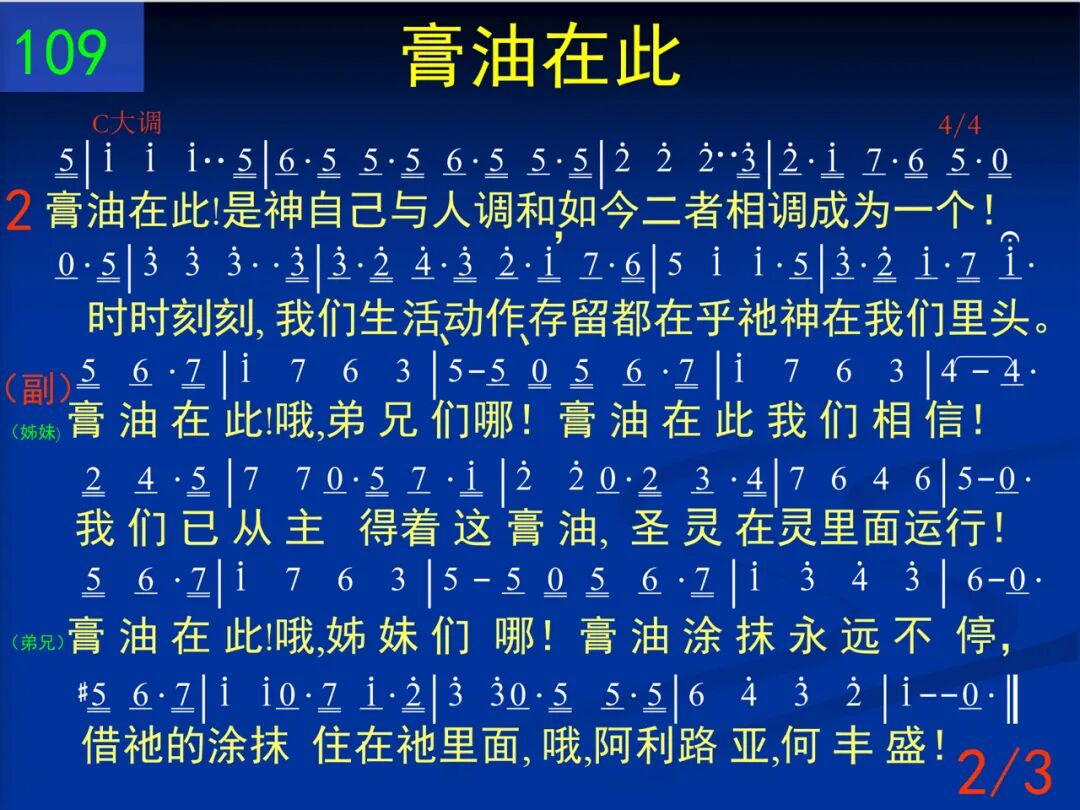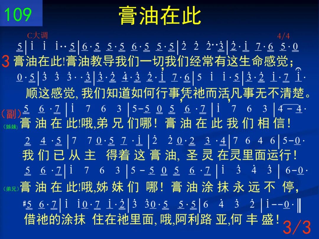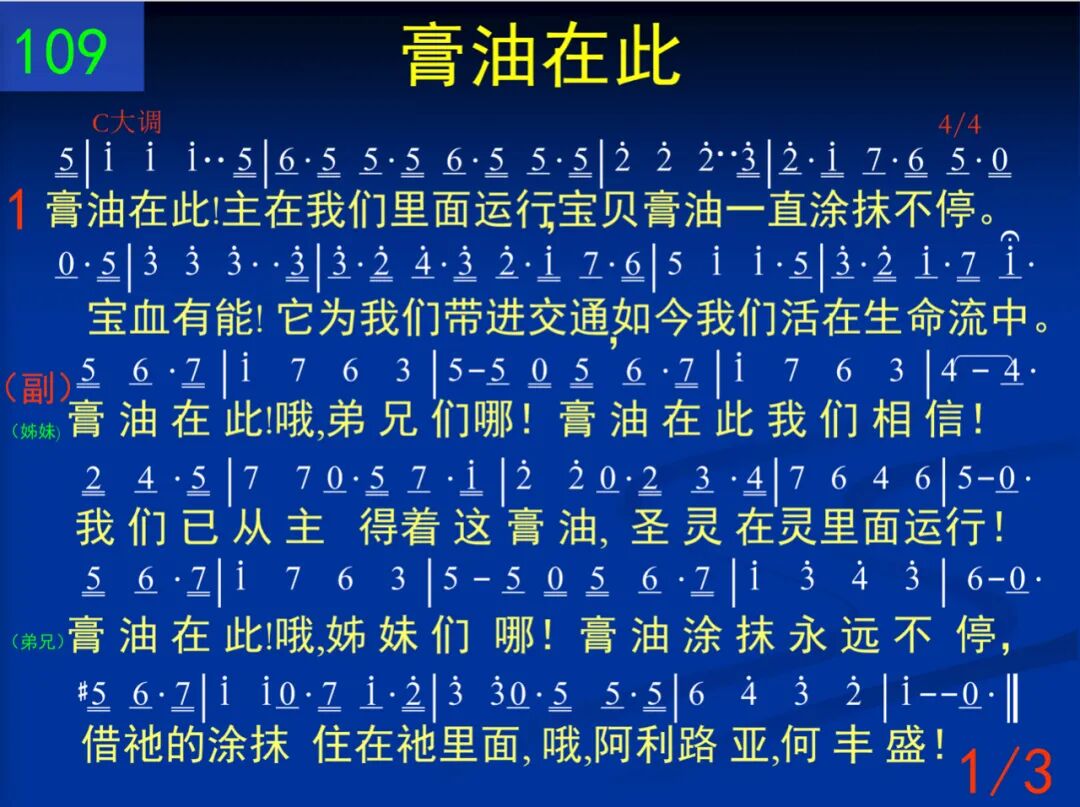 膏油在此!主在我们里面运行,宝贝膏油一直涂抹不停。宝血有能!它为我们带进交通,如今我们活在生命流中。 (姊妹) 膏油在此!哦,弟兄们哪!膏油在此我们相信!我们已从主得着这膏油,圣灵在灵里面运行!(弟兄)膏油在此!哦,姊妹们哪!膏油涂抹永远不停,藉祂的涂抹住在祂里面,哦,阿利路亚,何丰盛! 二 膏油在此!是神自己与人调和,如今二者相调成为一个!时时刻刻,我们生活、动作、存留都在乎祂─神在我们里头。 (姊妹) 膏油在此!哦,弟兄们哪!膏油在此我们相信!我们已从主得着这膏油,圣灵在灵里面运行!(弟兄)膏油在此!哦,姊妹们哪!膏油涂抹永远不停,藉祂的涂抹住在祂里面,哦,阿利路亚,何丰盛! 三 膏油在此!膏油教导我们一切,我们经常有这生命感觉;顺这感觉,我们知道如何行事,凭祂而活,凡事无不清楚。 (姊妹) 膏油在此!哦,弟兄们哪!膏油在此我们相信!我们已从主得着这膏油,圣灵在灵里面运行!(弟兄)膏油在此!哦,姊妹们哪!膏油涂抹永远不停,藉祂的涂抹住在祂里面,哦,阿利路亚,何丰盛!