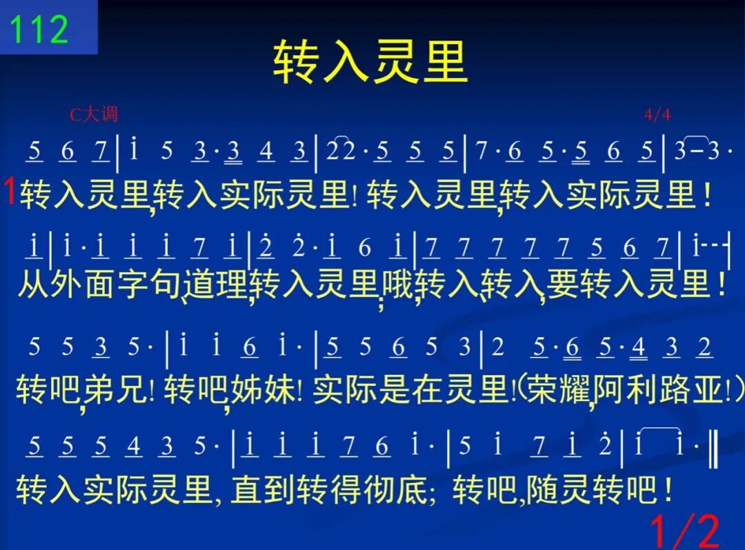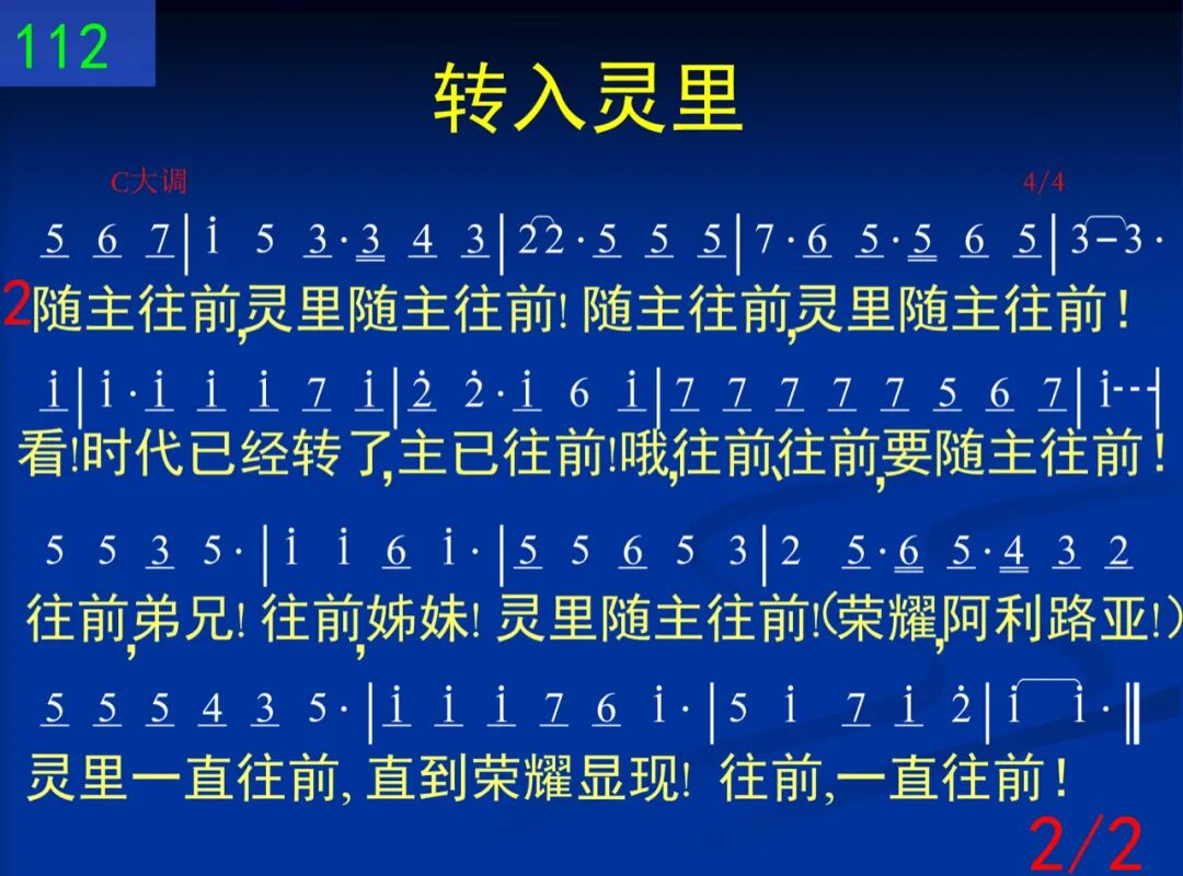转入灵里,转入实际灵里!转入灵里,转入实际灵里!从外面字句、道理,转入灵里;哦,转入、转入,要转入灵里!转吧,弟兄!转吧,姊妹!实际是在灵里!(荣耀,阿利路亚!)转入实际灵里,直到转得彻底;转吧,随灵转吧! 二 随主往前,灵里随主往前!随主往前,灵里随主往前!看!时代已经转了,主已往前!哦,往前、往前,要随主往前!往前,弟兄!往前,姊妹!灵里随主往前!(荣耀,阿利路亚!)灵里一直往前,直到荣耀显现!往前,一直往前!