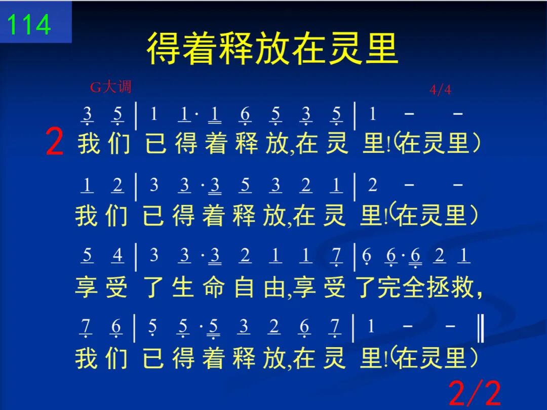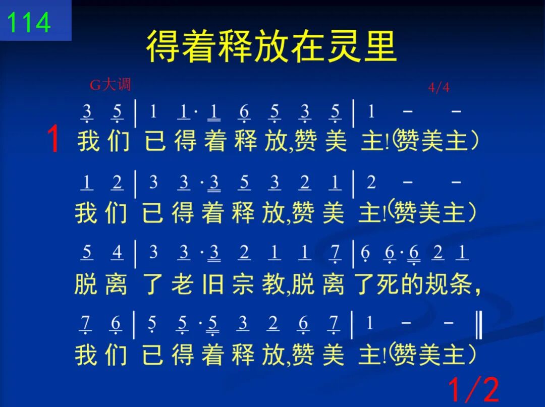我们已得着释放,赞美主!(赞美主)我们已得着释放,赞美主!(赞美主)脱离了老旧宗教,脱离了死的规条,我们已得着释放,赞美主!(赞美主) 二 我们已得着释放,在灵里!(在灵里)我们已得着释放,在灵里!(在灵里)享受了生命自由,享受了完全拯救,我们已得着释放,在灵里!(在灵里)