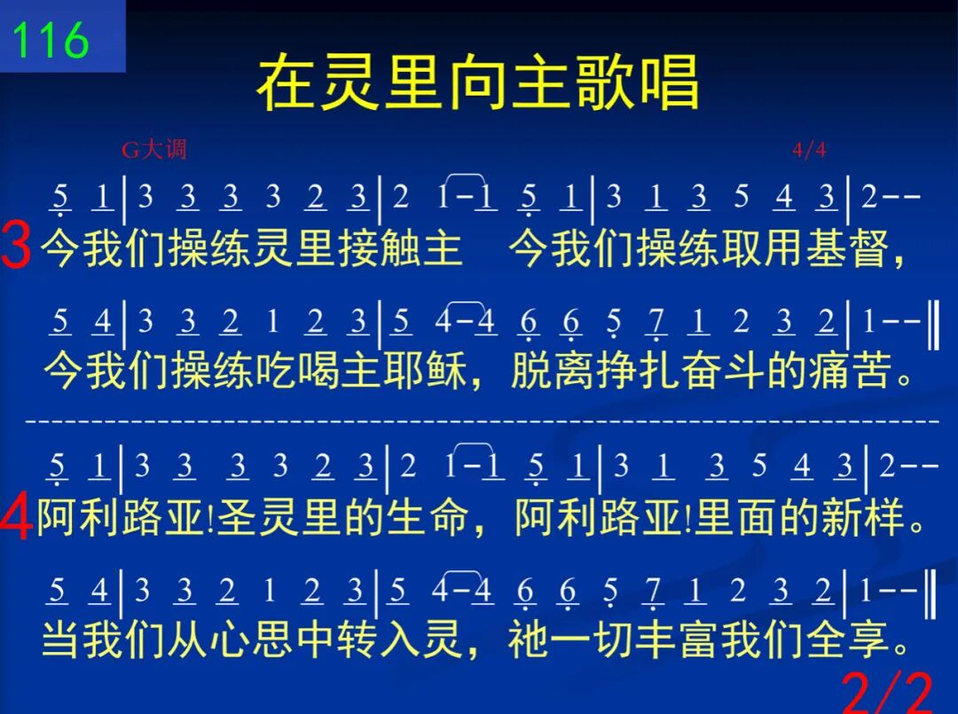 我们要在灵里向主歌唱,我们要从里面向主唱,我们要阿利路亚向主唱,我们相调为一向主唱! 二 我们曾多年在宗教里面,我们曾多年在心思里,我们曾多年在情感里面,一直追求却在黑暗里。 三 今我们操练灵里接触主今我们操练取用基督,今我们操练吃喝主耶稣,脱离挣扎奋斗的痛苦。 四 阿利路亚!圣灵里的生命,阿利路亚!里面的新样。当我们从心思中转入灵,祂一切丰富我们全享。