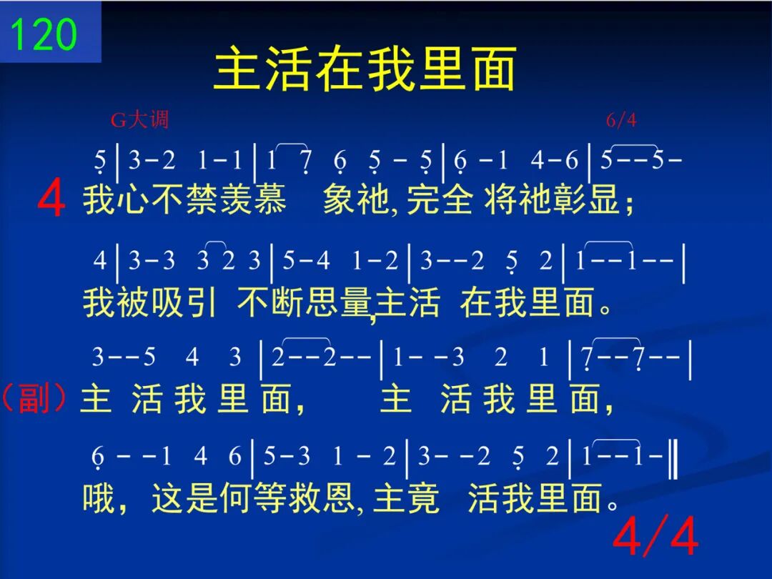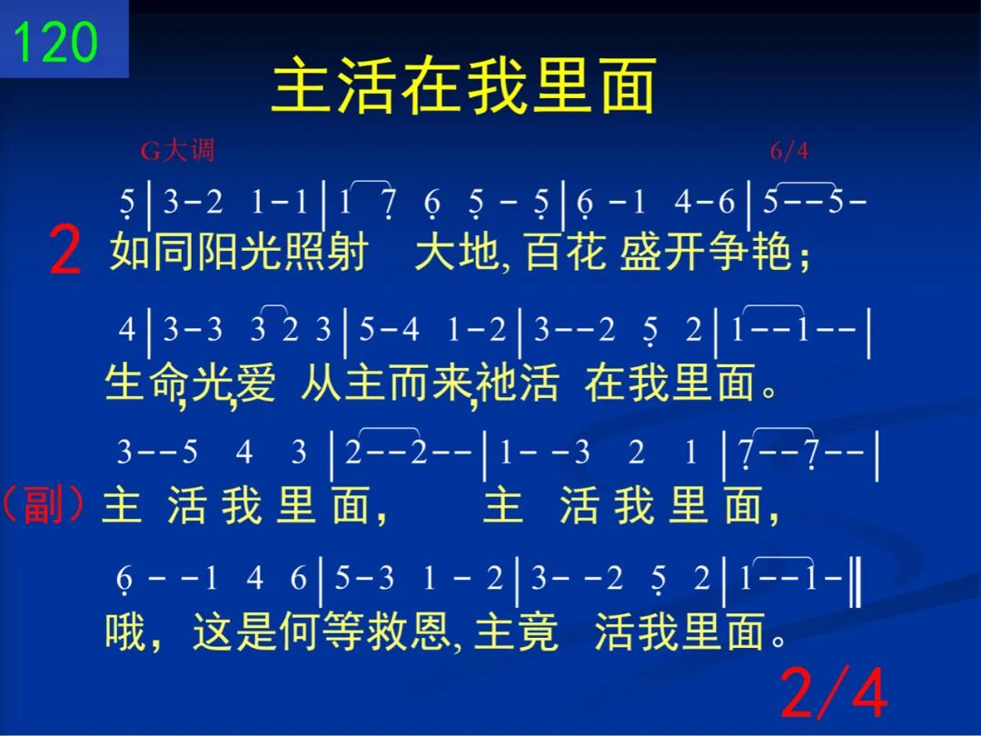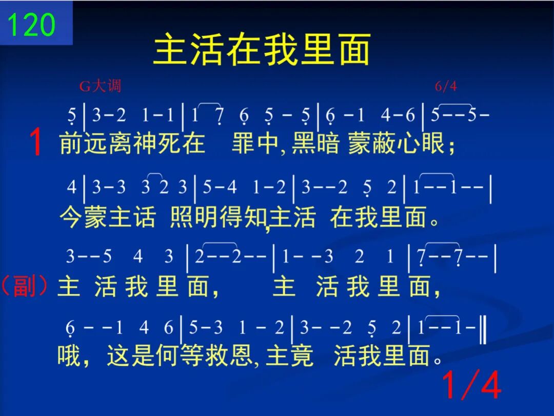 前远离神死在罪中,黑暗蒙蔽心眼;今蒙主话照明得知,主活在我里面。 主活我里面,主活我里面,哦,这是何等救恩,主竟活我里面。 二 如同阳光照射大地,百花盛开争艳;生命,光,爱从主而来,祂活在我里面。 主活我里面,主活我里面,哦,这是何等救恩,主竟活我里面。 三 正如花朵隐于花籽,树木孕于种子,同样,满带实际、恩典,主活在我里面。 主活我里面,主活我里面,哦,这是何等救恩,主竟活我里面。 四 我心不禁羡慕像祂,完全将祂彰显;我被吸引不断思量,主活在我里面。 主活我里面,主活我里面,哦,这是何等救恩,主竟活我里面。