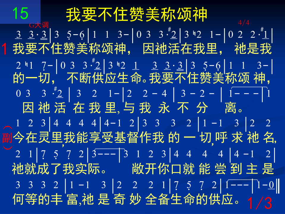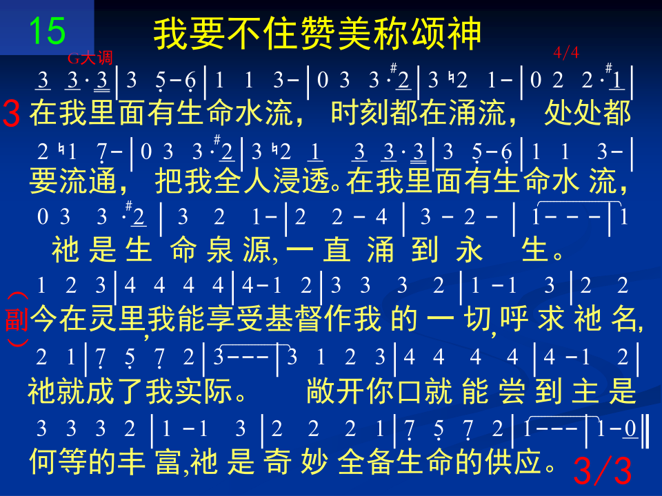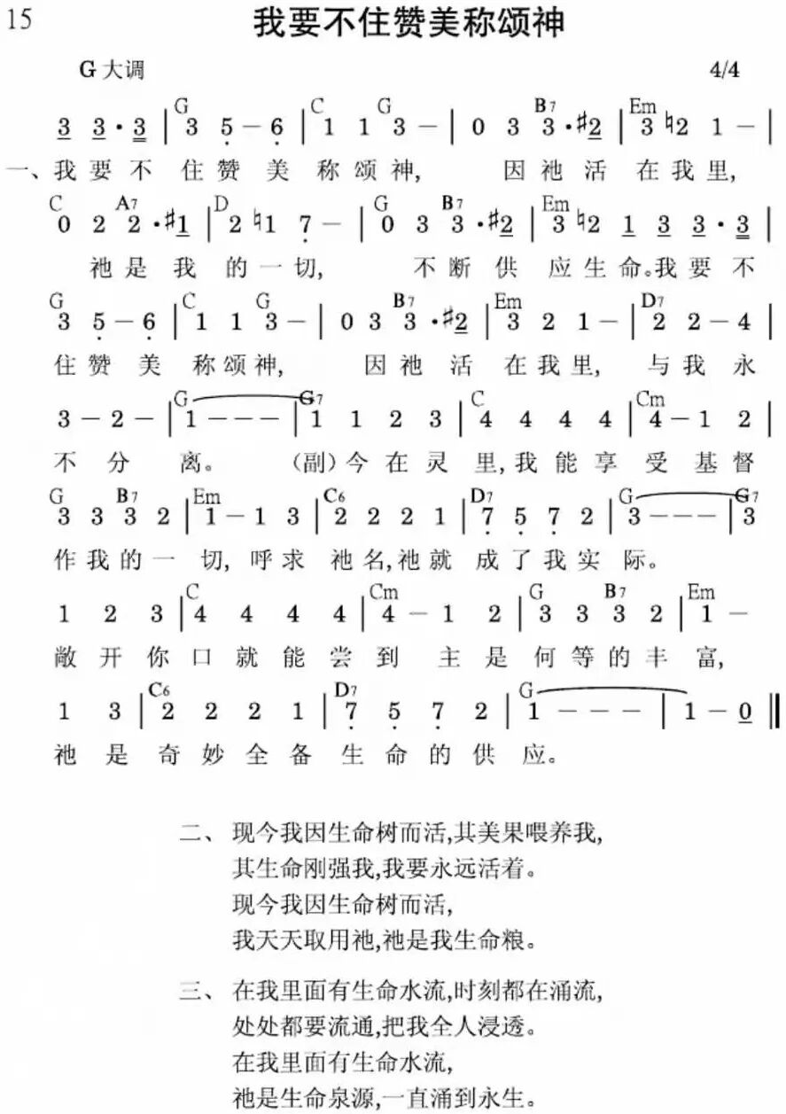 我要不住赞美称颂神,因祂活在我里,祂是我的一切,不断供应生命。我要不住赞美称颂神,因祂活在我里,与我永不分离。 今在灵里我能享受基督作我的一切呼求祂名祂就成了我实际。敞开你口就能尝到主是何等的丰富,祂是奇妙全备生命的供应。 二 现今我因生命树而活,其美果喂养我,其生命刚强我,我要永远活着。现今我因生命树而活,我天天取用祂,祂是我生命粮。 今在灵里我能享受基督作我的一切呼求祂名祂就成了我实际。敞开你口就能尝到主是何等的丰富,祂是奇妙全备生命的供应。 三 在我里面有生命水流,时刻都在涌流,处处都要流通,把我全人浸透。在我里面有生命水流,祂是生命泉源,一直涌到永生。 今在灵里我能享受基督作我的一切呼求祂名祂就成了我实际。敞开你口就能尝到主是何等的丰富,祂是奇妙全备生命的供应。