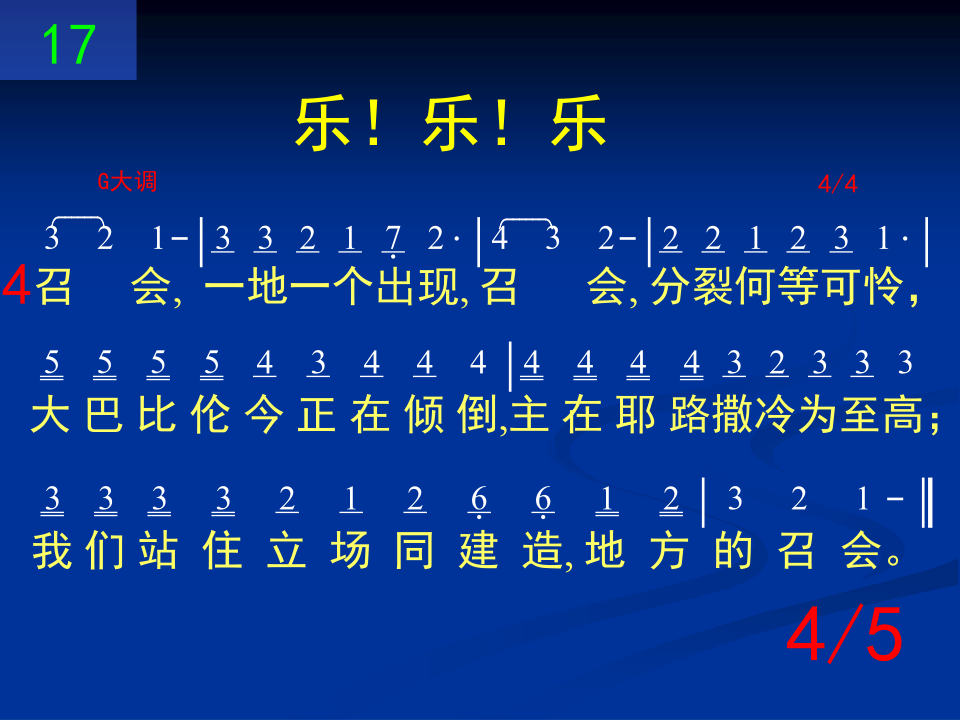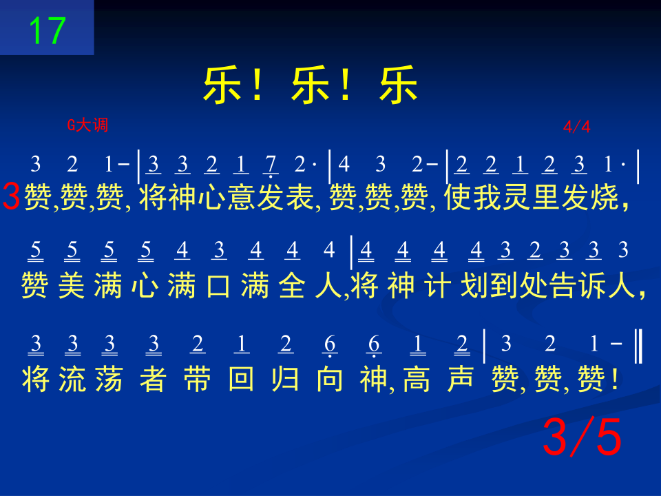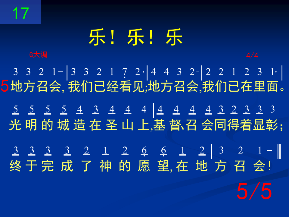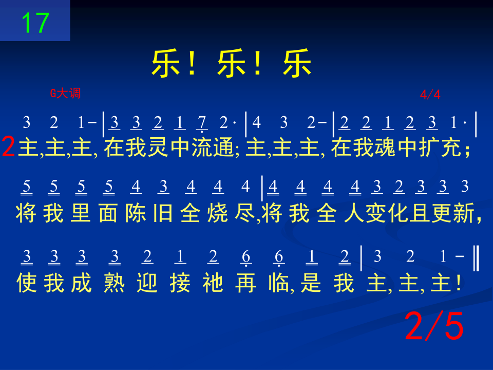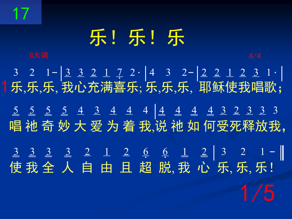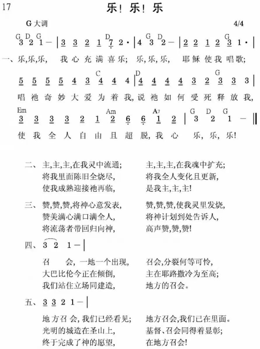 乐,乐,乐,我心充满喜乐;乐,乐,乐,耶稣使我唱歌;唱祂奇妙大爱为着我,说祂如何受死释放我,使我全人自由且超脱,我心乐,乐,乐! 二 主,主,主,在我灵中流通;主,主,主,在我魂中扩充;将我里面陈旧全烧尽,将我全人变化且更新,使我成熟迎接祂再临,是我主,主,主! 三 赞,赞,赞,将神心意发表,赞,赞,赞,使我灵里发烧,赞美满心满口满全人,将神计划到处告诉人,将流荡者带回归向神,高声赞,赞,赞! 四 召会,一地一个出现,召会,分裂何等可怜,大巴比伦今正在倾倒,主在耶路撒冷为至高;我们站住立场同建造,地方的召会。 五 地方召会,我们已经看见;地方召会,我们已在里面。光明的城造在圣山上,基督、召会同得着显彰;终于完成了神的愿望,在地方召会!