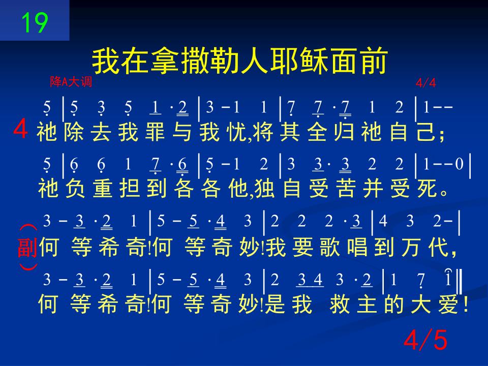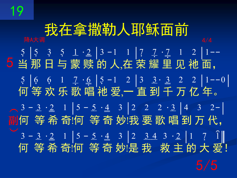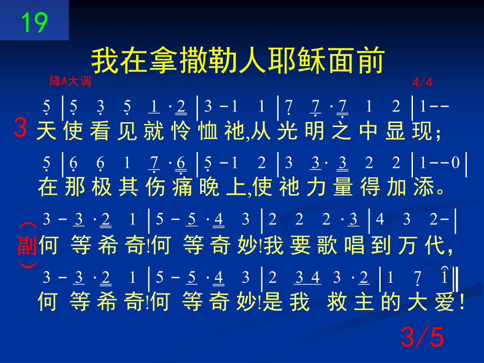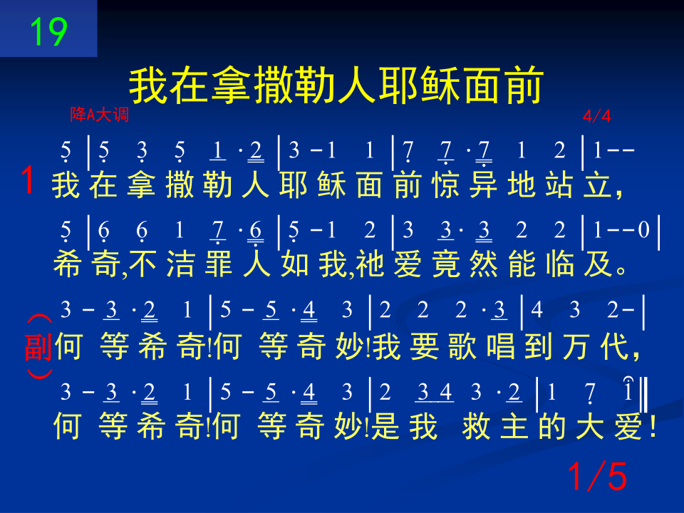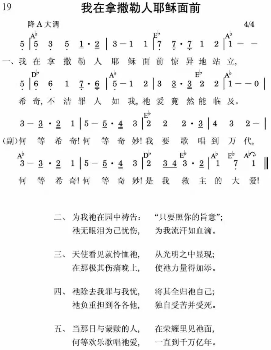 我在拿撒勒人耶稣面前惊异的站立,希奇,不洁罪人如我,祂爱竟然能临及。 何等希奇!何等奇妙!我要歌唱到万代,何等希奇!何等奇妙!是我救主的大爱! 二 为我祂在园中祷告:“只要照你的旨意;”祂无眼泪为己忧伤,为我流汗如血滴。 何等希奇!何等奇妙!我要歌唱到万代,何等希奇!何等奇妙!是我救主的大爱! 三 天使看见就怜恤祂,从光明之中显现;在那极其伤痛晚上,使祂力量得加添。 何等希奇!何等奇妙!我要歌唱到万代,何等希奇!何等奇妙!是我救主的大爱! 四 祂除去我罪与我忧,将其全归祂自己;祂负重担到各各他,独自受苦并受死。 何等希奇!何等奇妙!我要歌唱到万代,何等希奇!何等奇妙!是我救主的大爱! 五 当那日与蒙赎的人,在荣耀里见祂面,何等欢乐歌唱祂爱,一直到千万亿年。 何等希奇!何等奇妙!我要歌唱到万代,何等希奇!何等奇妙!是我救主的大爱!