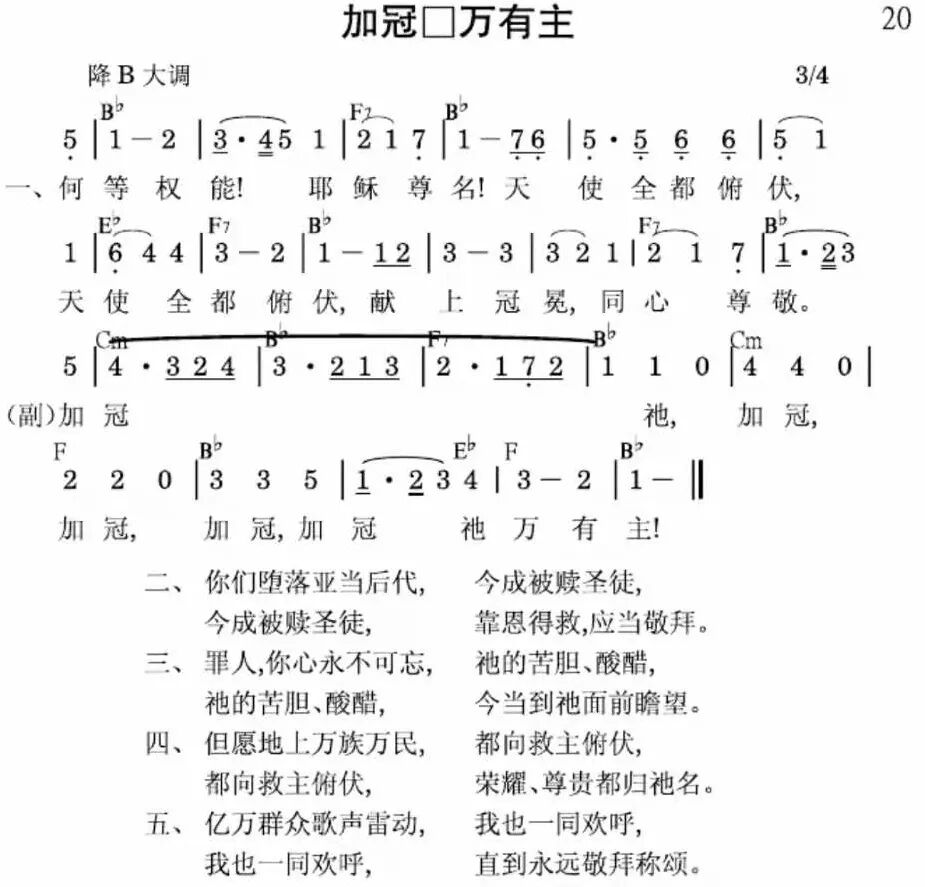 何等权能!耶稣尊名!天使全都俯伏,天使全都俯伏,献上冠冕,同心尊敬。 加冠祂,加冠,加冠,加冠,加冠祂万有主! 二 你们堕落亚当后代,今成被赎圣徒,今成被赎圣徒,靠恩得救,应当敬拜。 加冠祂,加冠,加冠,加冠,加冠祂万有主! 三 罪人,你心永不可忘,祂的苦胆、酸醋,祂的苦胆、酸醋,今当到祂面前瞻望。 加冠祂,加冠,加冠,加冠,加冠祂万有主! 四 但愿地上万族万民,都向救主俯伏。都向救主俯伏,荣耀、尊贵都归祂名。 加冠祂,加冠,加冠,加冠,加冠祂万有主! 五 亿万群众歌声雷动,我也一同欢呼,我也一同欢呼,直到永远敬拜称颂。 加冠祂,加冠,加冠,加冠,加冠祂万有主!