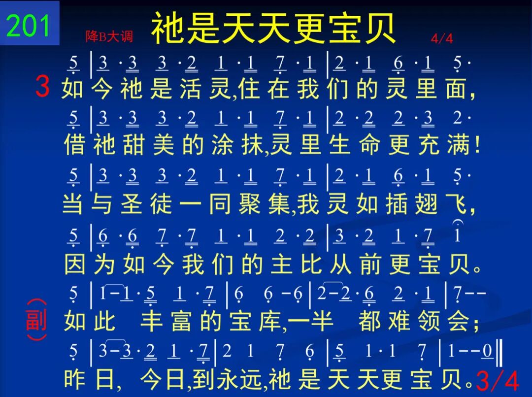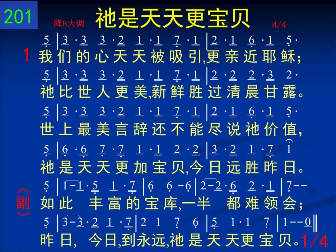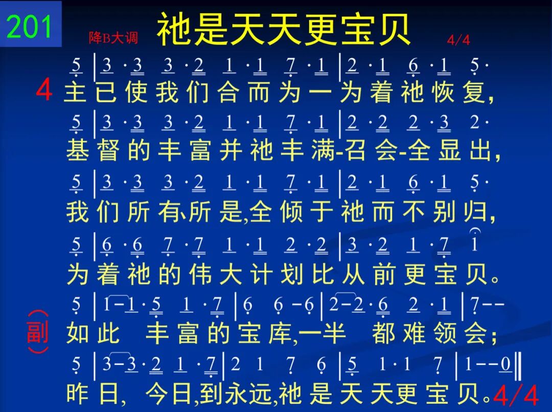 我们的心天天被吸引,更亲近耶稣;祂比世人更美,新鲜胜过清晨甘露。世上最美言辞还不能尽说祂价值,祂是天天更加宝贝,今日远胜昨日。 如此丰富的宝库,一半都难领会;昨日,今日,到永远,祂是天天更宝贝。 二 我们是在召会里面看见祂的荣耀,祂的丰富全都在此,我们不再他找,祂使我们渴慕的灵一再得着饱足,祂是天天更加宝贝,现在远胜当初。 如此丰富的宝库,一半都难领会;昨日,今日,到永远,祂是天天更宝贝。 三 如今祂是活灵,住在我们的灵里面,藉祂甜美的涂抹,灵里生命更充满!当与圣徒一同聚集,我灵如插翅飞,因为如今我们的主比从前更宝贝。 如此丰富的宝库,一半都难领会;昨日,今日,到永远,祂是天天更宝贝。 四 主已使我们合而为一为着祂恢复,基督的丰富并祂丰满─召会─全显出,我们所有、所是,全倾于祂而不别归,为着祂的伟大计划比从前更宝贝。 如此丰富的宝库,一半都难领会;昨日,今日,到永远,祂是天天更宝贝。