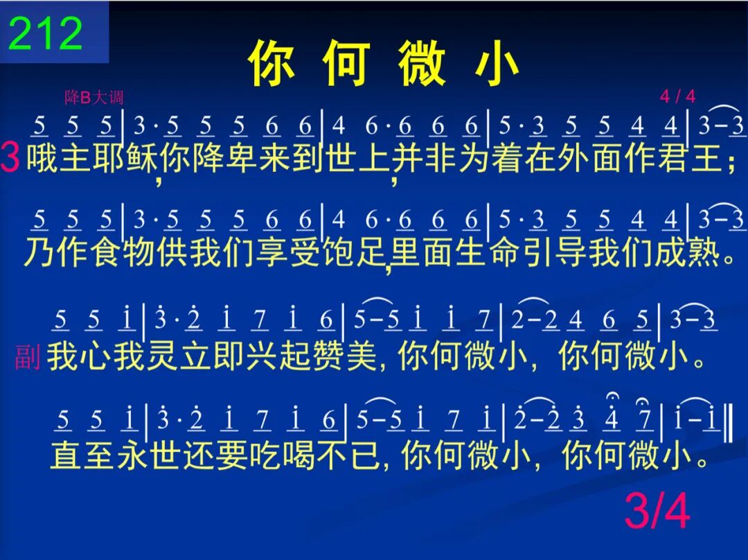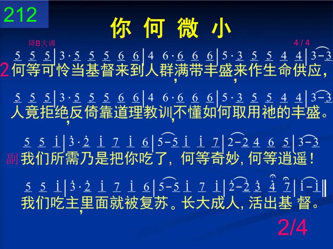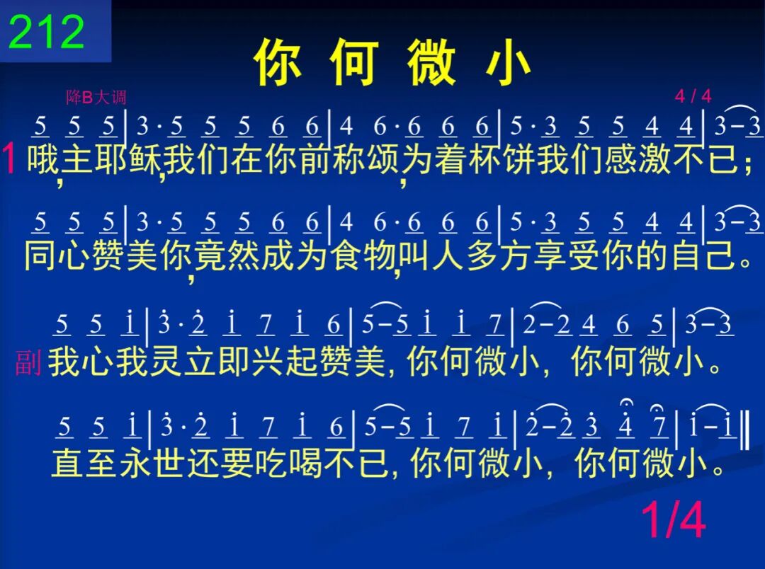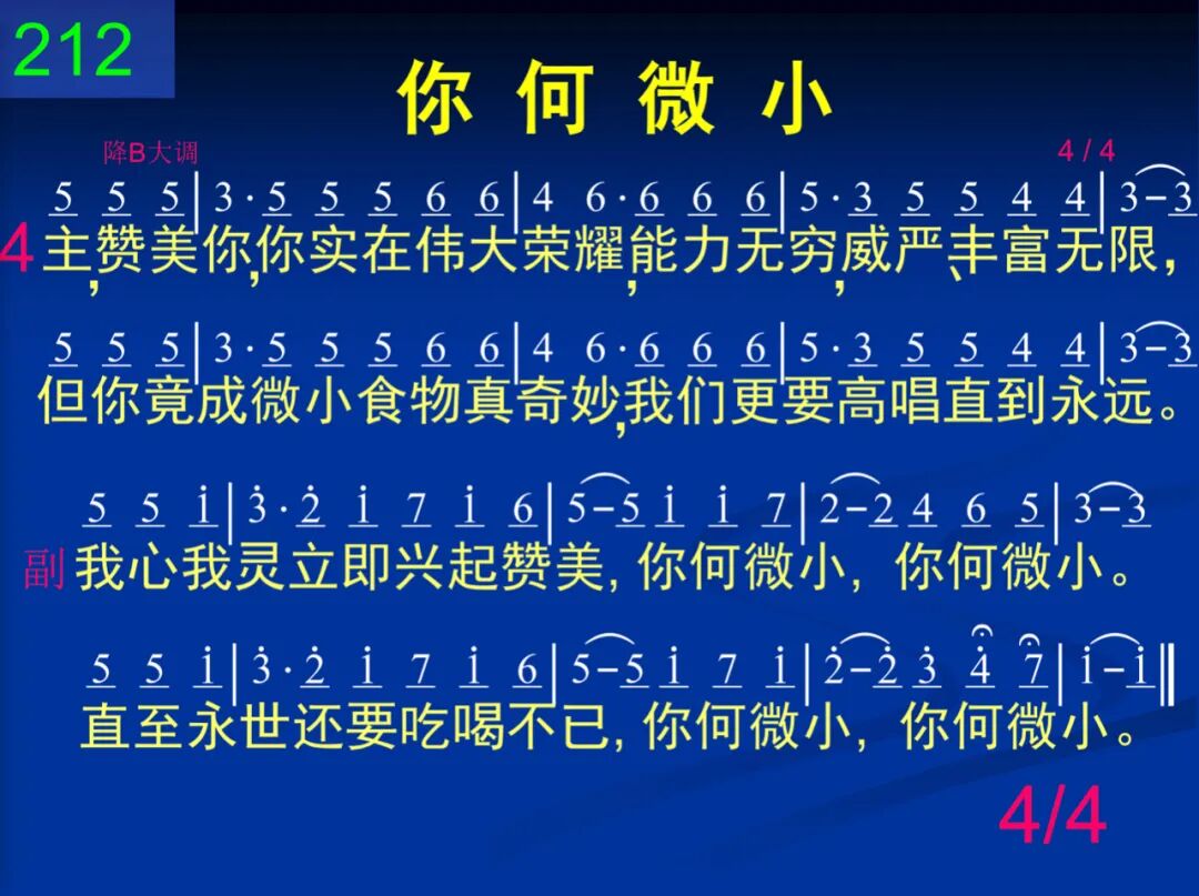哦,主耶稣,我们在你前称颂,为着杯饼我们感激不已;同心赞美,你竟然成为食物,叫人多方享受你的自己。 我心我灵立即兴起赞美,你何微小,你何微小。直至永世还要吃喝不已,你何微小,你何微小。 二 何等可怜─当基督来到人群,满带丰盛,来作生命供应,人竟拒绝,反倚靠道理教训,不懂如何取用祂的丰盛。 我们所需乃是把你吃了,何等奇妙,何等逍遥!我们吃主,里面就被复苏。长大成人,活出基督。 三 哦主耶稣,你降卑来到世上,并非为着在外面作君王;乃作食物供我们享受饱足,里面生命引导我们成熟。 我心我灵立即兴起赞美,你何微小,你何微小。直至永世还要吃喝不已,你何微小,你何微小。 四 主,赞美你,你实在伟大荣耀,能力无穷,威严、丰富无限,但你竟成微小食物真奇妙,我们更要高唱直到永远。 我心我灵立即兴起赞美,你何微小,你何微小。直至永世还要吃喝不已,你何微小,你何微小。 注:第三、四节用第一节副歌。