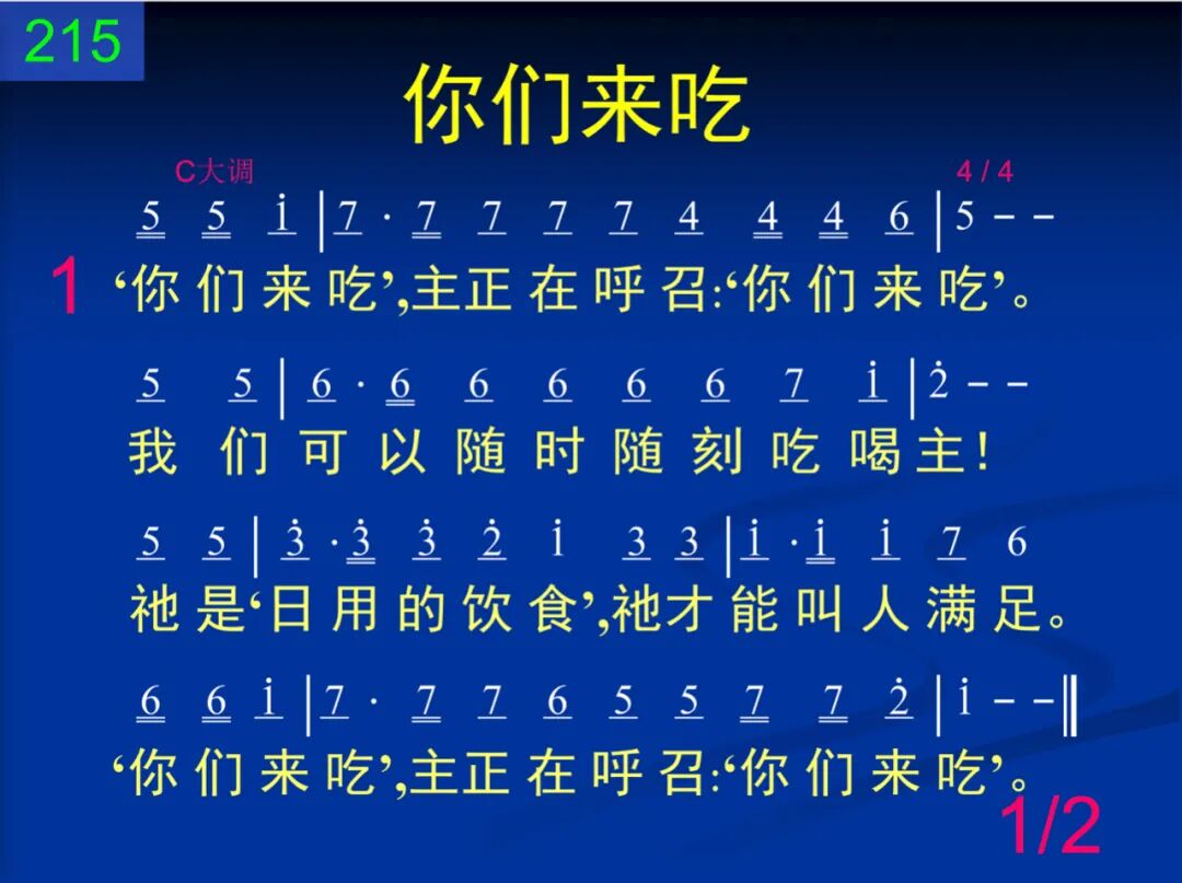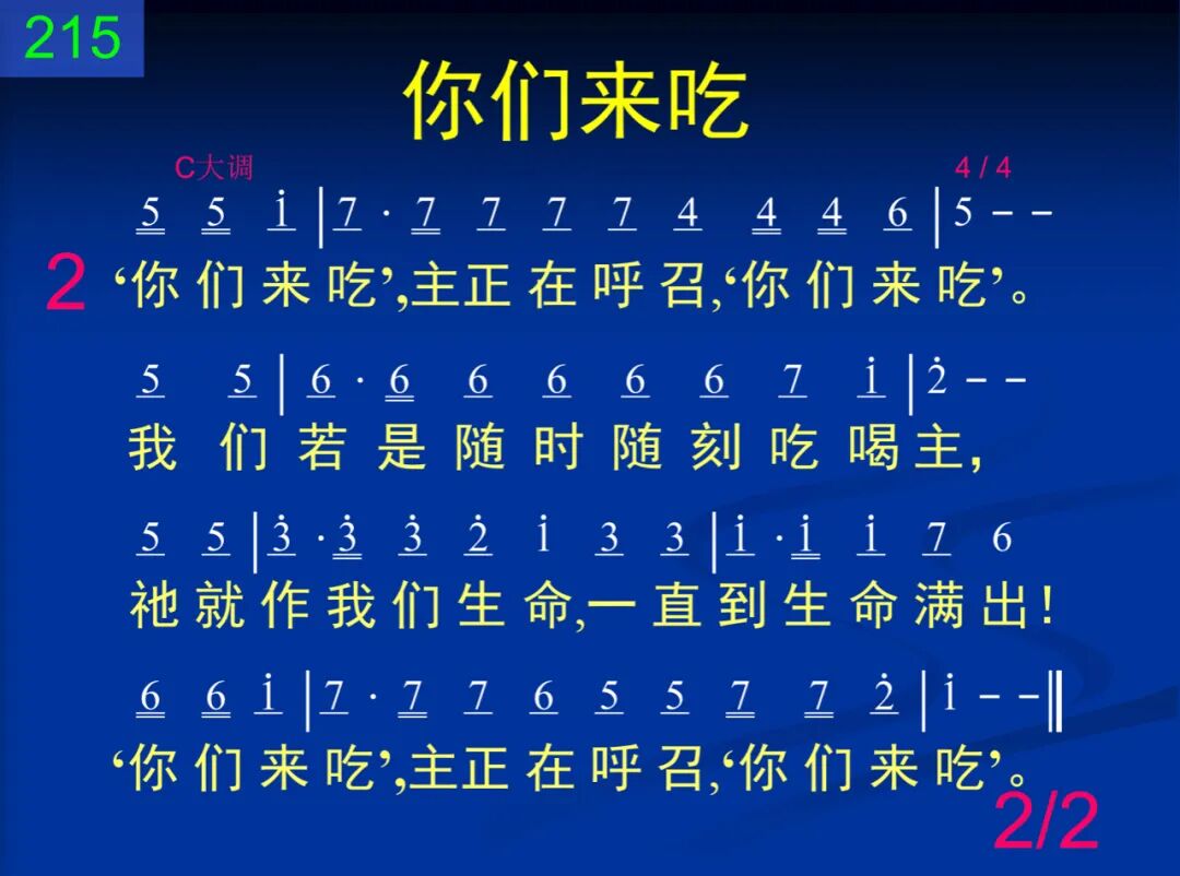 “你们来吃,”主正在呼召,“你们来吃。”我们可以随时随刻吃喝主!祂是“日用的饮食,”祂才能叫人满足。“你们来吃,”主正在呼召,“你们来吃。” 二 “你们来吃,”主正在呼召,“你们来吃。”我们若是随时随刻吃喝主,祂就作我们生命,一直到生命满出!“你们来吃,”主正在呼召,“你们来吃。”