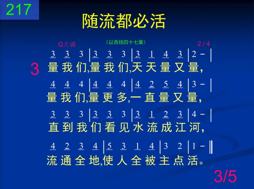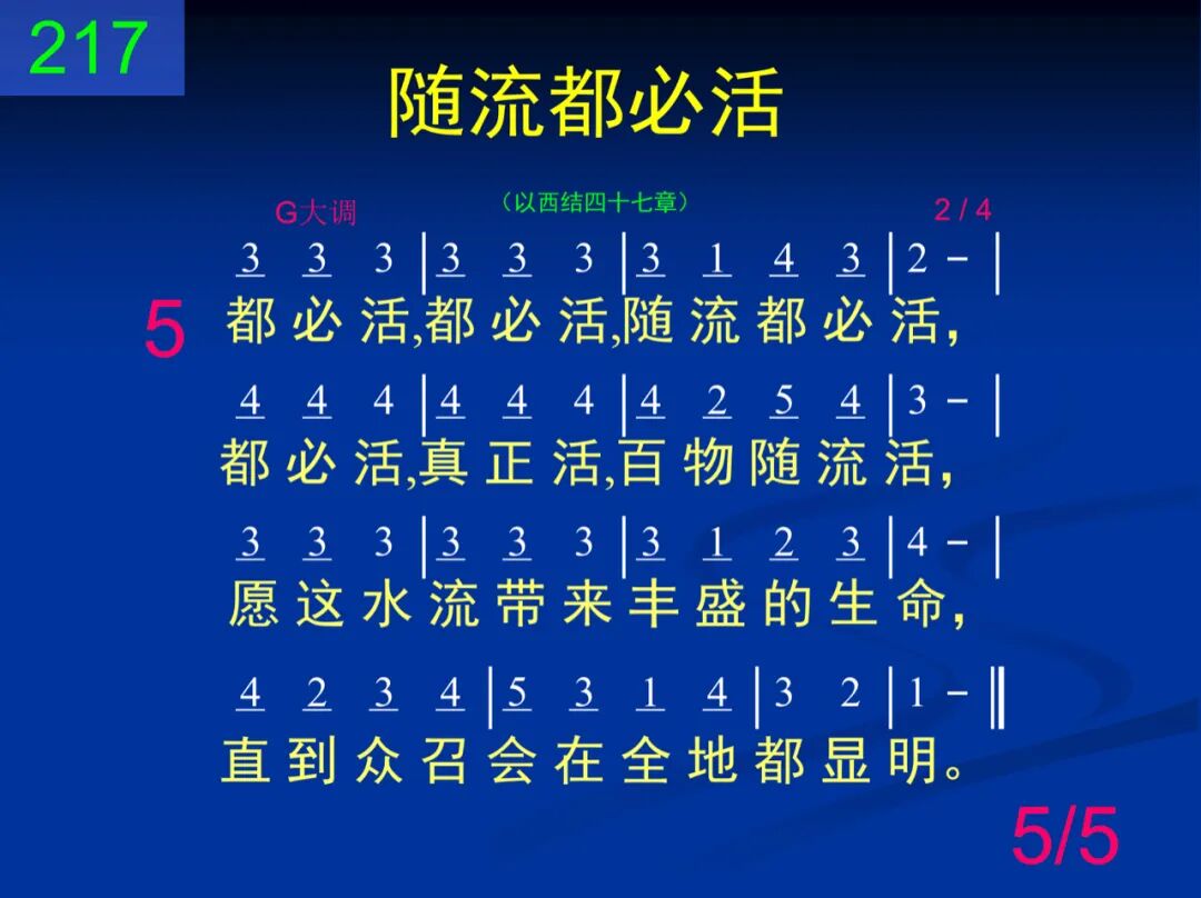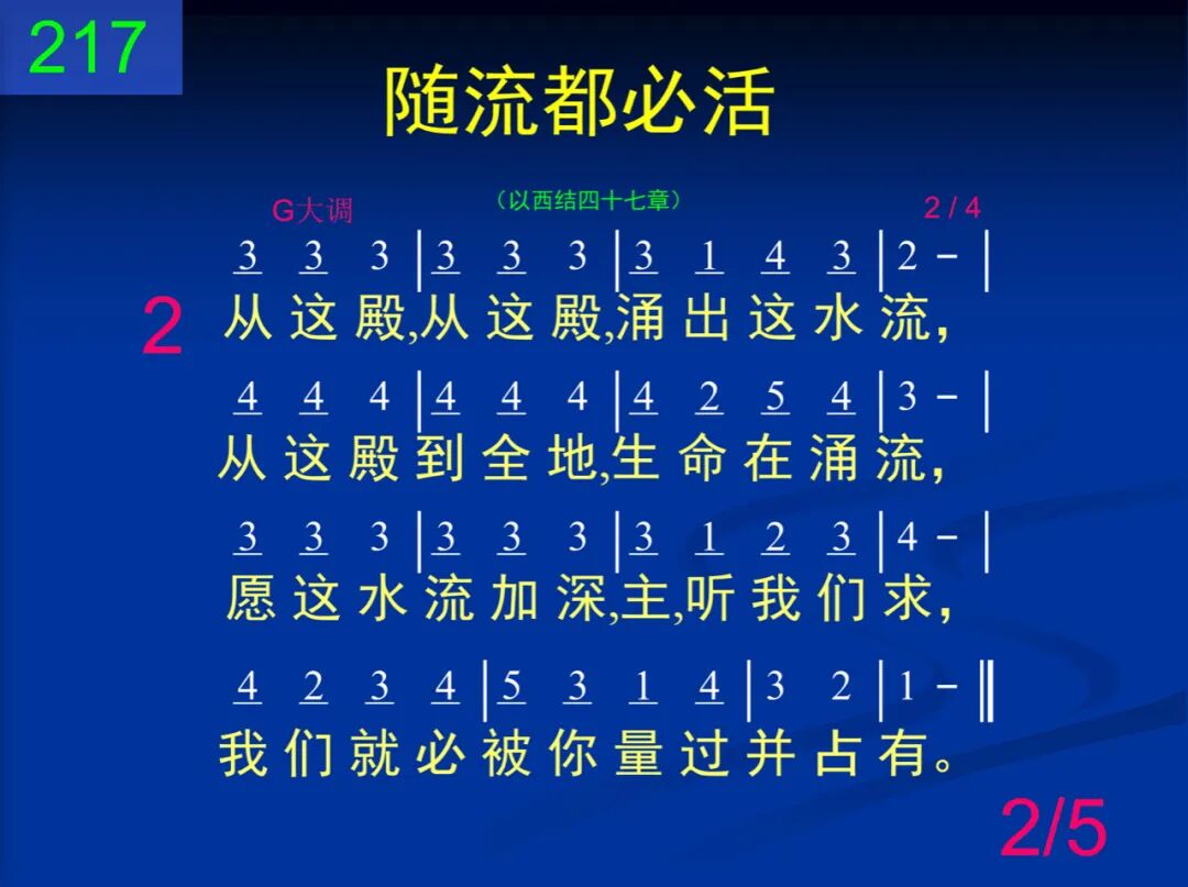 我们来,我们来,到神殿里来;我们来,从神殿有水流出来。这水流,在殿右,昼夜涌流着,滋润我们,结出生命的美果。 二 从这殿,从这殿,涌出这水流,从这殿到全地,生命在涌流,愿这水流加深,主,听我们求,我们就必被你量过并占有。 三 量我们,量我们,天天量又量,量我们,量更多,一直量又量,直到我们看见水流成江河,流通全地,使人全被主点活。 四 领我们,领我们,从水流经过,领我们从水流,经过再经过,水流一直涨高,成可洑的水,我们被浸透,永远享神恩惠。 五 都必活,都必活,随流都必活,都必活,真正活,百物随流活,愿这水流带来丰盛的生命,直到众召会在全地都显明。