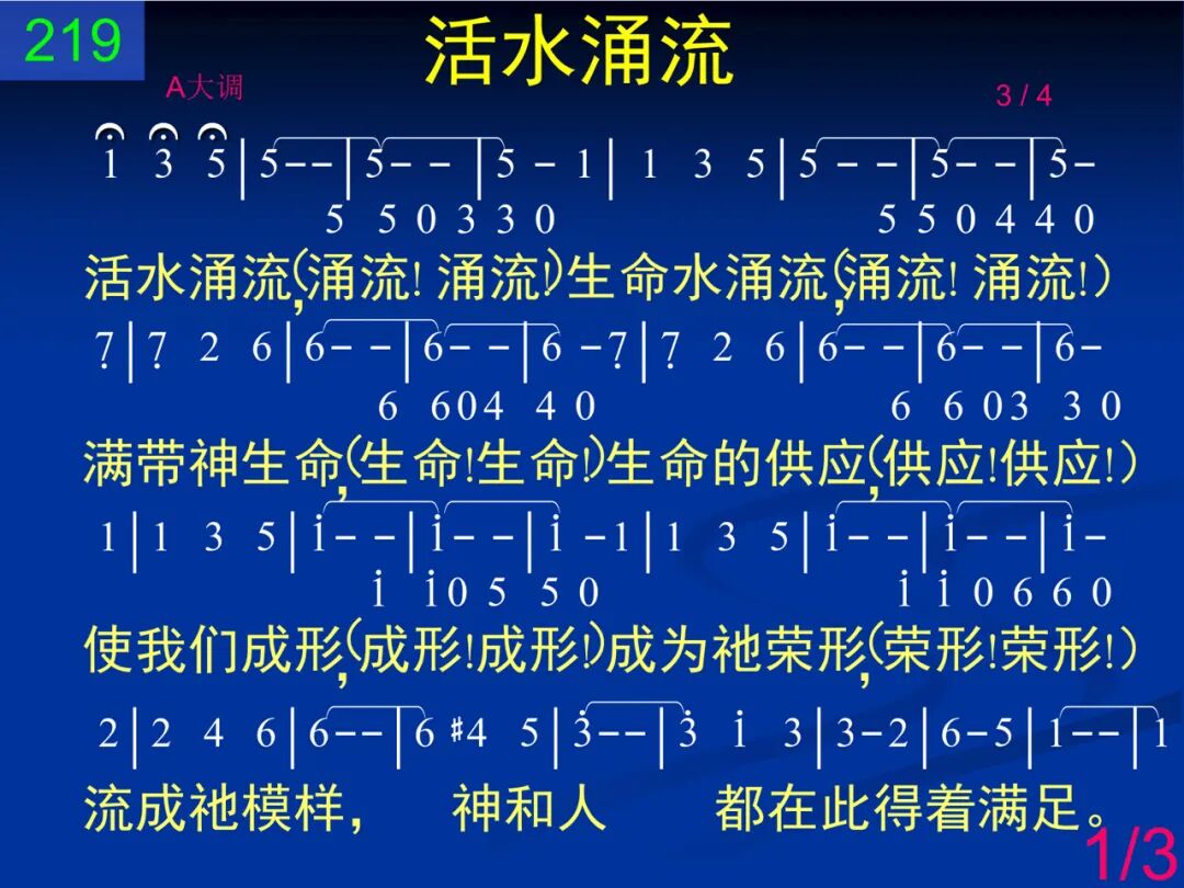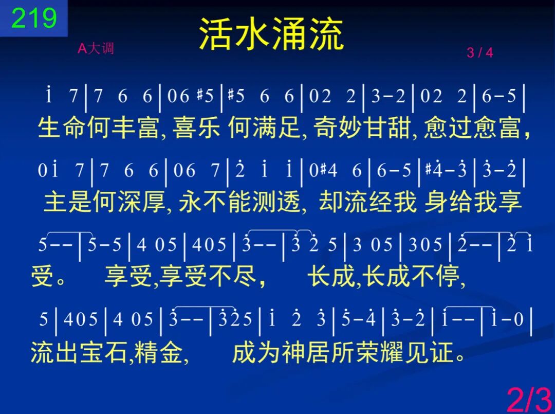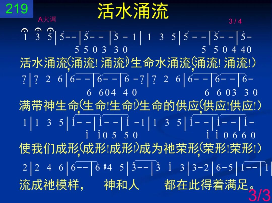 活水涌流,(涌流!涌流!)生命水涌流,(涌流!涌流!)满带神生命,(生命!生命!)生命的供应,(供应!供应!)使我们成形,(成形!成形!)成为祂荣形,(荣形!荣形!)流成祂模样,神和人都在此得着满足。生命何丰富,喜乐何满足,奇妙甘甜,越过越富,主是何深厚,永不能测透,却流经我身给我享受。