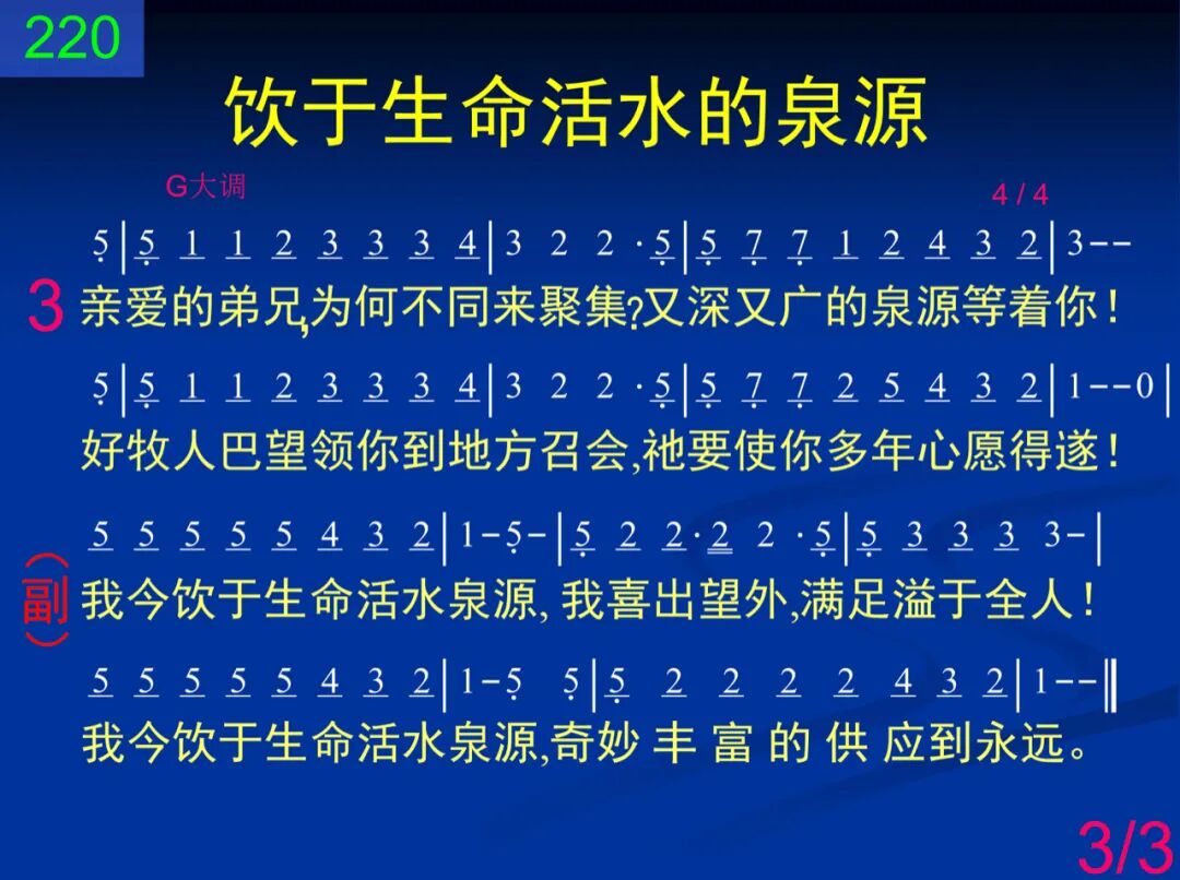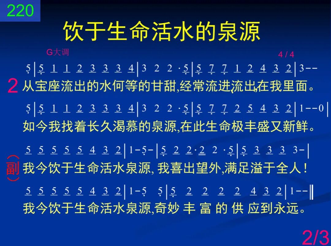 我曾经在巴比伦地干渴度日;始终无何能使我心满足。但有一天我来到蒙福的召会,我才找着那洋溢的活水。 我今饮于生命活水泉源,我喜出望外,满足溢于全人!我今饮于生命活水泉源,奇妙丰富的供应到永远。 二 从宝座流出的水何等的甘甜,经常流进、流出,在我里面。如今我找着长久渴慕的泉源,在此生命极丰盛又新鲜。 我今饮于生命活水泉源,我喜出望外,满足溢于全人!我今饮于生命活水泉源,奇妙丰富的供应到永远。 三 亲爱的弟兄,为何不同来聚集?又深又广的泉源等着你!好牧人巴望领你到地方召会,祂要使你多年心愿得遂! 我今饮于生命活水泉源,我喜出望外,满足溢于全人!我今饮于生命活水泉源,奇妙丰富的供应到永远。