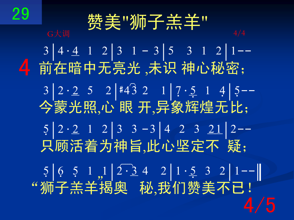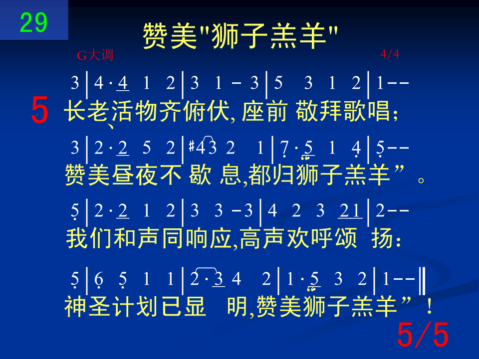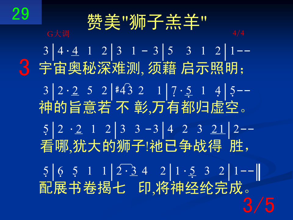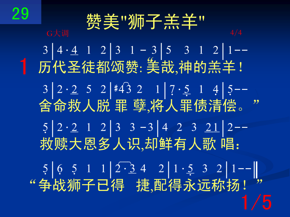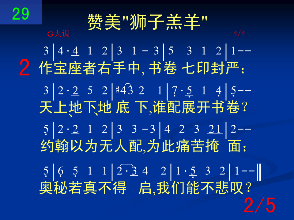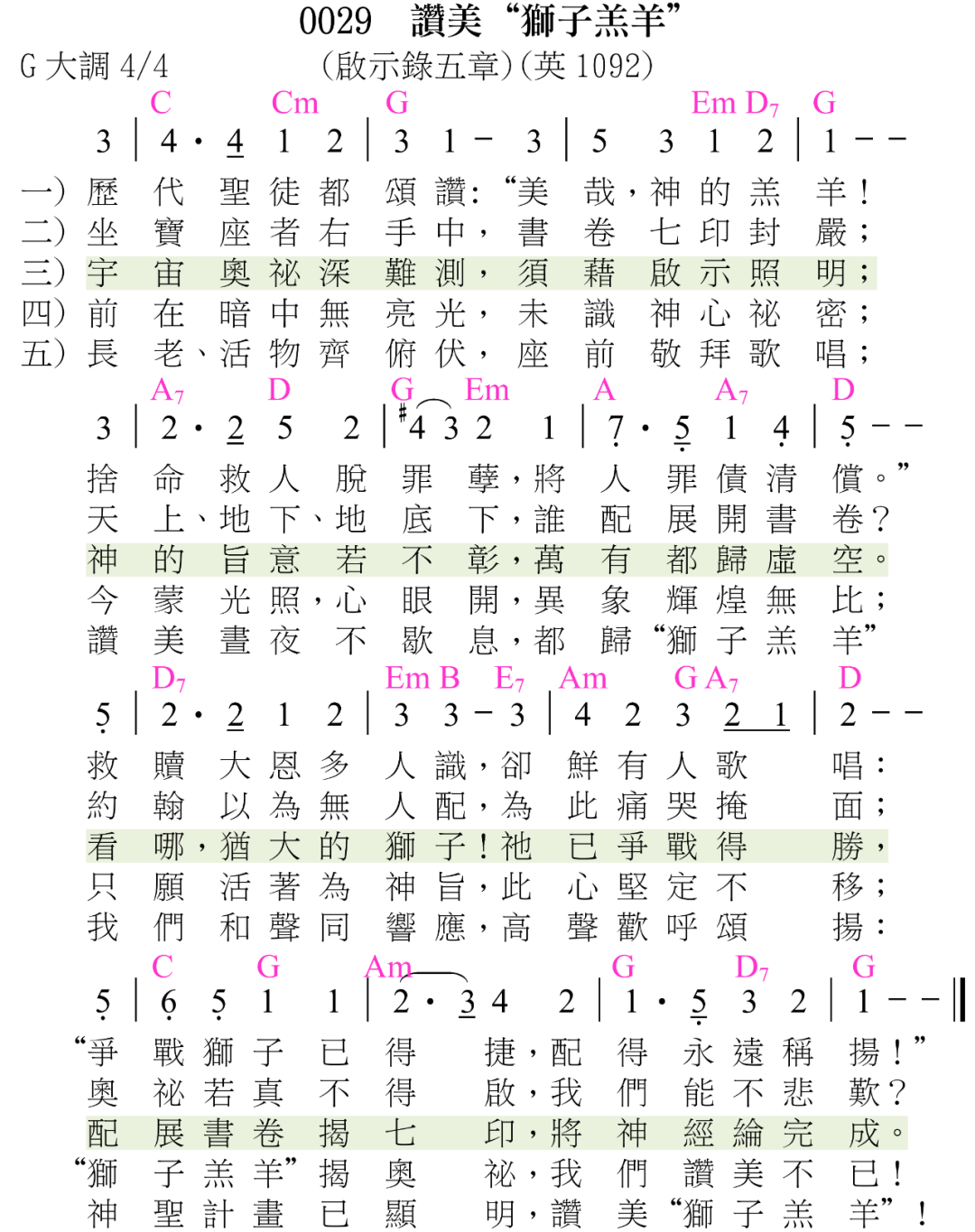历代圣徒都颂赞:“美哉,神的羔羊!舍命救人脱罪孽,将人罪债清偿。”救赎大恩多人识,却鲜有人歌唱:“争战狮子已得捷,配得永远称扬!” 二 作宝座者右手中,书卷七印封严;天上、地下、地底下,谁配展开书卷?约翰以为无人配,为此痛苦掩面;奥秘若真不得启,我们能不悲叹? 三 宇宙奥秘深难测,须藉启示照明;神的旨意若不彰,万有都归虚空。看哪,犹大的狮子!祂已争战得胜,配展书卷揭七印,将神经纶完成。 四 前在暗中无亮光,未识神心秘密;今蒙光照,心眼开,异象辉煌无比;只顾活着为神旨,此心坚定不疑;“狮子羔羊”揭奥秘,我们赞美不已! 五 长老、活物齐俯伏,座前敬拜歌唱;赞美昼夜不歇息,都归“狮子羔羊”。我们和声同响应,高声欢呼颂扬:神计划已显明,赞美“狮子羔羊”!