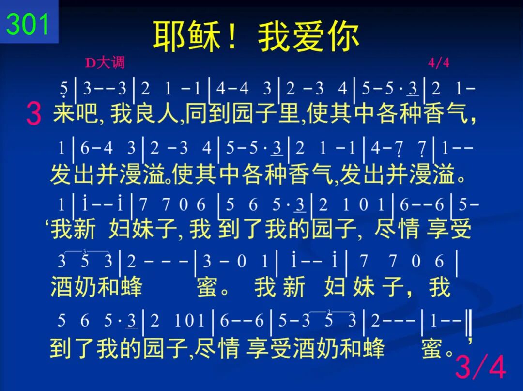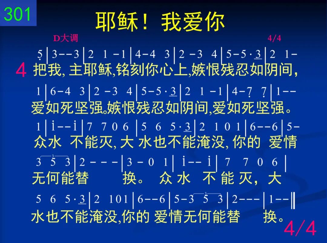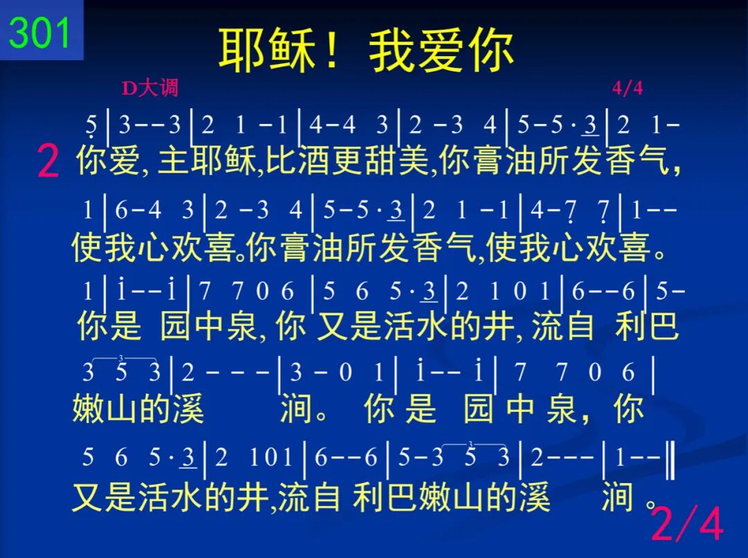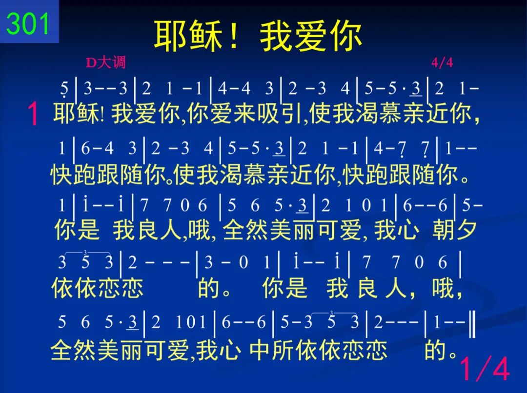 耶稣!我爱你,你爱来吸引,使我渴慕亲近你,快跑跟随你。使我渴慕亲近你,快跑跟随你。你是我良人,哦,全然美丽可爱,我心朝夕依依恋恋的。你是我良人,哦,全然美丽可爱,我心中所依依恋恋的。 二 你爱,主耶稣,比酒更甜美,你膏油所发香气,使我心欢喜。你膏油所发香气,使我心欢喜。你是园中泉,你又是活水的井,流自利巴嫩山的溪涧。你是园中泉,你又是活水的井,流自利巴嫩山的溪涧。 三 来吧,我良人,同到园子里,使其中各种香气,发出并漫溢。使其中各种香气,发出并漫溢。“我新妇妹子,我到了我的园子,尽情享受酒奶和蜂蜜。我新妇妹子,我到了我的园子,尽情享受酒奶和蜂蜜。” 四 把我,主耶稣,铭刻你心上,嫉恨残忍如阴间,爱如死坚强。嫉恨残忍如阴间,爱如死坚强。众水不能灭,大水也不能淹没,你的爱情无何能替换。众水不能灭,大水也不能淹没,你的爱情无何能替换。