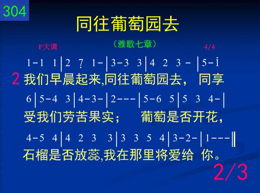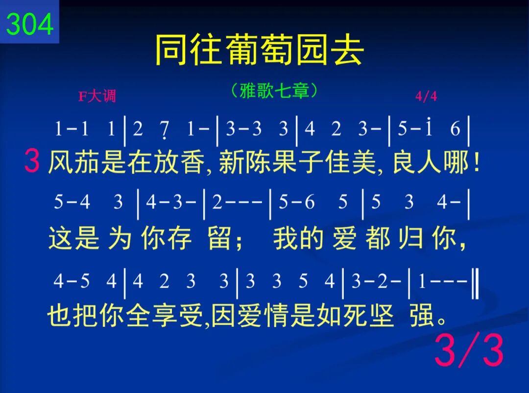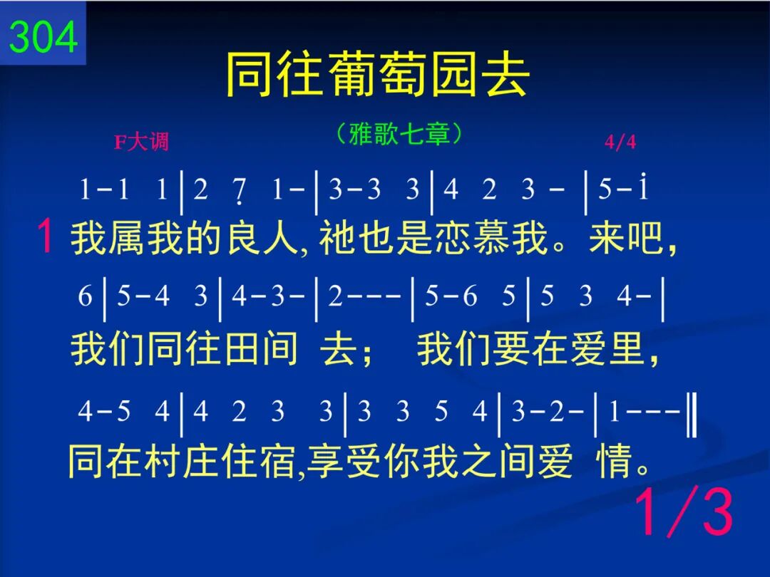 我属我的良人,祂也是恋慕我。来吧,我们同往田间去;我们要在爱里,同在村庄住宿,享受你我之间爱情。 二 我们早晨起来,同往葡萄园去,同享受我们劳苦果实;葡萄是否开花,石榴是否放蕊,我在那里将爱给你。 三 风茄是在放香,新陈果子佳美,良人哪!这是为你存留;我的爱都归你,也把你全享受,因爱情是如死坚强。