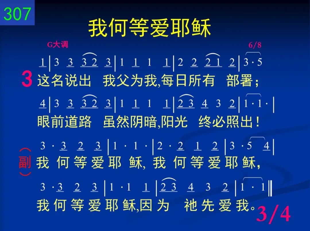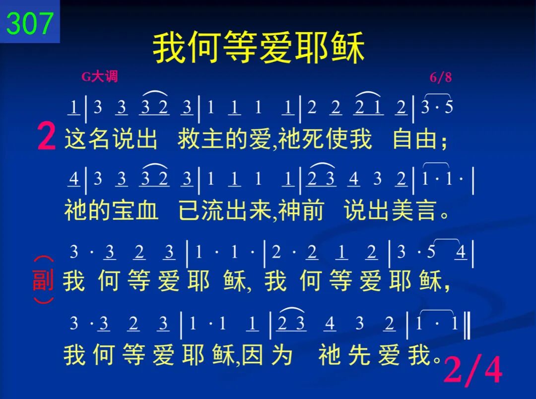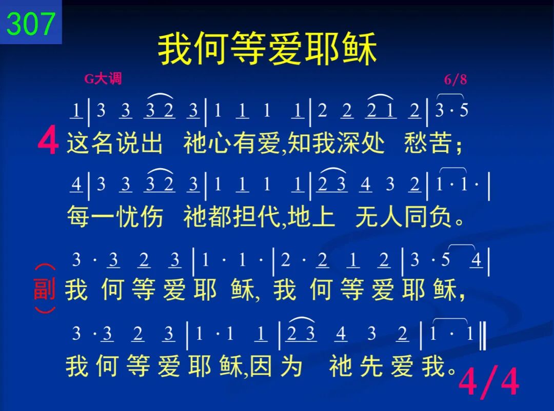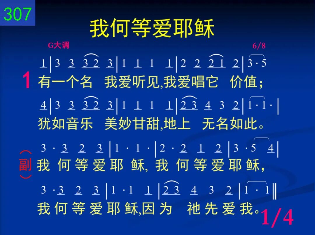 有一个名我爱听见,我爱唱它价值;犹如音乐美妙甘甜,地上无名如此。 我何等爱耶稣,我何等爱耶稣,我何等爱耶稣,因为祂先爱我。 二 这名说出救主的爱,祂死使我自由;祂的宝血已流出来,神前说出美言。 我何等爱耶稣,我何等爱耶稣,我何等爱耶稣,因为祂先爱我。 三 这名说出我父为我,每日所有部署;眼前道路虽然阴暗,阳光终必照出! 我何等爱耶稣,我何等爱耶稣,我何等爱耶稣,因为祂先爱我。 四 这名说出祂心有爱,知我深处愁苦;每一忧伤祂都担代,地上无人同负。 我何等爱耶稣,我何等爱耶稣,我何等爱耶稣,因为祂先爱我。