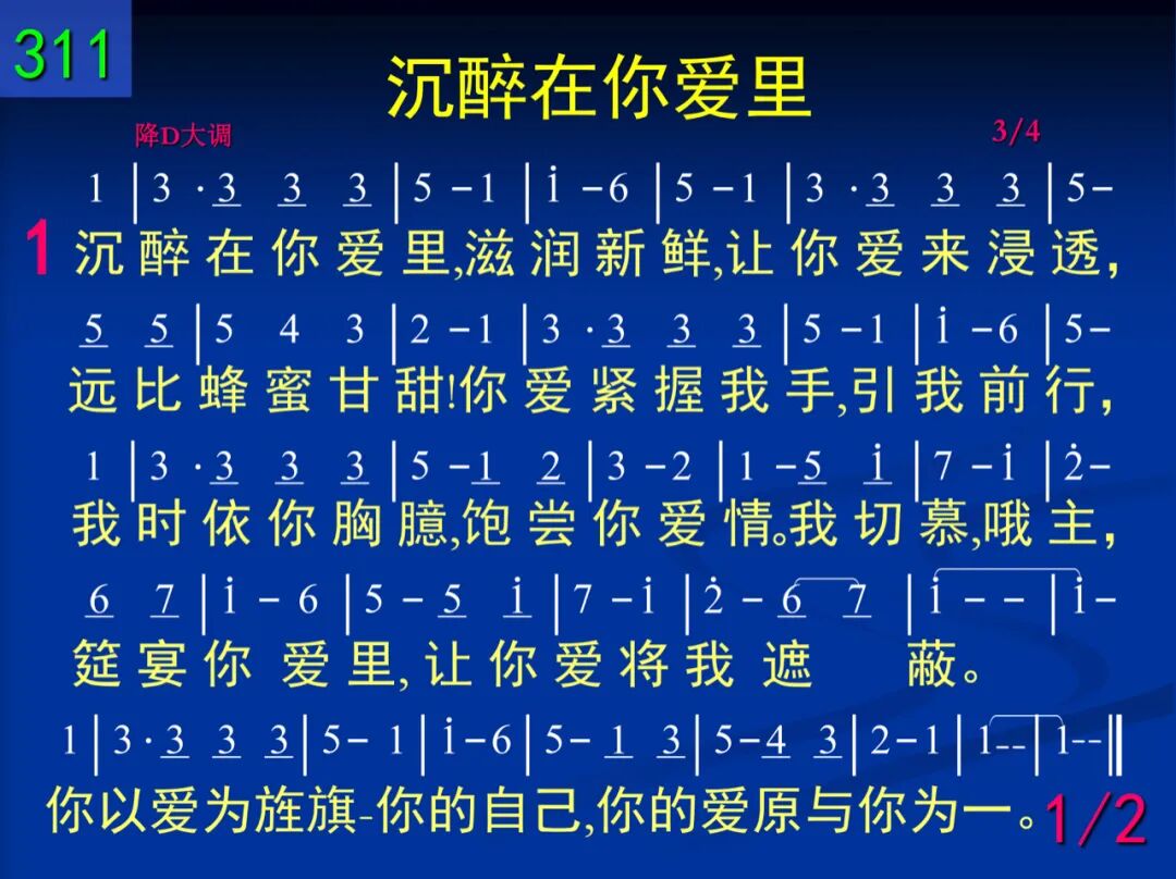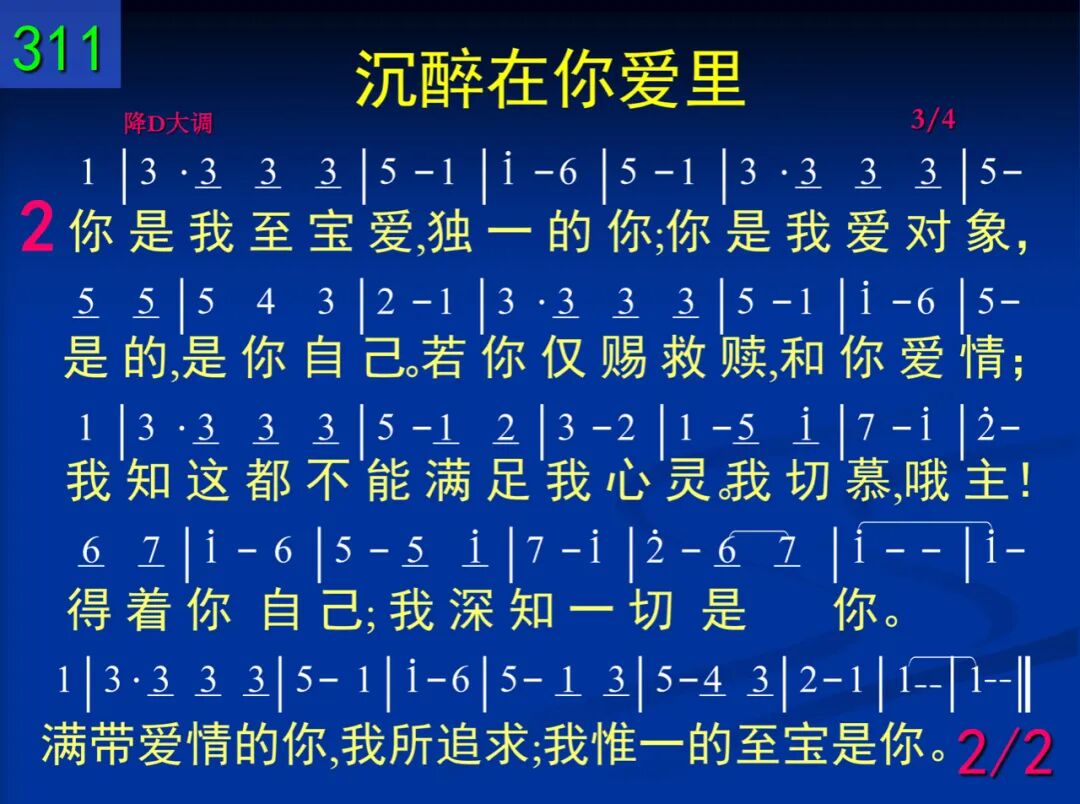 沉醉在你爱里,滋润新鲜,让你爱来浸透,远比蜂蜜甘甜!你爱紧握我手,引我前行,我时依你胸臆,饱尝你爱情。我切慕,哦主,筵宴你爱里,让你爱将我遮蔽。你以爱为旌旗─你的自己,你的爱原与你为一。 二 你是我至宝爱,独一的你;你是我爱对象,是的,是你自己。若你仅赐救赎,和你爱情;你知这都不能满足我心灵。我切慕,哦主!得着你自己;我深知一切是你。满带爱情的你,我所追求;我惟一的至宝是你。