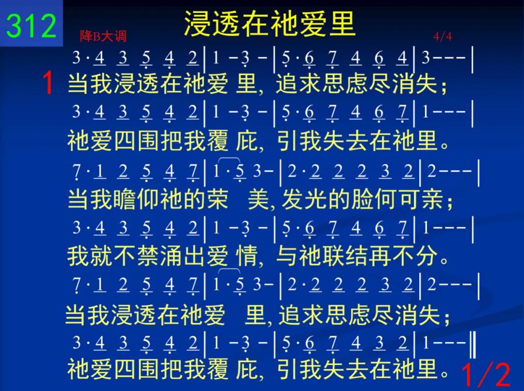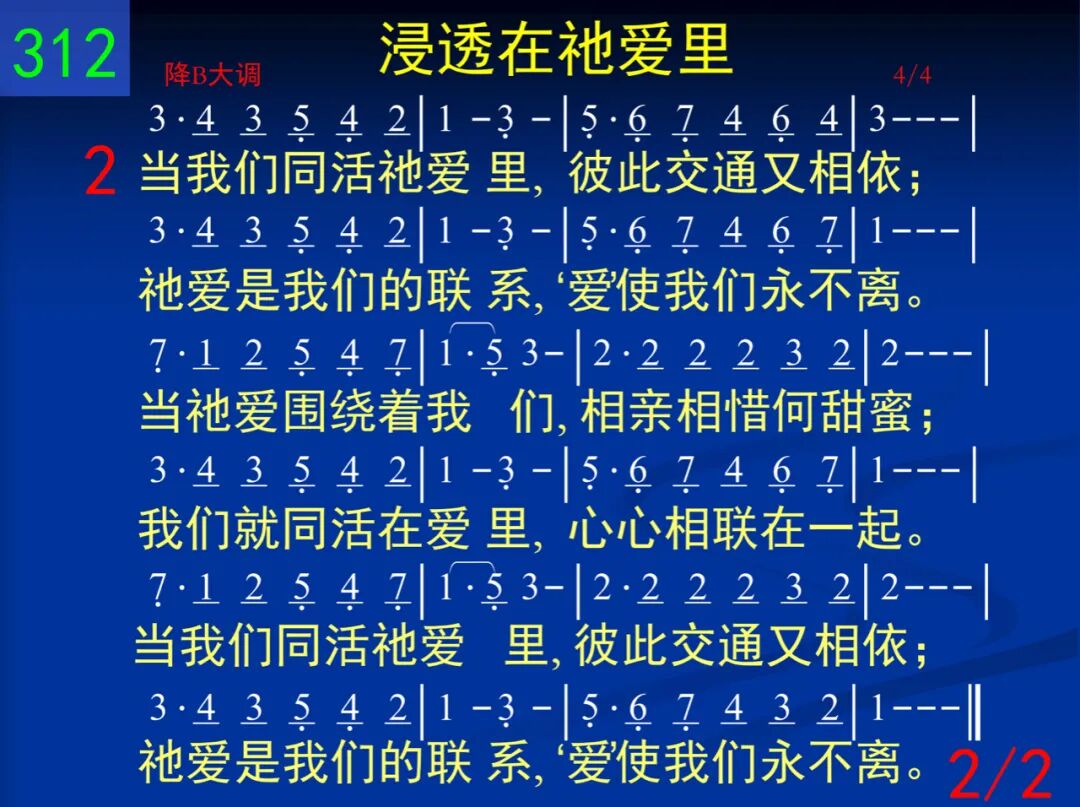 当我浸透在祂爱里,追求思虑尽消失;祂爱四围把我覆庇,引我失去在祂里。当我瞻仰祂的荣美,发光的脸何可亲;我就不禁涌出爱情,与祂联结再不分。当我浸透在祂爱里,追求思虑尽消失;祂爱四围把我覆庇,引我失去在祂里。 二 当我们同活祂爱里,彼此交通又相依;祂爱是我们的联系,“爱”使我们永不离。当祂爱围绕着我们,相亲相惜何甜蜜;我们就同活在爱里,心心相联在一起。当我们同活在祂爱里,彼此交通又相依;祂爱是我们的联系,“爱”使我们永不离。