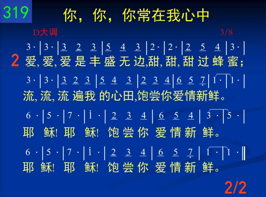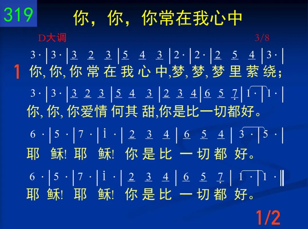 你,你,你常在我心中,梦,梦,梦里萦绕;你,你,你爱情何其甜,你是比一切都好。耶稣!耶稣!你是比一切都好。耶稣!耶稣!你是比一切都好。 二 爱,爱,爱是丰盛无边,甜,甜,甜过蜂蜜;流,流,流遍我的心田,饱尝你爱情新鲜。耶稣!耶稣!饱尝你爱情新鲜。耶稣!耶稣!饱尝你爱情新鲜。