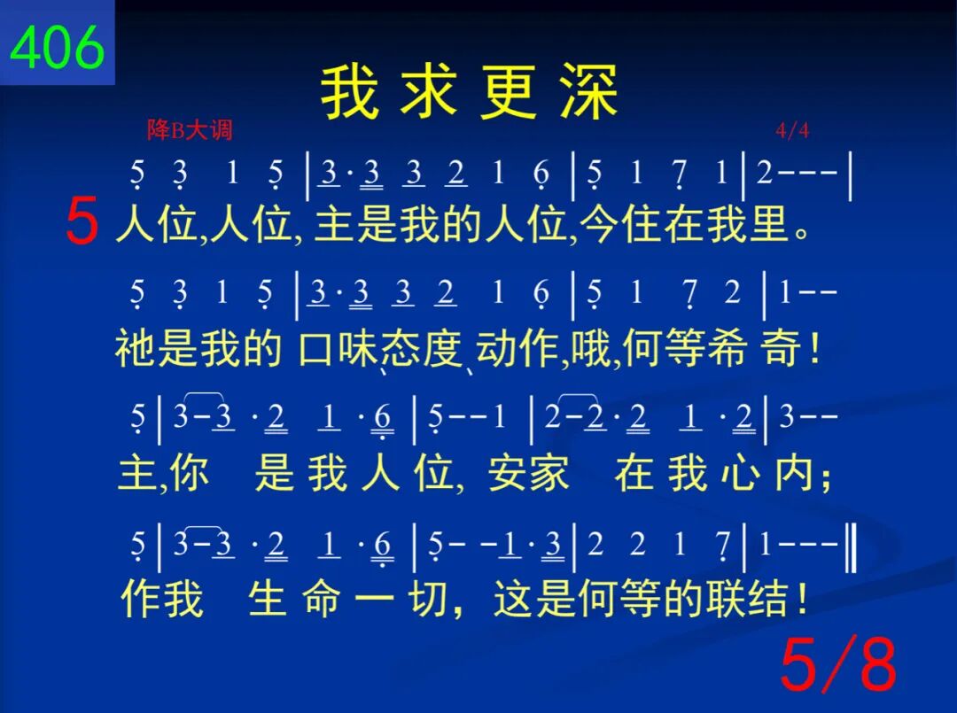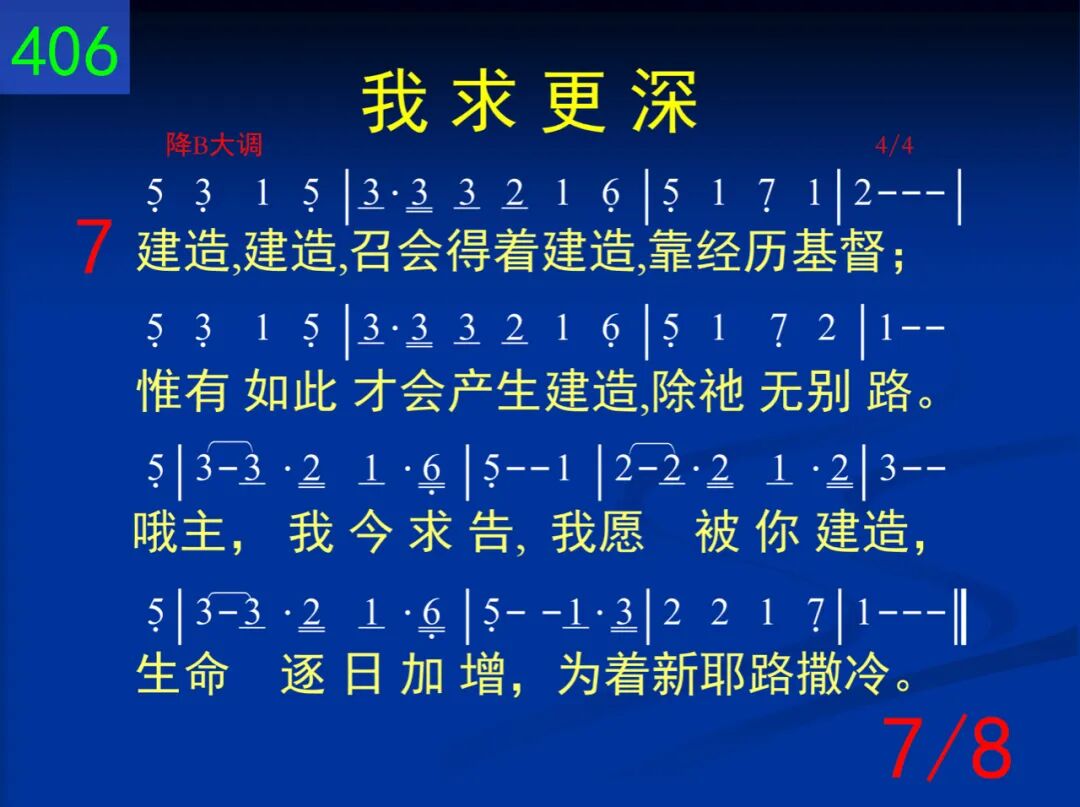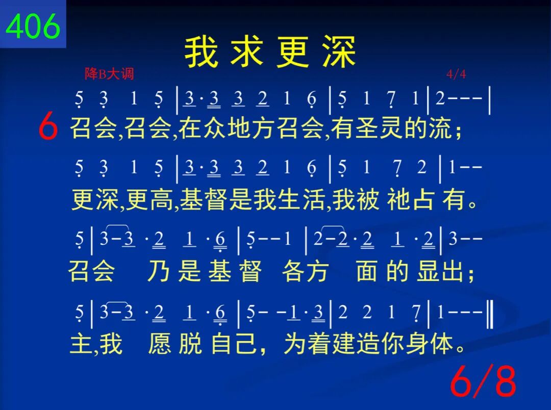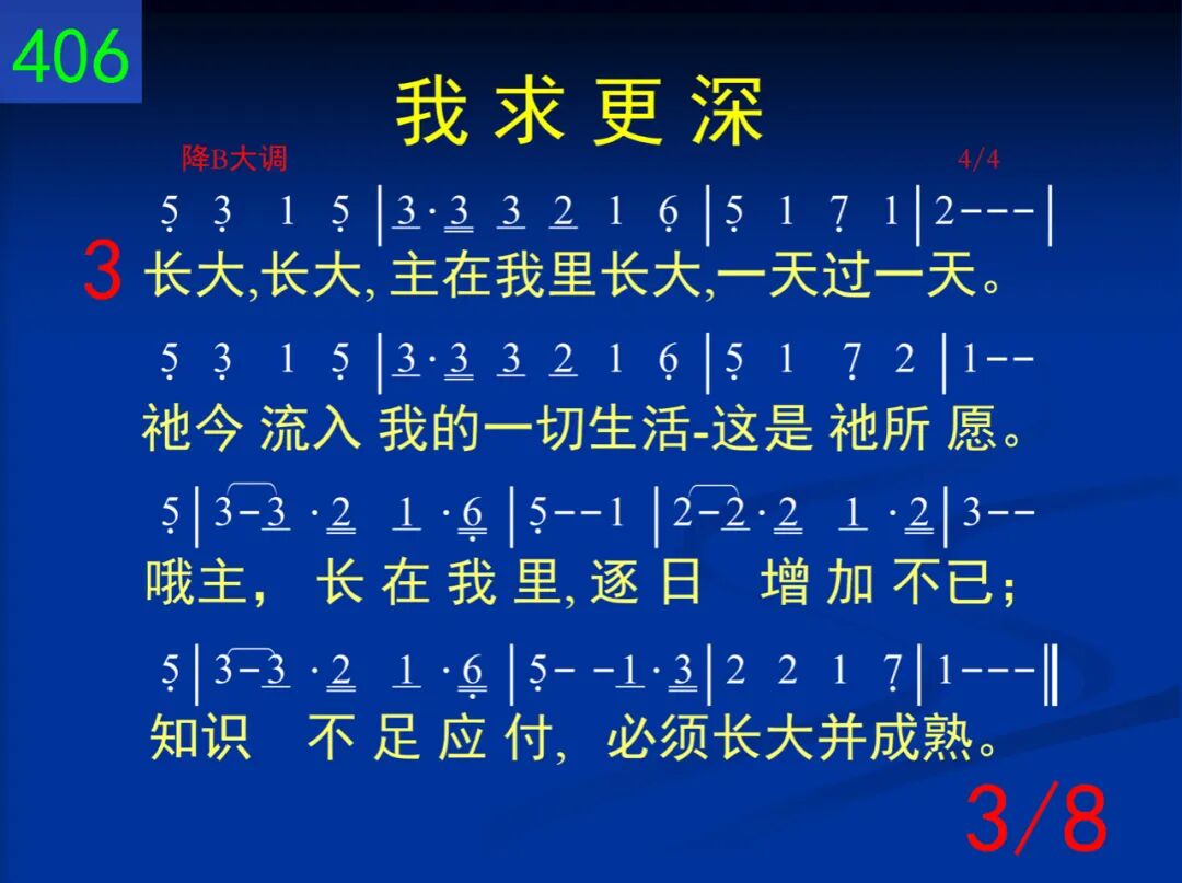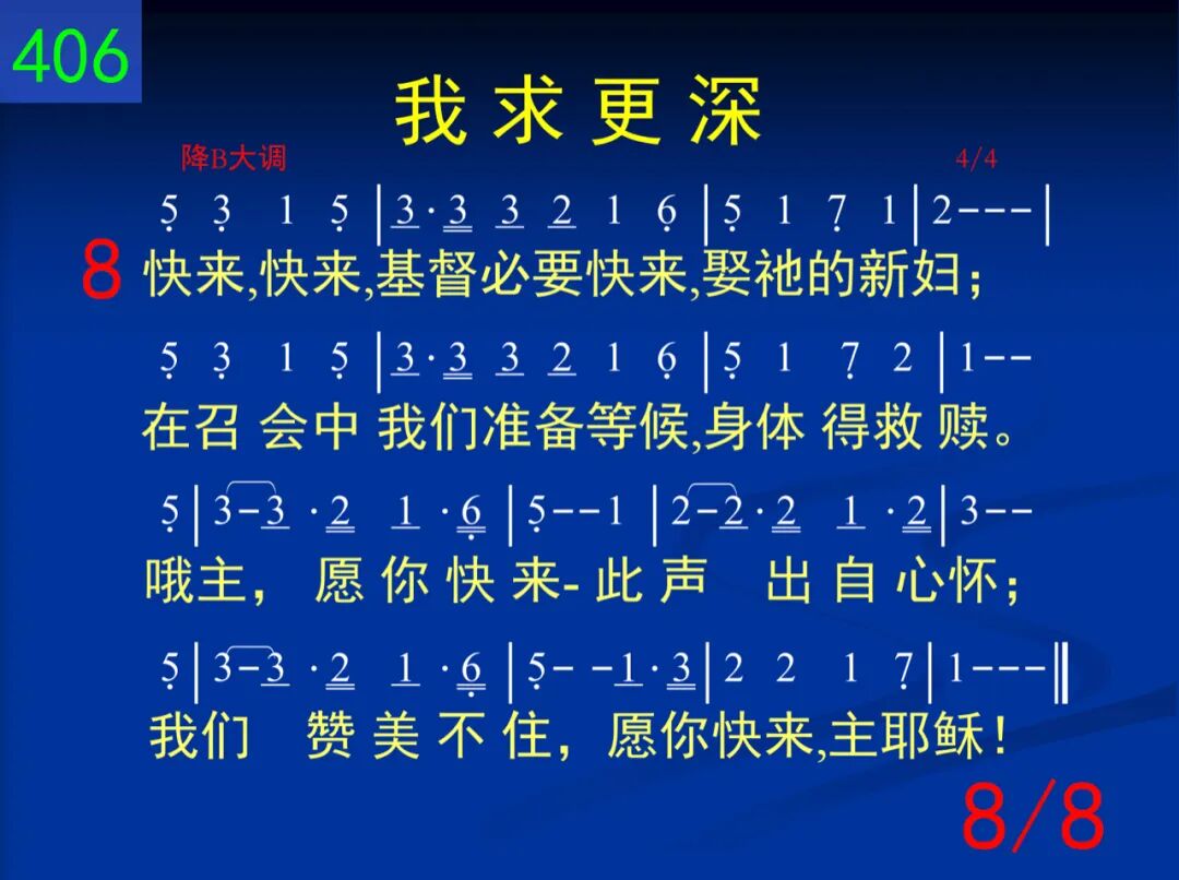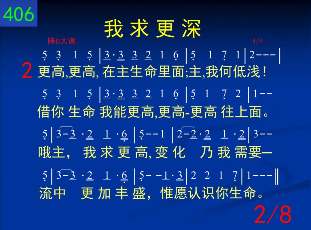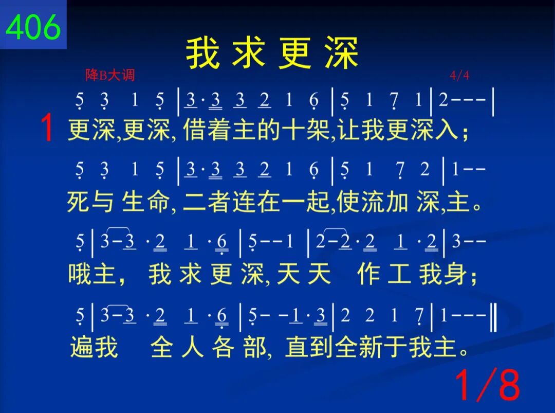 更深,更深,藉着主的十架,让我更深入;死与生命,二者连在一起,使流加深,主。哦主,我求更深,天天作工我身;遍我全人各部,直到全新于我主。 二 更高,更高,在主生命里面;主,我何低浅!藉你生命我能更高,更高─更高往上面。哦主,我求更高,变化乃我需要─流中更加丰盛,惟愿认识你生命。 三 长大,长大,主在我里长大,一天过一天。祂今流入我的一切生活─这是祂所愿。哦主,长在我里,逐日增加不已;知识不足应付,必须长大并成熟。 四 生活,生活,基督是我生活,祂实际无限!小事,大事,任何事,一切事─祂都在里面。每日活出基督,时刻将祂流露,祂名你当呼求,为得基督献所有。 五 人位,人位,主是我的人位,今住在我里。祂是我的口味,态度,动作,哦,何等希奇!主,你是我人位,安家在我心内;作我生命一切,这是何等的联结! 六 召会,召会,在众地方召会,有圣灵的流;更深,更高,基督是我生活,我被祂占有。召会乃是基督各方面的显出;主,我愿脱自己,为着建造你身体。 七 建造,建造,召会得着建造,靠经历基督;惟有如此才会产生建造,除祂无别路。哦主,我今求告,我愿被你建造,生命逐日加增,为着新耶路撒冷。 八 快来,快来,基督必要快来,娶祂的新妇;在召会中我们准备等候,身体得救赎。哦主,愿你快来─此声出自心怀;我们赞美不住,愿你快来,主耶稣!