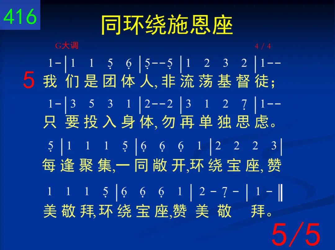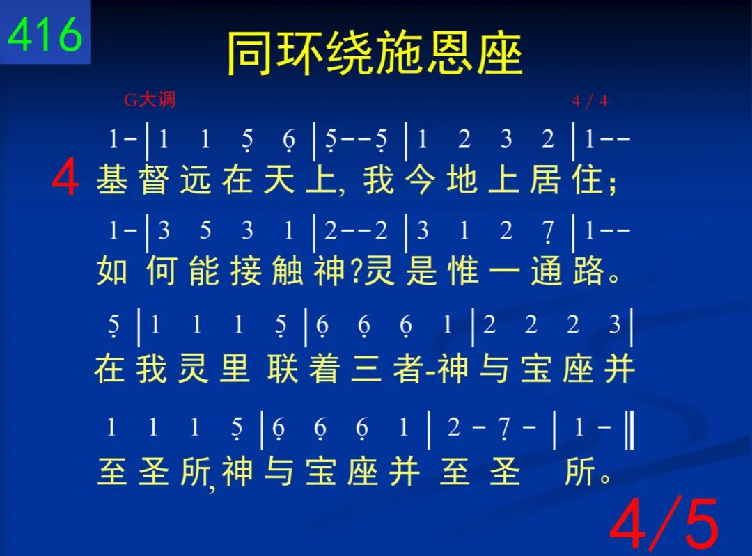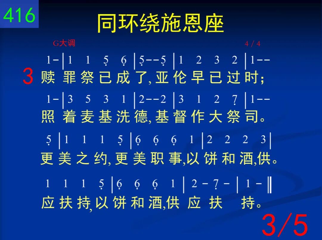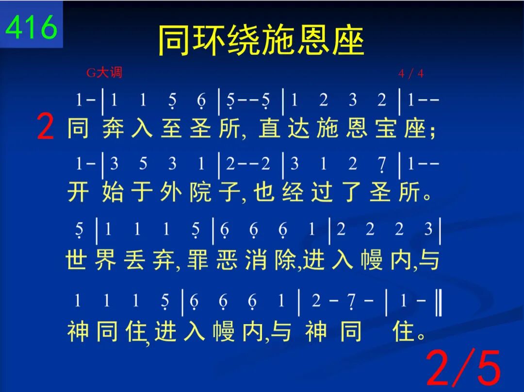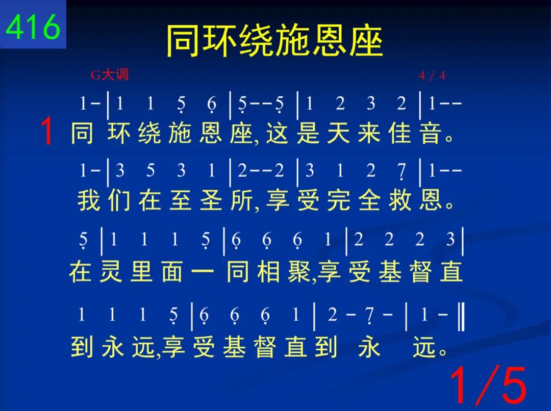 同环绕施恩座,这是天来佳音。我们在至圣所,享受完全救恩。在灵里面一同相聚,享受基督直到永远,享受基督直到永远。 二 同奔入至圣所,直达施恩宝座;开始于外院子,也经过了圣所。世界丢弃,罪恶消除,进入幔内,与神同住,进入幔内,与神同住。 三 赎罪祭已成了,亚伦早已过时;照着麦基洗德,基督作大祭司。更美之约,更美职事,以饼和酒,供应扶持,以饼和酒,供应扶持。 四 基督远在天上,我今地上居住;如何能接触神?灵是惟一通路。在我灵里联着三者─神与宝座并至圣所,神与宝座并至圣所。 五 我们是团体人,非流荡基督徒;只要投入身体,勿再单独思虑。每逢聚集,一同敞开,环绕宝座,赞美敬拜,环绕宝座,赞美敬拜。