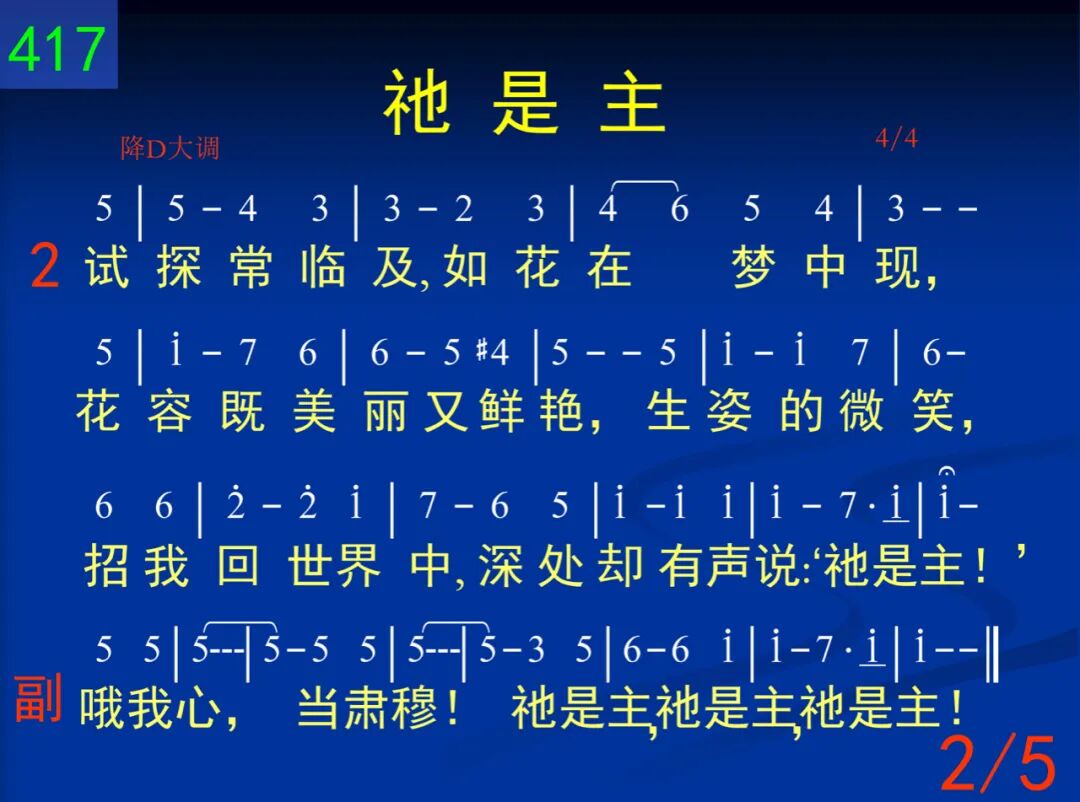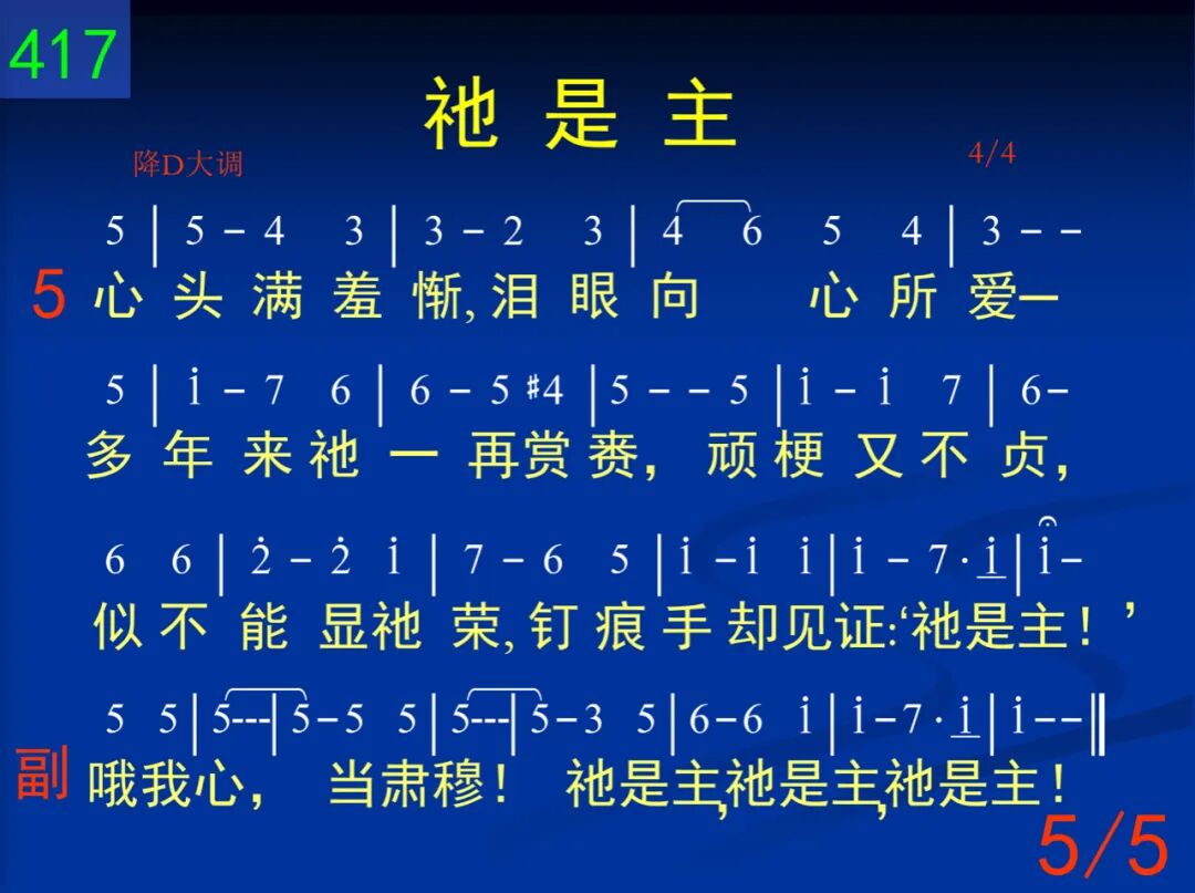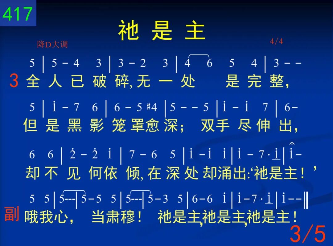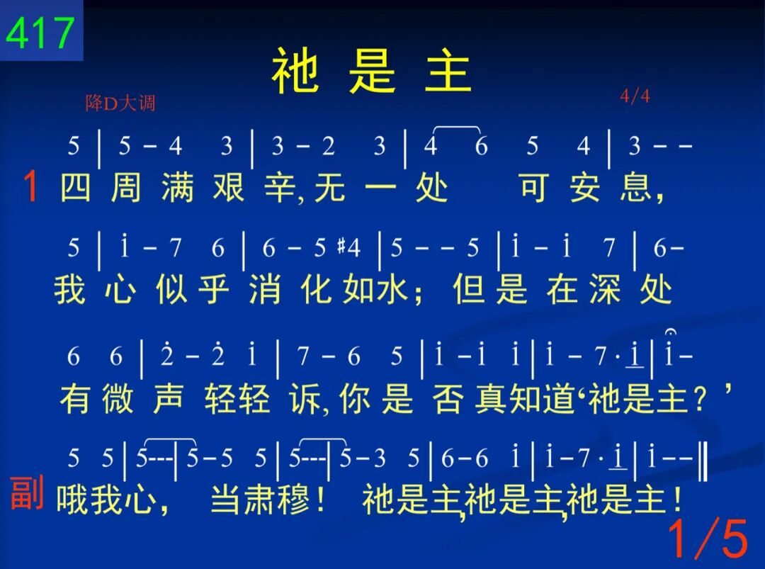 四周满艰辛,无一处可安息,我心似乎消化如水;但是在深处有微声轻轻诉,你是否真知道“祂是主”? 哦我心,当肃穆!祂是主,祂是主,祂是主! 二 试探常临及,如花在梦中现,花容既美丽又鲜艳,生姿的微笑,招我回世界中,深处却有声说:“祂是主!” 哦我心,当肃穆!祂是主,祂是主,祂是主! 三 全人已破碎,无一处是完整,但是黑影笼罩愈深;双手尽伸出,却不见何依倾,在深处却涌出:“祂是主!” 哦我心,当肃穆!祂是主,祂是主,祂是主! 四 雄心和壮志,皆已随风而去,祂所给苦刺似过重;轻声问我主,是否已被你弃,却听祂爱中说:“我是主!” 哦我心,当肃穆!祂是主,祂是主,祂是主! 五 心头满羞惭,泪眼向心所爱─多年来祂一再赏赉,顽梗又不贞,似不能显祂荣,钉痕手却见证:“祂是主!” 哦我心,当肃穆!祂是主,祂是主,祂是主!