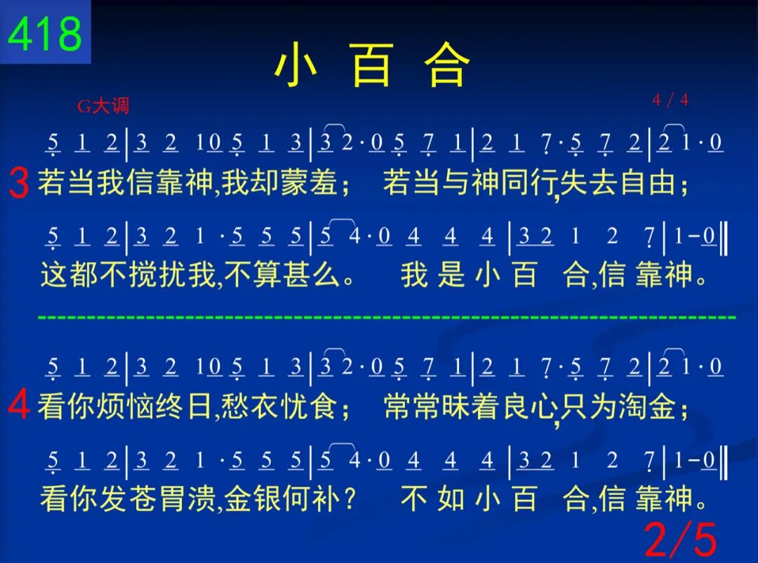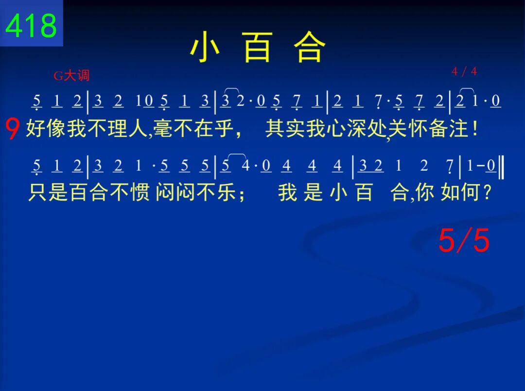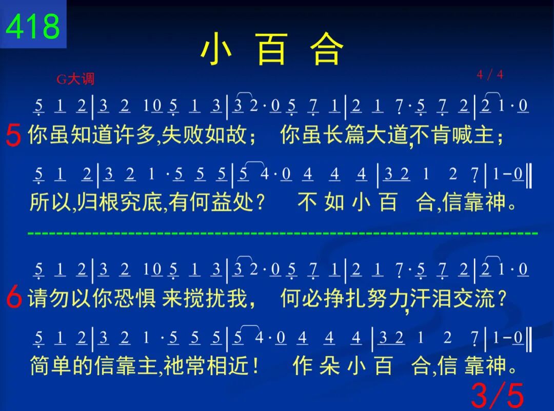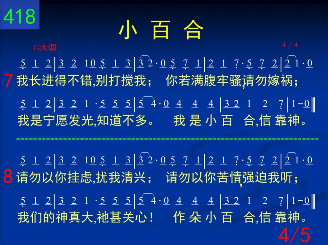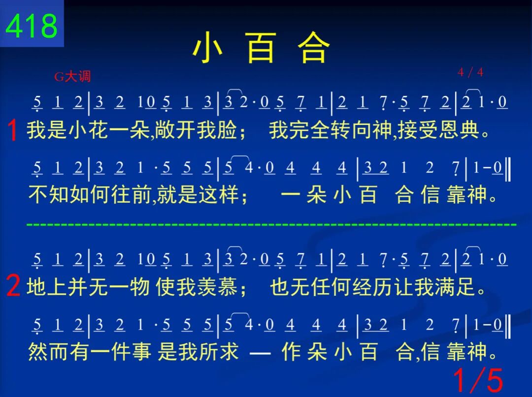 我是小花一朵,敞开我脸;我完全转向神,接受恩典。不知如何往前,就是这样;一朵小百合信靠神。 二 地上并无一物使我羡慕;也无任何经历让我满足。然而有一件事是我所求─作朵小百合,信靠神。 三 若当我信靠神,我却蒙羞;若当与神同行,失去自由;这都不搅扰我,不算什么。我是小百合,信靠神。 四 看你烦恼终日,愁衣忧食;常常昧着良心,只为淘金;看你发苍胃溃,金银何补?不如小百合,信靠神。 五 你虽知道许多,失败如故;你虽长篇大道,不肯喊主;所以,归根究底,有何益处?不如小百合,信靠神。 六 请勿以恐惧来搅扰我,何必挣扎努力,汗泪交流?简单的信靠主,祂常相近!作朵小百合,信靠神。 七 我长进得不错,别打搅我;你若满腹牢骚,请勿嫁祸;我是宁愿发光,知道不多。我是小百合,信靠神。 八 请勿以你挂虑,扰我清兴;请勿以你苦情,强迫我听;我们的神真大,祂甚关心!作朵小百合,信靠神。 九 好像我不理人,毫不在乎,其实我心深处,关怀备注!只是百合不惯闷闷不乐;我是小百合,你如何?