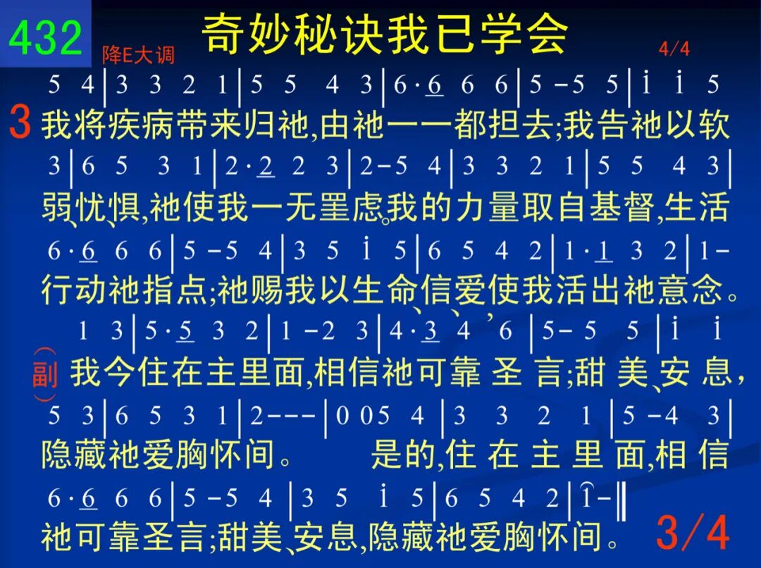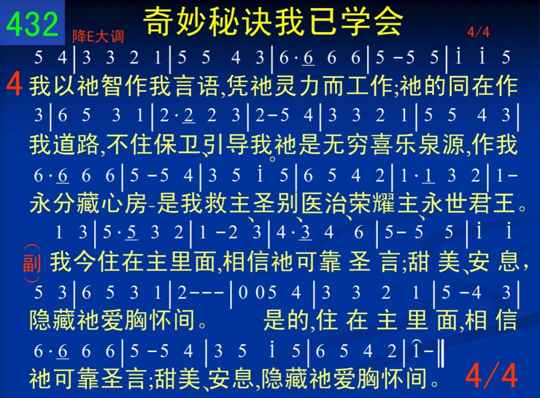 奇妙秘诀我已学会,就是住在主里面;在此畅饮生命纯泉,日日饱尝祂圣言。在祂有能宝血底下,我得加力享肥甘;败坏的“己”日渐消逝,当我浸没祂里面。 我今住在主里面,相信祂可靠圣言;甜美、安息,隐藏祂爱胸怀间。是的,住在主里面,相信祂可靠圣言;甜美、安息,隐藏祂爱胸怀间。 二 我与基督已经同钉,祂今与我同生活;我已停下一切挣扎,今是祂,不再是我。当我意志降服于祂,祂灵掌权我心内;祂的救赎、拯救有能,使我洁净并脱罪。 我今住在主里面,相信祂可靠圣言;甜美、安息,隐藏祂爱胸怀间。是的,住在主里面,相信祂可靠圣言;甜美、安息,隐藏祂爱胸怀间。 三 我将疾病带来归祂,由祂一一都担去;我告祂以软弱、忧、惧,祂使我一无罣虑。我的力量取自基督,生活行动祂指点;祂赐我以生命、信、爱,使我活出祂意念。 我今住在主里面,相信祂可靠圣言;甜美、安息,隐藏祂爱胸怀间。是的,住在主里面,相信祂可靠圣言;甜美、安息,隐藏祂爱胸怀间。 四 我以祂智作我言语,凭祂灵力而工作;祂的同在作我道路,不住保卫、引导我。祂是无穷喜乐泉源,作我永分藏心房─是我救主、圣别、医治、荣耀主、永世君王。 我今住在主里面,相信祂可靠圣言;甜美、安息,隐藏祂爱胸怀间。是的,住在主里面,相信祂可靠圣言;甜美、安息,隐藏祂爱胸怀间。