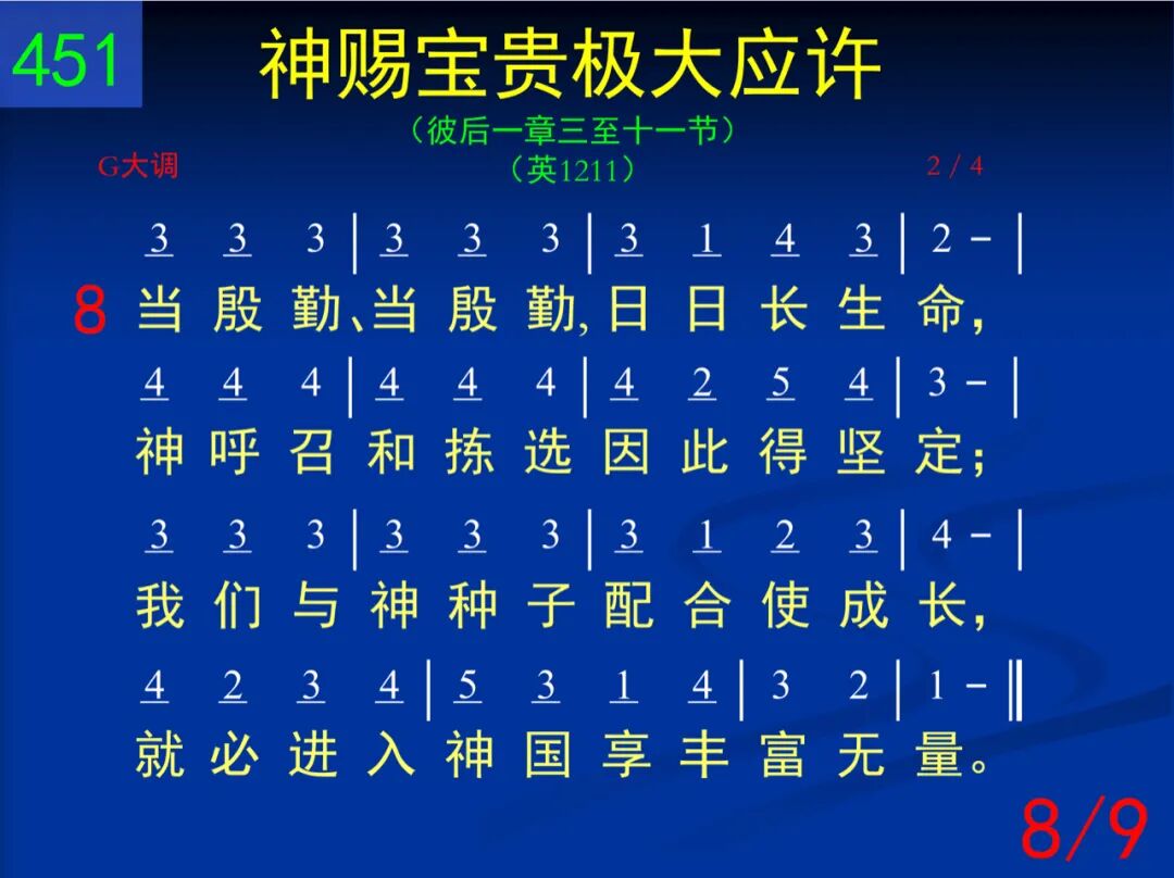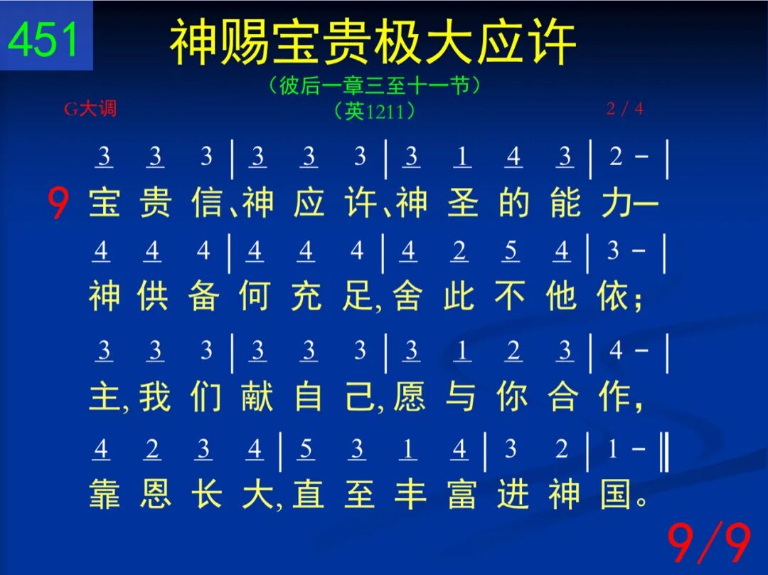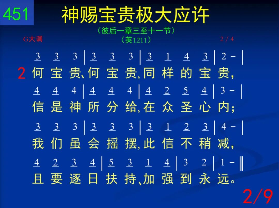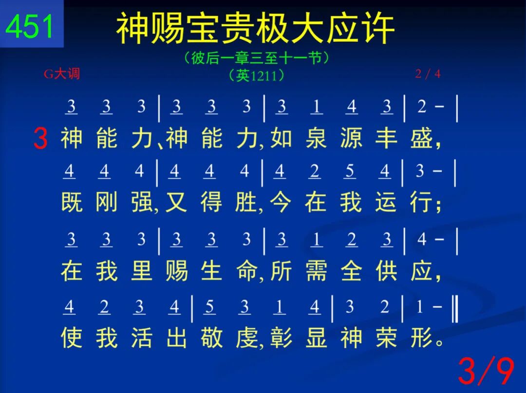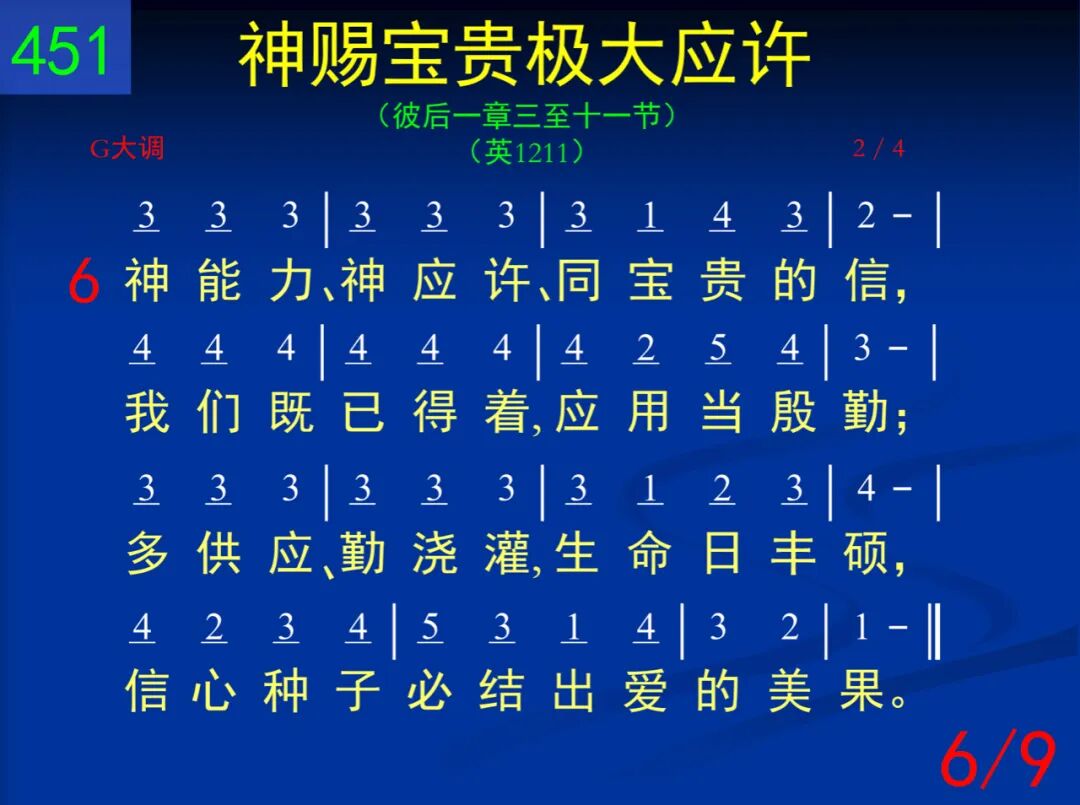 神已赐,神已赐,神今已赐与:宝贵信、神能力、并极大应许;我们信而领受,供应全得着,就能凭此长大成熟进神国。 二 何宝贵、何宝贵,同样的宝贵,信是神所分给,在众圣心内;我们虽会摇摆,此信不稍减,且要逐日扶持、加强到永远。 三 神能力、神能力,如泉源丰盛,既刚强,又得胜,今在我运行;在我里赐生命,所需全供应,使我活出敬虔,彰显神荣形。 四 藉荣耀、藉美德,神呼召我们,又宝贵又极大应许作我分;脱情欲、脱败坏,世界失权能,藉应许我们得有分神性情。 五 基督是神能力,在我灵里居,祂又是神话语─神全备应许;读祂话,摸祂灵,天天当操练─呼求、读经、祷告,生命时加添。 六 神能力、神应许、同宝贵的信,我们既已得着,应用当殷勤;多供应、勤浇灌,生命日丰硕,信心种子必结出爱的美果。 七 要增长、要增长,主里要增长,勿闲懒,结美果,丰富又多方;我们罪已得洁,救恩不该忘,不再眼瞎,乃要天天让主长。 八 当殷勤、当殷勤,日日长生命,神呼召和拣选因此得坚定;我们与神种子配合使成长,就必进入神国享丰富无量。 九 宝贵信、神应许、神圣的能力─神供备何充足,舍此不他依;主,我们献自己,愿与你合作,靠恩长大,直至丰富进神国。