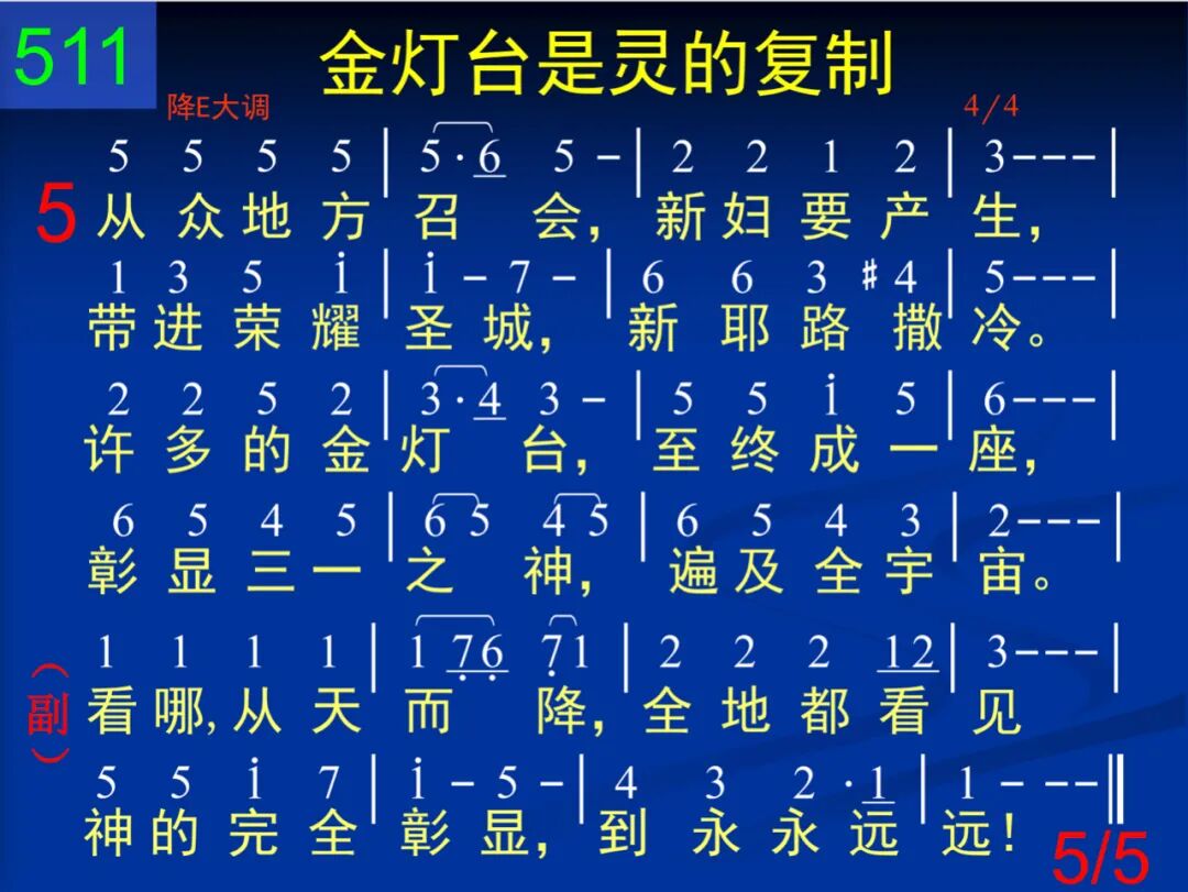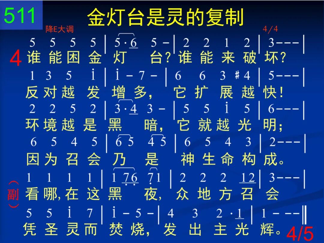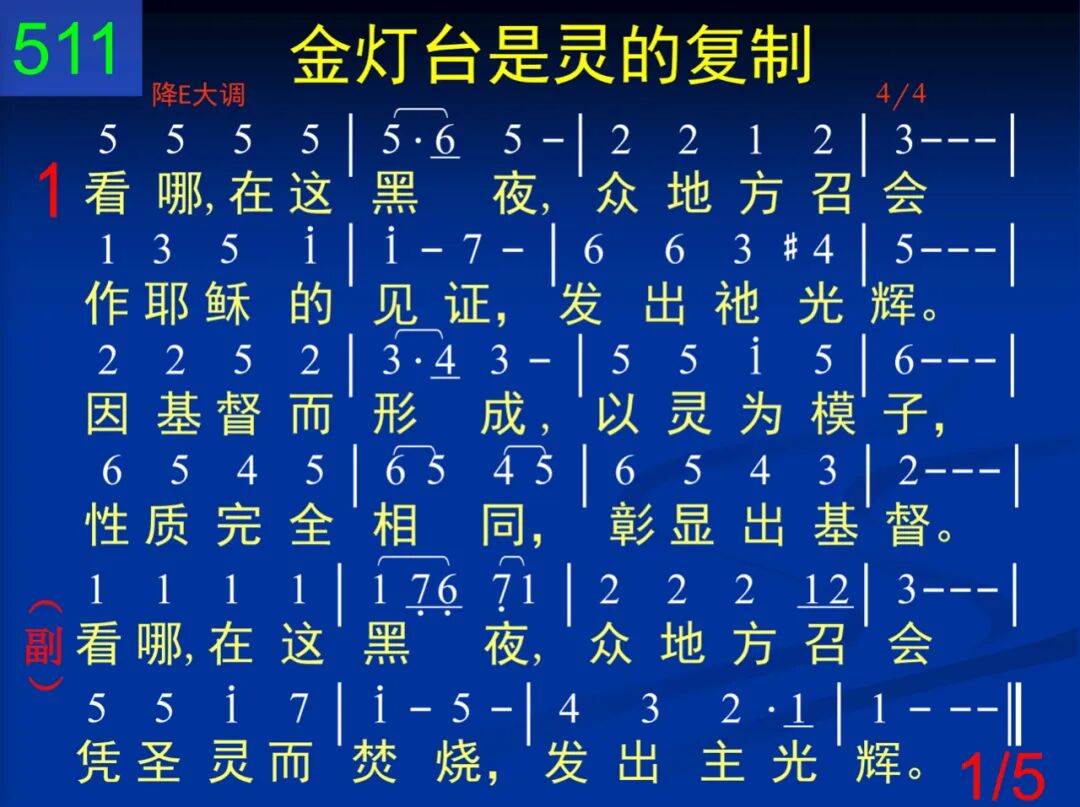 看哪,在这黑夜,众地方召会作耶稣的见证,发出祂光辉。因基督而形成,以灵为模子,性质完全相同,彰显出基督。 看哪,在这黑夜,众地方召会凭圣灵而焚烧,发出主光辉。 二 神有形有体的住在基督里;基督如今是灵,是一切实际。个个金灯台是这灵的复制,召会在各地方一一的显出。 看哪,在这黑夜,众地方召会凭圣灵而焚烧,发出主光辉。 三 行走众召会中,是一位人子。祂穿着细麻衣,乃是大祭司!胸前束着金带,在爱里照顾;七星在祂手中,众召会有路! 看哪,在这黑夜,众地方召会凭圣灵而焚烧,发出主光辉。 四 谁能困金灯台?谁能来破坏?反对越发增多,它扩展越快!环境越是黑暗,它就越光明;因为召会乃是神生命构成。 看哪,在这黑夜,众地方召会凭圣灵而焚烧,发出主光辉。 五 从众地方召会,新妇要产生,带进荣耀圣城,新耶路撒冷。许多的金灯台,至终成一座,彰显三一之神,遍及全宇宙。 看哪,从天而降,全地都看见神的完全彰显,到永永远远!