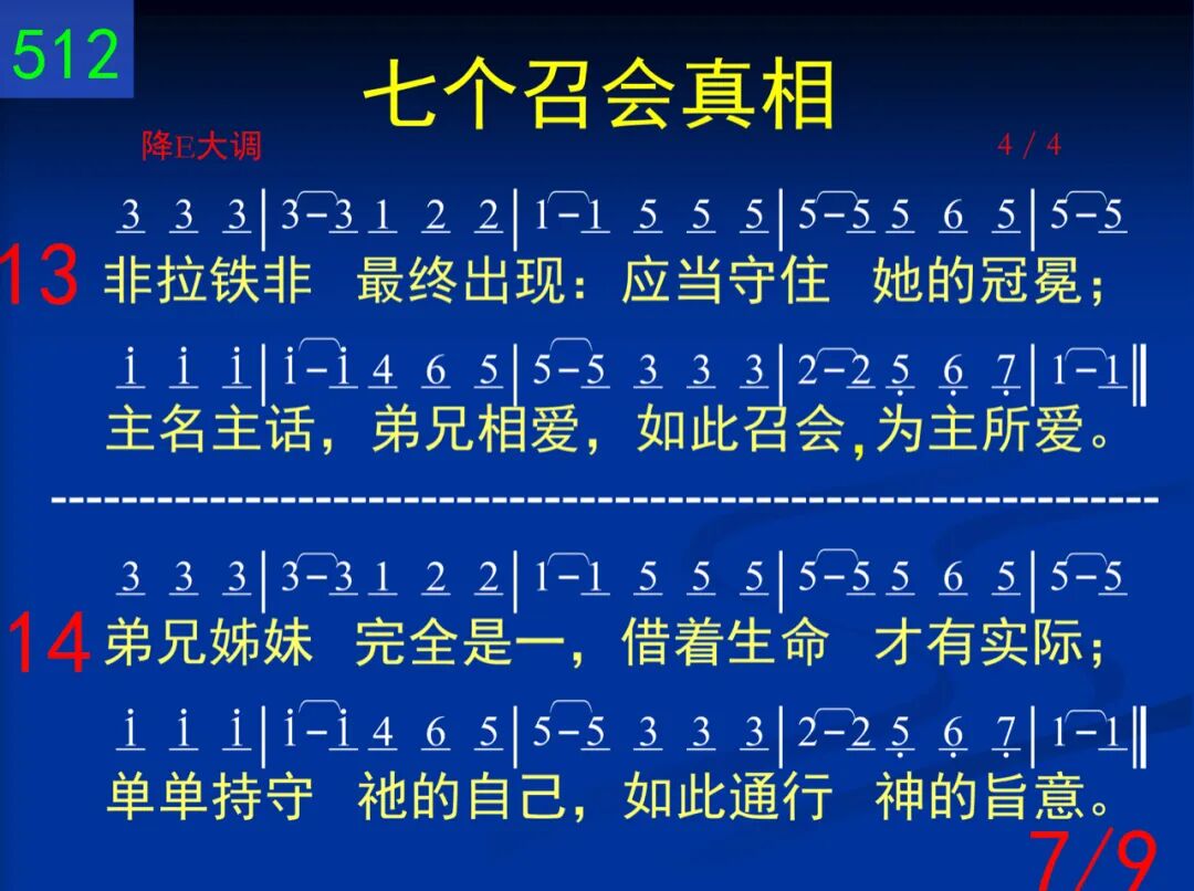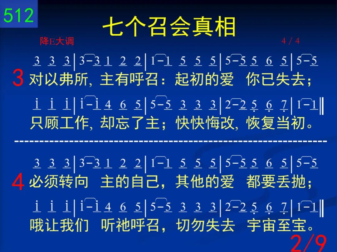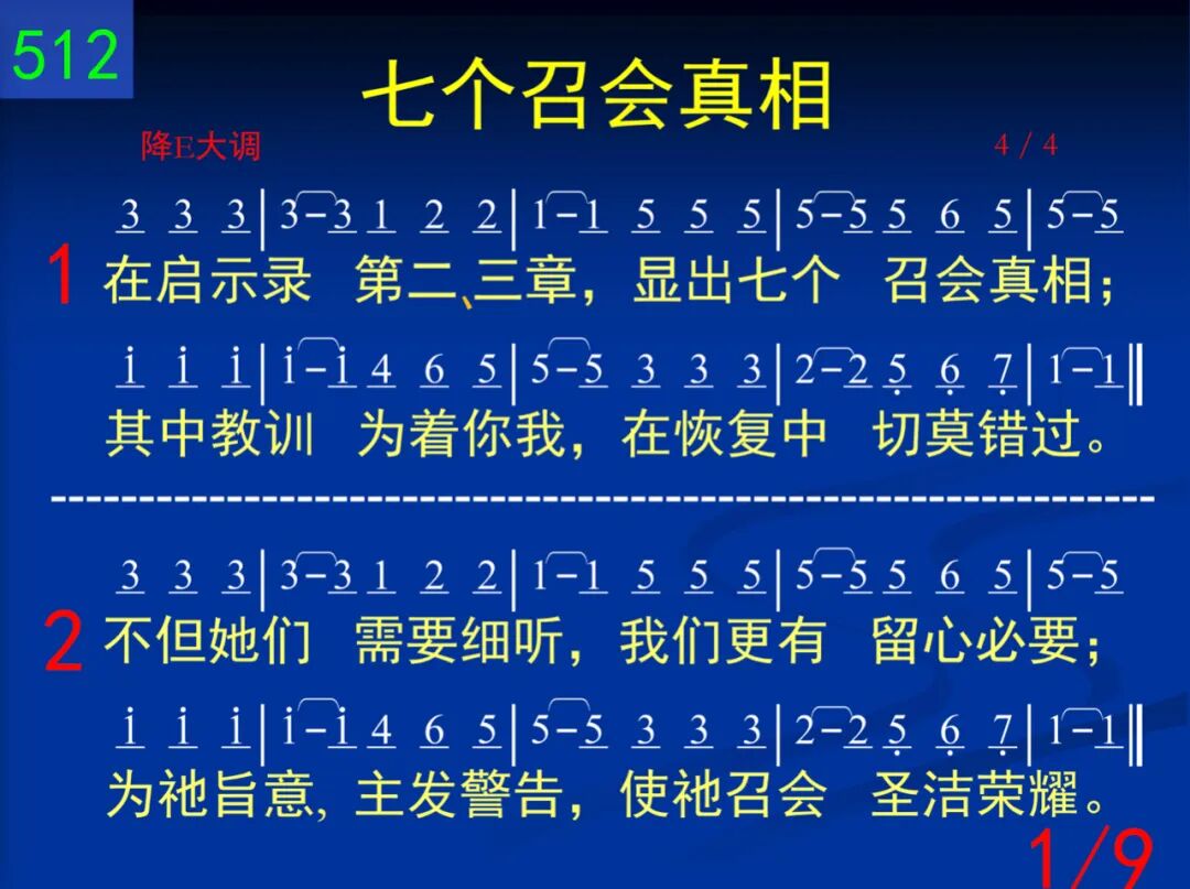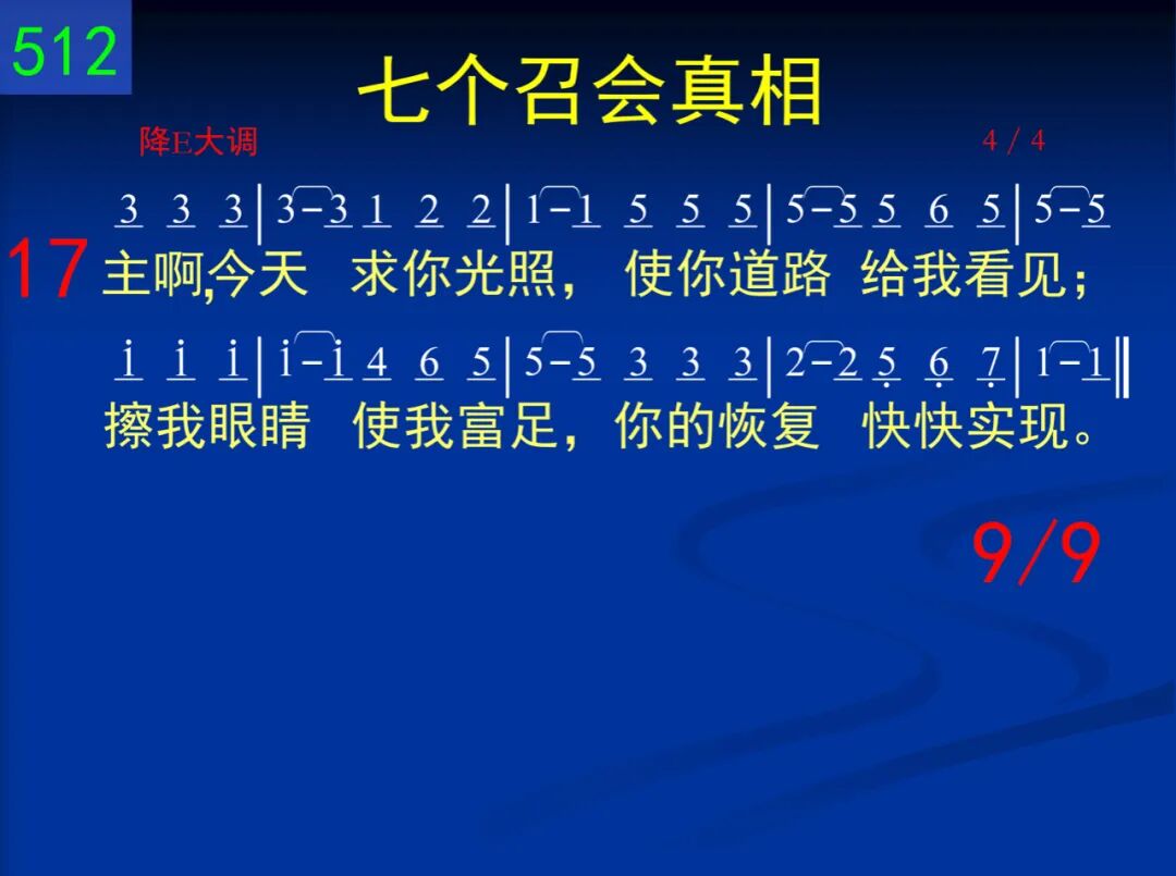 在启示录第二、三章,显出七个召会真相;其中教训为着你我,在恢复中切莫错过。 二 不但她们需要细听,我们更有留心必要;为祂旨意,主发警告,使祂召会圣洁荣耀。 三 对以弗所,主有呼召:起初的爱你已失去;只顾工作,却忘了主;快快悔改,恢复当初。 四 必须转向主的自己,其他的爱都要丢抛;哦让我们听祂呼召,切勿失去宇宙至宝。 五 对士每拿,受苦之子:你曾被试,但不仅此;至死忠心,不可怕死,甘愿牺牲魂与身子。 六 忠心直到天然除净,不能看轻一切环境;主让它们临到你身,有祂美意,试你爱情。 七 到别迦摩,堕落更深,基督教与世界通婚;忠心的安提帕殉道,惟有他才敢反宗教。 八 我们必须恐惧战兢,小心勿与世界行淫;惟有主话,能救我们,只要对它不断经营。 九 推雅推喇跟在后面,她的能力并非属天;细面与酵混成一片,淫妇和兽联成一线。 十 我们搀杂,求主光照,主来显明所有假冒;除去一切或坏或好,直至绝对被你得着。 十一 从撒狄中看得清楚,生命乃是惟一道路;她说她活,其实是死,撒狄必须接触活主。 十二 主,引我们摸着生命,胜过所有死的情形;脱离一切宗教背景,满足你心,充满生命。 十三 非拉铁非最终出现:应当守住她的冠冕;主名主话,弟兄相爱,如此召会,为主所爱。 十四 弟兄姊妹完全是一,藉着生命才有实际;单单持守祂的自己,如此通行神的旨意。 十五 对老底嘉应当留心,她的堕落大有原因;皆因她说我富足了,却不知道主离开了。 十六 我们不能再像温水,灵要火热,一直跟随;丰富进入生命经历,得主称许同祂坐席。 十七 主阿,今天求你光照,使你道路给我看见;擦我眼睛使我富足,你的恢复快快实现。