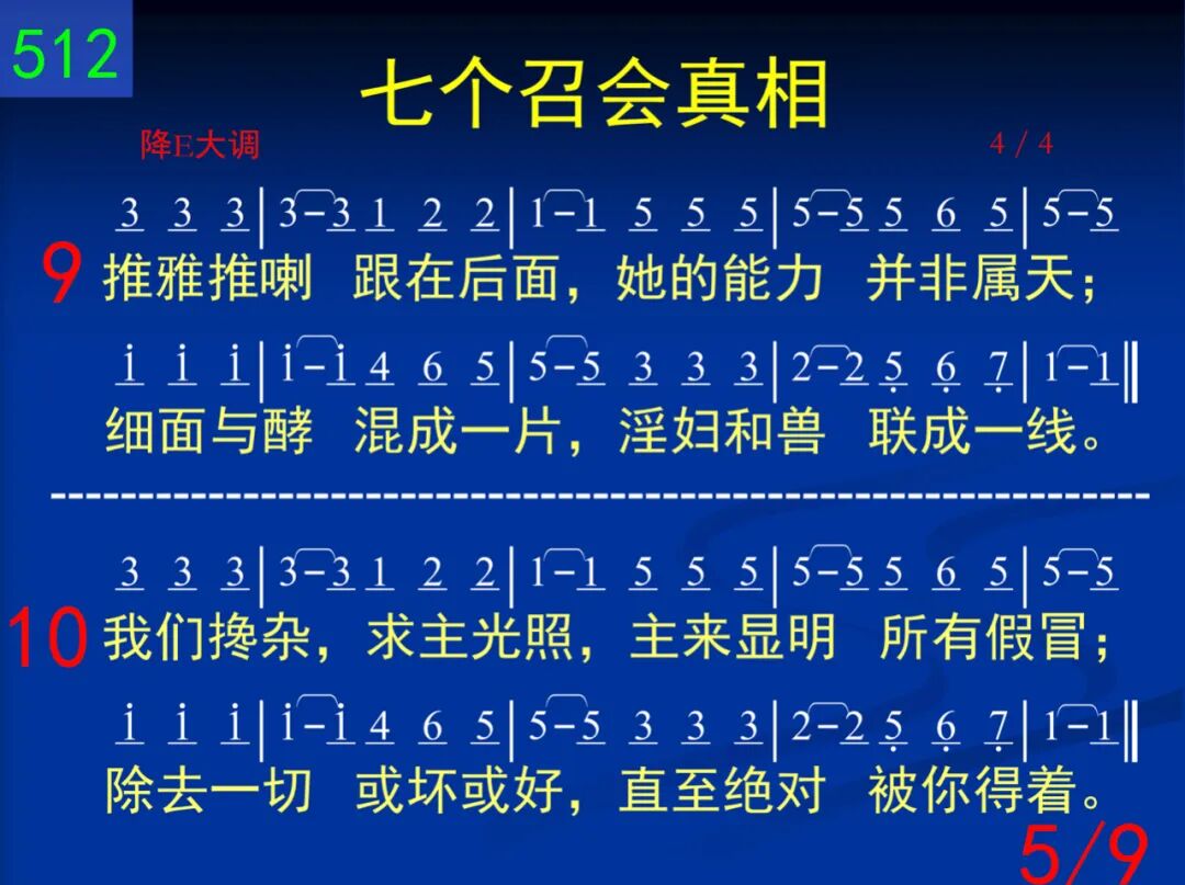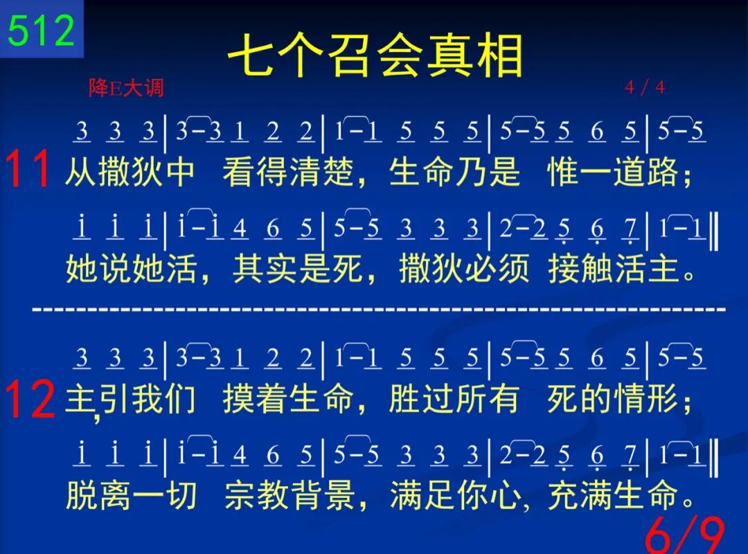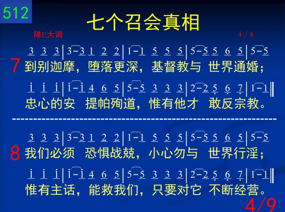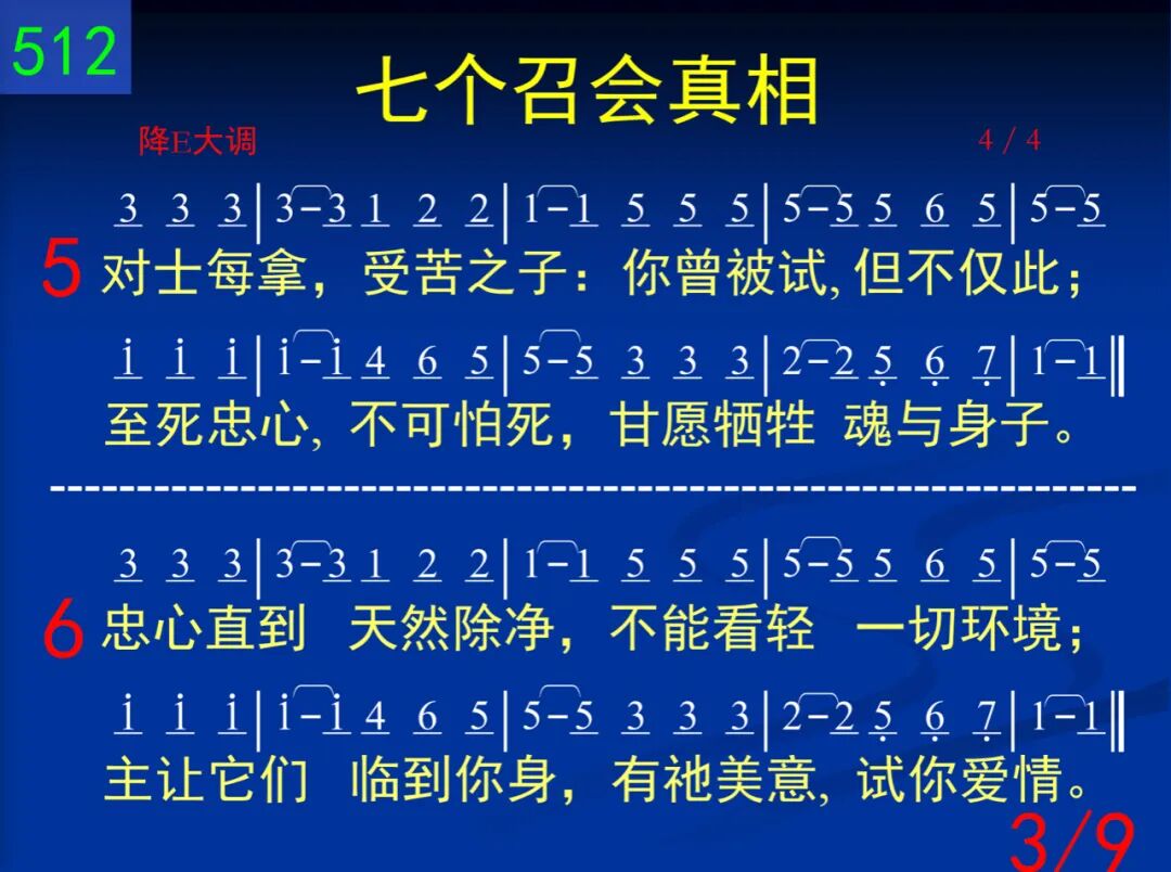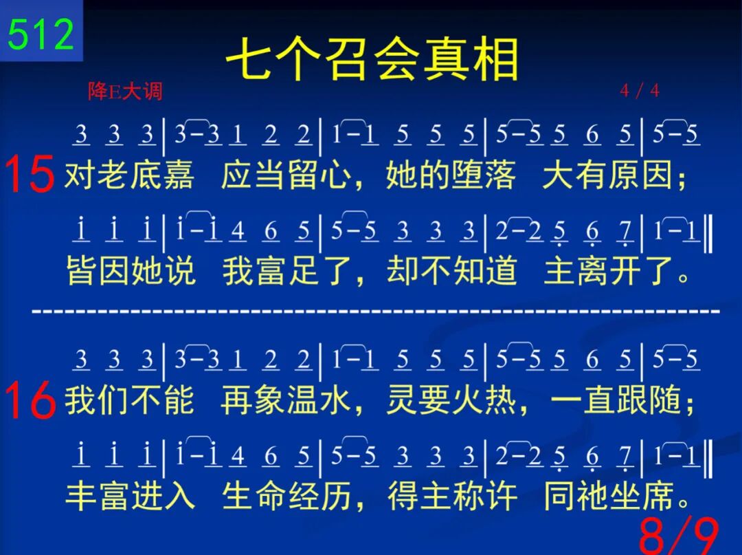 在启示录第二、三章,显出七个召会真相;其中教训为着你我,在恢复中切莫错过。 二 不但她们需要细听,我们更有留心必要;为祂旨意,主发警告,使祂召会圣洁荣耀。 三 对以弗所,主有呼召:起初的爱你已失去;只顾工作,却忘了主;快快悔改,恢复当初。 四 必须转向主的自己,其他的爱都要丢抛;哦让我们听祂呼召,切勿失去宇宙至宝。 五 对士每拿,受苦之子:你曾被试,但不仅此;至死忠心,不可怕死,甘愿牺牲魂与身子。 六 忠心直到天然除净,不能看轻一切环境;主让它们临到你身,有祂美意,试你爱情。 七 到别迦摩,堕落更深,基督教与世界通婚;忠心的安提帕殉道,惟有他才敢反宗教。 八 我们必须恐惧战兢,小心勿与世界行淫;惟有主话,能救我们,只要对它不断经营。 九 推雅推喇跟在后面,她的能力并非属天;细面与酵混成一片,淫妇和兽联成一线。 十 我们搀杂,求主光照,主来显明所有假冒;除去一切或坏或好,直至绝对被你得着。 十一 从撒狄中看得清楚,生命乃是惟一道路;她说她活,其实是死,撒狄必须接触活主。 十二 主,引我们摸着生命,胜过所有死的情形;脱离一切宗教背景,满足你心,充满生命。 十三 非拉铁非最终出现:应当守住她的冠冕;主名主话,弟兄相爱,如此召会,为主所爱。 十四 弟兄姊妹完全是一,藉着生命才有实际;单单持守祂的自己,如此通行神的旨意。 十五 对老底嘉应当留心,她的堕落大有原因;皆因她说我富足了,却不知道主离开了。 十六 我们不能再像温水,灵要火热,一直跟随;丰富进入生命经历,得主称许同祂坐席。 十七 主阿,今天求你光照,使你道路给我看见;擦我眼睛使我富足,你的恢复快快实现。
