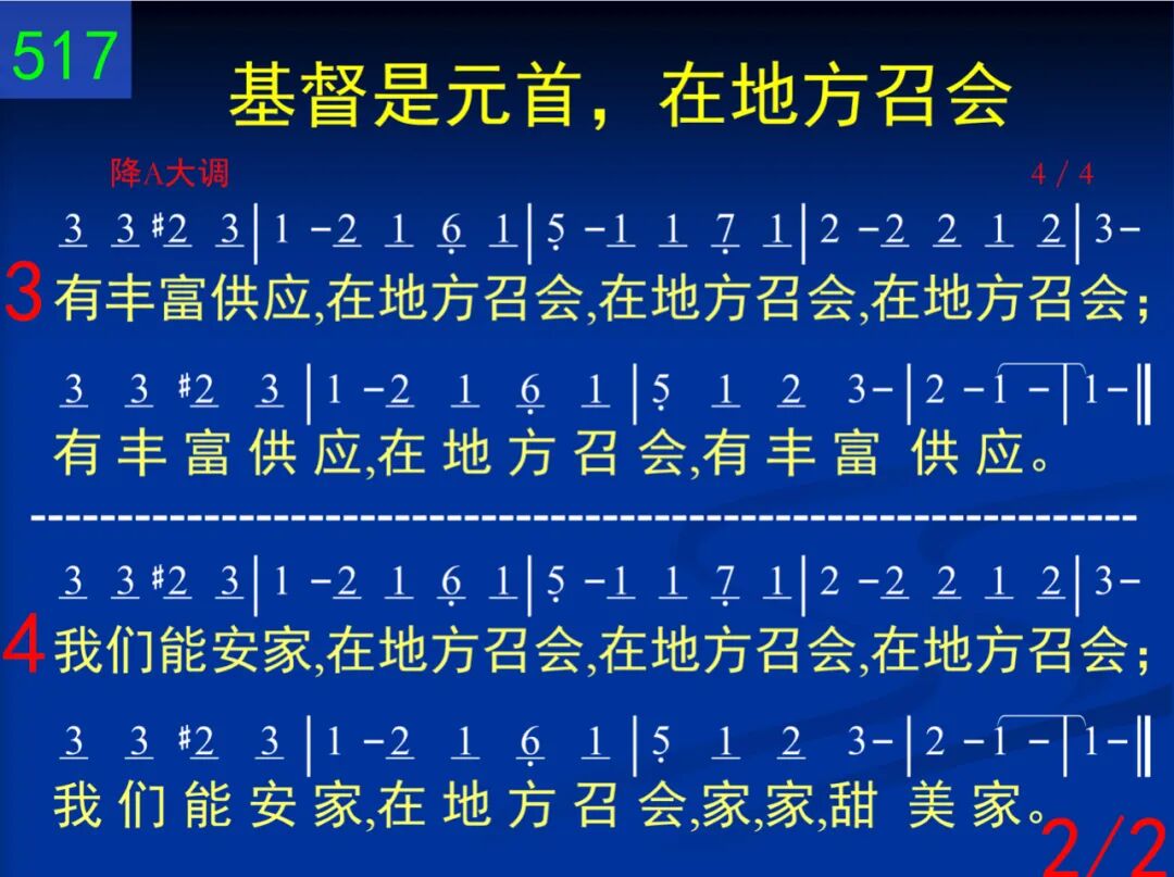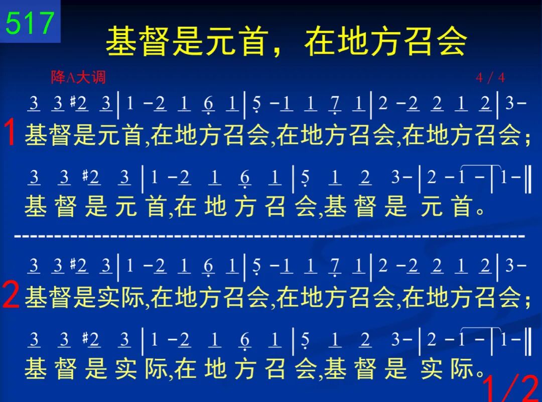 基督是元首,在地方召会,在地方召会,在地方召会;基督是元首,在地方召会,基督是元首。 二 基督是实际,在地方召会,在地方召会,在地方召会;基督是实际,在地方召会,基督是实际。 三 有丰富供应,在地方召会,在地方召会,在地方召会;有丰富供应,在地方召会,有丰富供应。 四 我们能安家,在地方召会,在地方召会,在地方召会;我们能安家,在地方召会,家,家,甜美家。