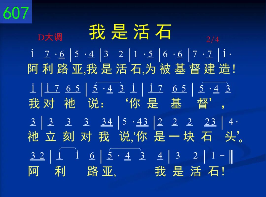 阿利路亚,我是活石,为被基督建造!我对祂说:“你是基督,”祂立刻对我说,“你是一块石头。”阿利路亚,我是活石!