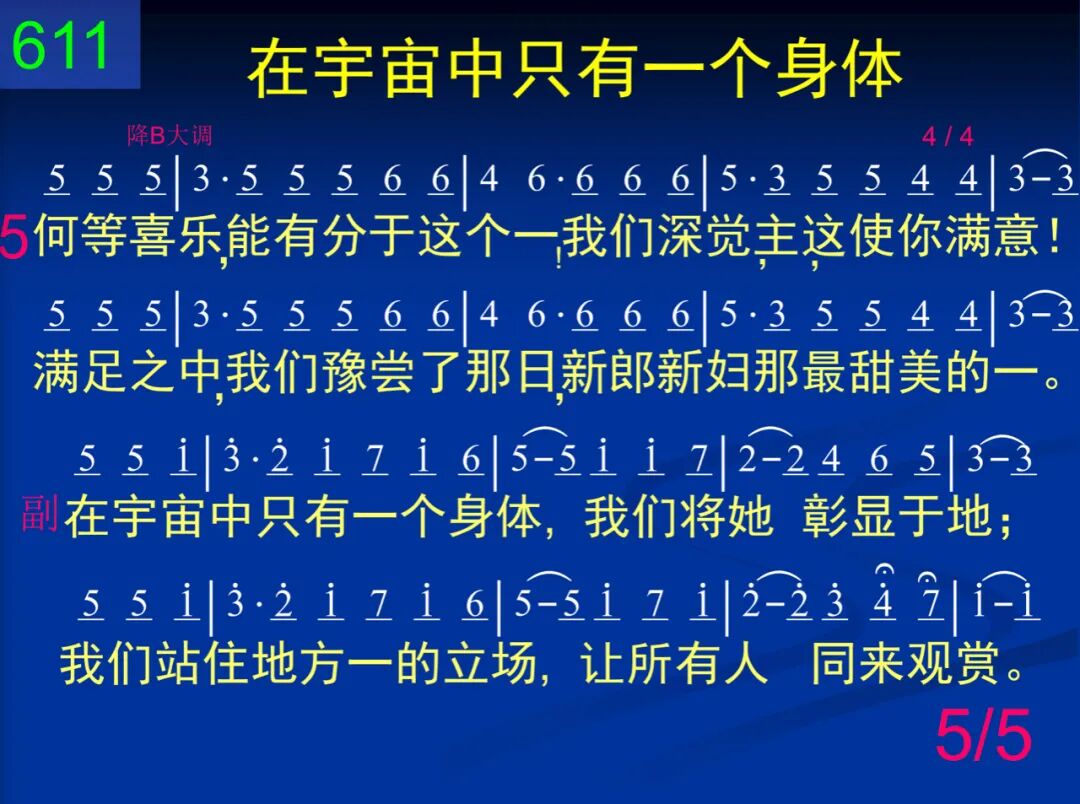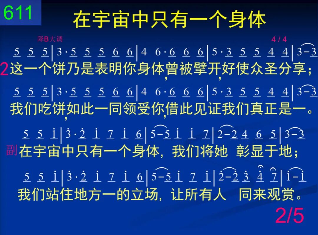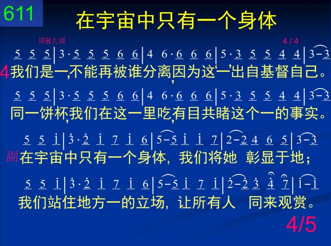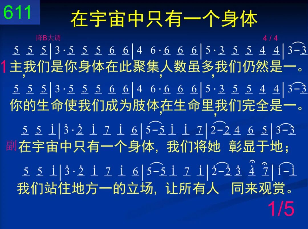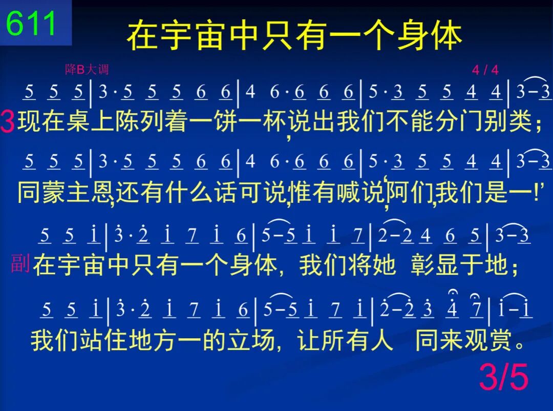 主,我们是你身体在此聚集,人数虽多,我们仍然是一。你的生命使我们成为肢体,在生命里,我们完全是一。 在宇宙中只有一个身体,我们将她彰显于地;我们站住地方一的立场,让所有人同来观赏。 二 这一个饼乃是表明你身体,曾被擘开,好使众圣分享;我们吃饼,如此一同领受你,藉此见证我们真正是一。 在宇宙中只有一个身体,我们将她彰显于地;我们站住地方一的立场,让所有人同来观赏。 三 现在桌上陈列着一饼一杯,说出我们不能分门别类;同蒙主恩,还有什么话可说,惟有喊说:“阿们,我们是一!” 在宇宙中只有一个身体,我们将她彰显于地;我们站住地方一的立场,让所有人同来观赏。 四 我们是一,不能再被谁分离,因为这“一”出自基督自己。同一饼杯,我们在这一里吃,有目共睹这个一的事实。 在宇宙中只有一个身体,我们将她彰显于地;我们站住地方一的立场,让所有人同来观赏。 五 何等喜乐,能有分于这个一!我们深觉,主,这使你满意!满足之中,我们预尝了那日,新郎新妇那最甜美的一。 在宇宙中只有一个身体,我们将她彰显于地;我们站住地方一的立场,让所有人同来观赏。