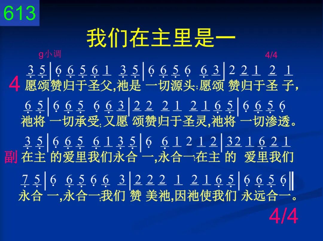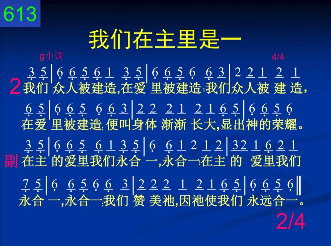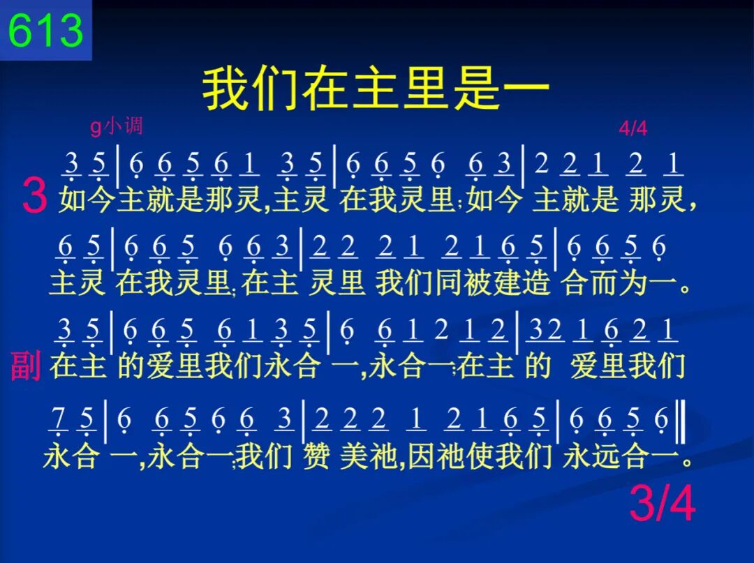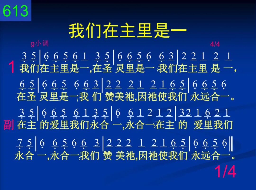 我们在主里是一,在圣灵里是一;我们在主里是一,在圣灵里是一;我们赞美祂,因祂使我们永远合一。 在主的爱里我们永合一,永合一;在主的爱里我们永合一,永合一;我们赞美祂,因祂使我们永远合一。 二 我们众人被建造,在爱里被建造;我们众人被建造,在爱里被建造;便叫身体渐渐长大,显出神的荣耀。 在主的爱里我们永合一,永合一;在主的爱里我们永合一,永合一;我们赞美祂,因祂使我们永远合一。 三 如今主就是那灵,主灵在我灵里;如今主就是那灵,主灵在我灵里;在主灵里我们同被建造合而为一。 在主的爱里我们永合一,永合一;在主的爱里我们永合一,永合一;我们赞美祂,因祂使我们永远合一。 四 愿颂赞归于圣父,祂是一切源头;愿颂赞归于圣子,祂将一切承受;又愿颂赞归于圣灵,祂将一切渗透。 在主的爱里我们永合一,永合一;在主的爱里我们永合一,永合一;我们赞美祂,因祂使我们永远合一。