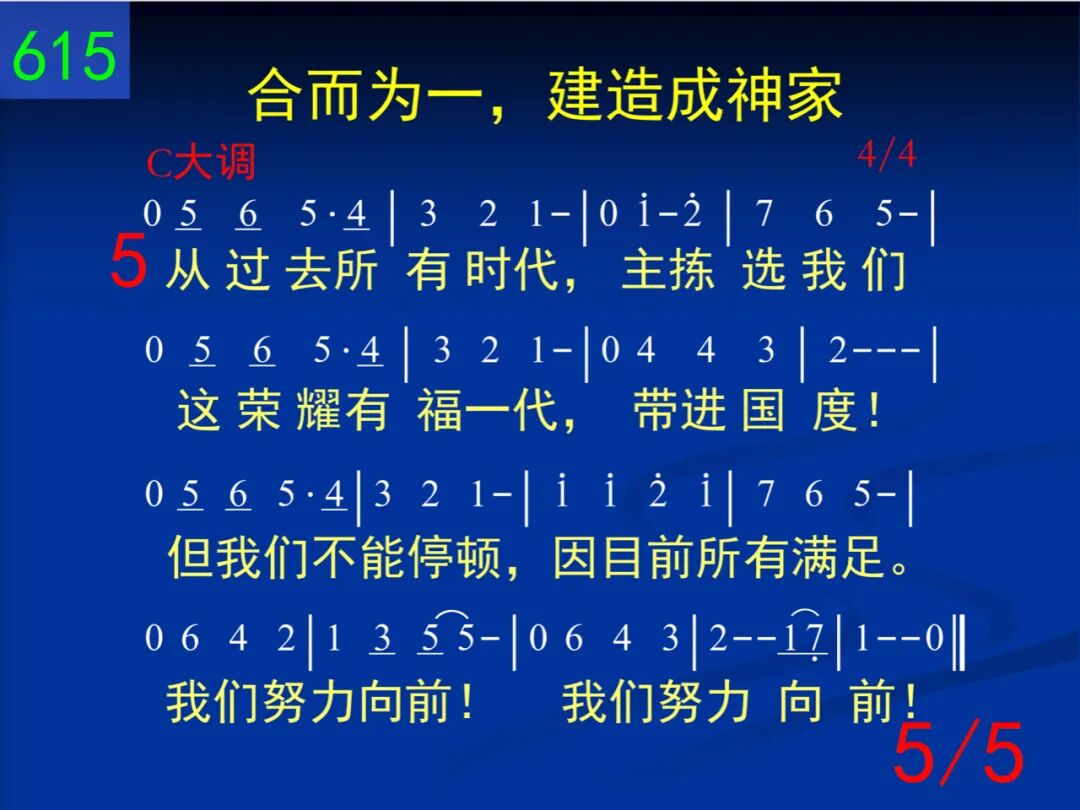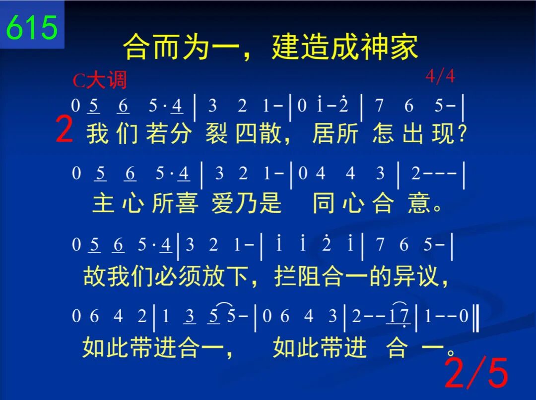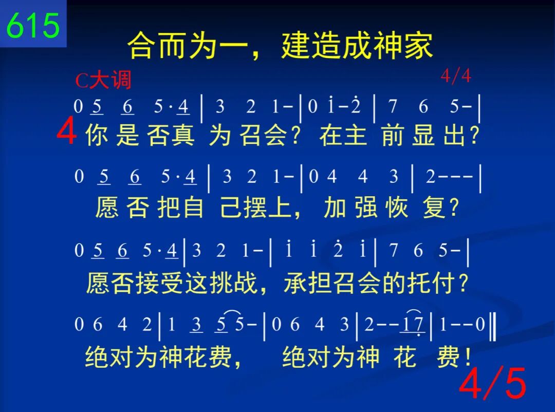 知否神有一需要,弟兄姊妹们?神需要有一居所,让祂安家!我们若合而为一,就被建造成神家,这家使神安息,我们也得安息。 二 我们若分裂四散,居所怎出现?主心所喜爱乃是同心合意。故我们必须放下,拦阻合一的异议,如此带进合一,如此带进合一。 三 当我们活在“一”里,这相爱显出。这爱是在神家里,实际真挚。在这家我们尝尽,历代圣徒的丰富。神家满了肥甘!神家满了肥甘! 四 你是否真为召会?在主前显出?愿否把自己摆上,加强恢复?愿否接受这挑战,承担召会的托付?绝对为神花费,绝对为神花费! 五 从过去所有时代,主拣选我们这荣耀有福一代,带进国度!但我们不能停顿,因目前所有满足。我们努力向前!我们努力向前!
