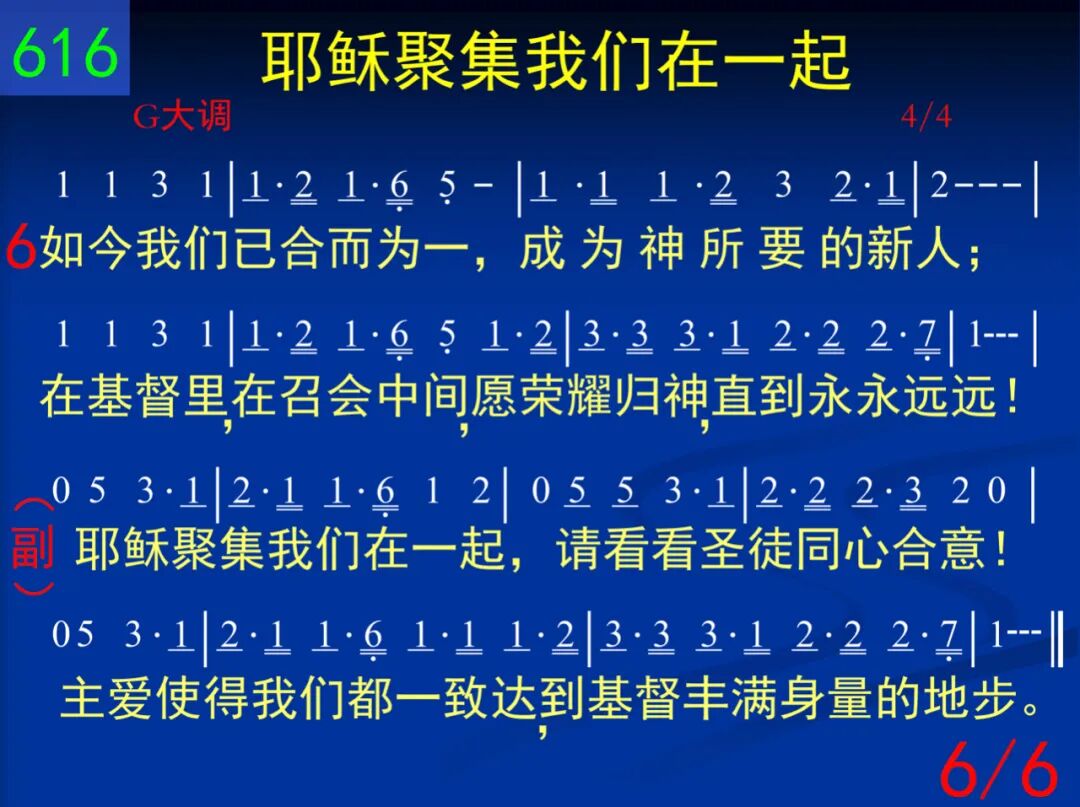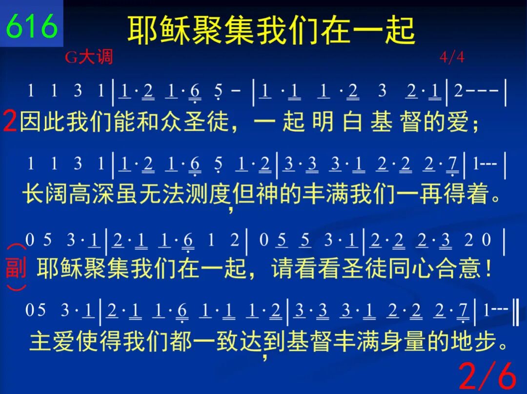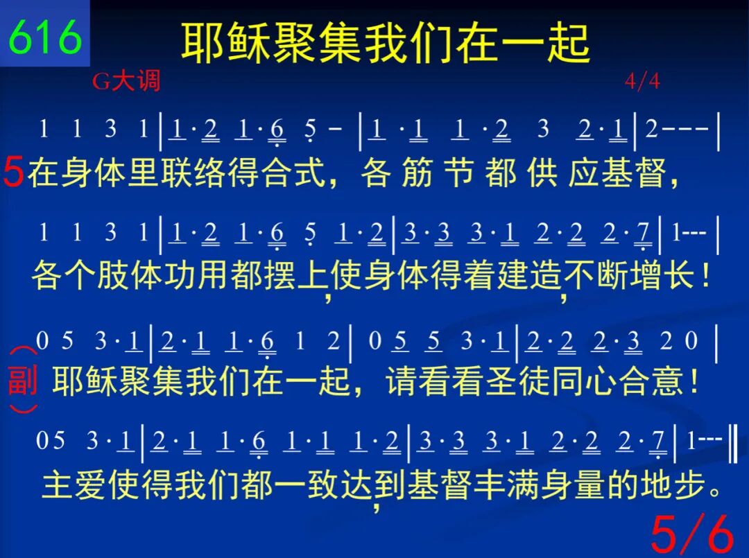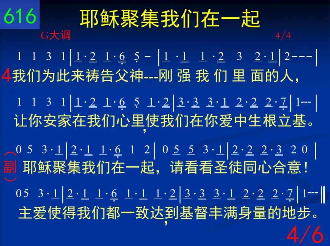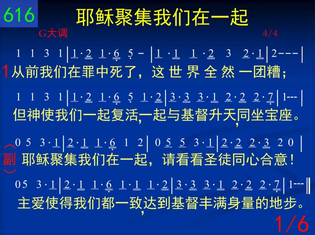 从前我们在罪中死了,这世界全然一团糟;但神使我们一起复活,一起与基督升天,同坐宝座。 耶稣聚集我们在一起,请看看圣徒同心合意!主爱使得我们都一致,达到基督丰满身量的地步。 二 因此我们能和众圣徒,一起明白基督的爱;长阔高深虽然无法测度,但神的丰满我们一再得着。 耶稣聚集我们在一起,请看看圣徒同心合意!主爱使得我们都一致,达到基督丰满身量的地步。 三 神在历代隐藏的旨意,已成了显明的奥秘;基督,召会,我们今看见,这真叫撒但受辱,羞惭满面! 耶稣聚集我们在一起,请看看圣徒同心合意!主爱使得我们都一致,达到基督丰满身量的地步。 四 我们为此来祷告父神─刚强我们里面的人,让你安家在我们心里,使我们在你爱中生根立基。 耶稣聚集我们在一起,请看看圣徒同心合意!主爱使得我们都一致,达到基督丰满身量的地步。 五 在身体里联络得合式,各筋节都供应基督,各个肢体功用都摆上,使身体得着建造,不断增长! 耶稣聚集我们在一起,请看看圣徒同心合意!主爱使得我们都一致,达到基督丰满身量的地步。 六 如今我们已合而为一,成为神所要的新人;在基督里,在召会中间,愿荣耀归神,直到永永远远! 耶稣聚集我们在一起,请看看圣徒同心合意!主爱使得我们都一致,达到基督丰满身量的地步。