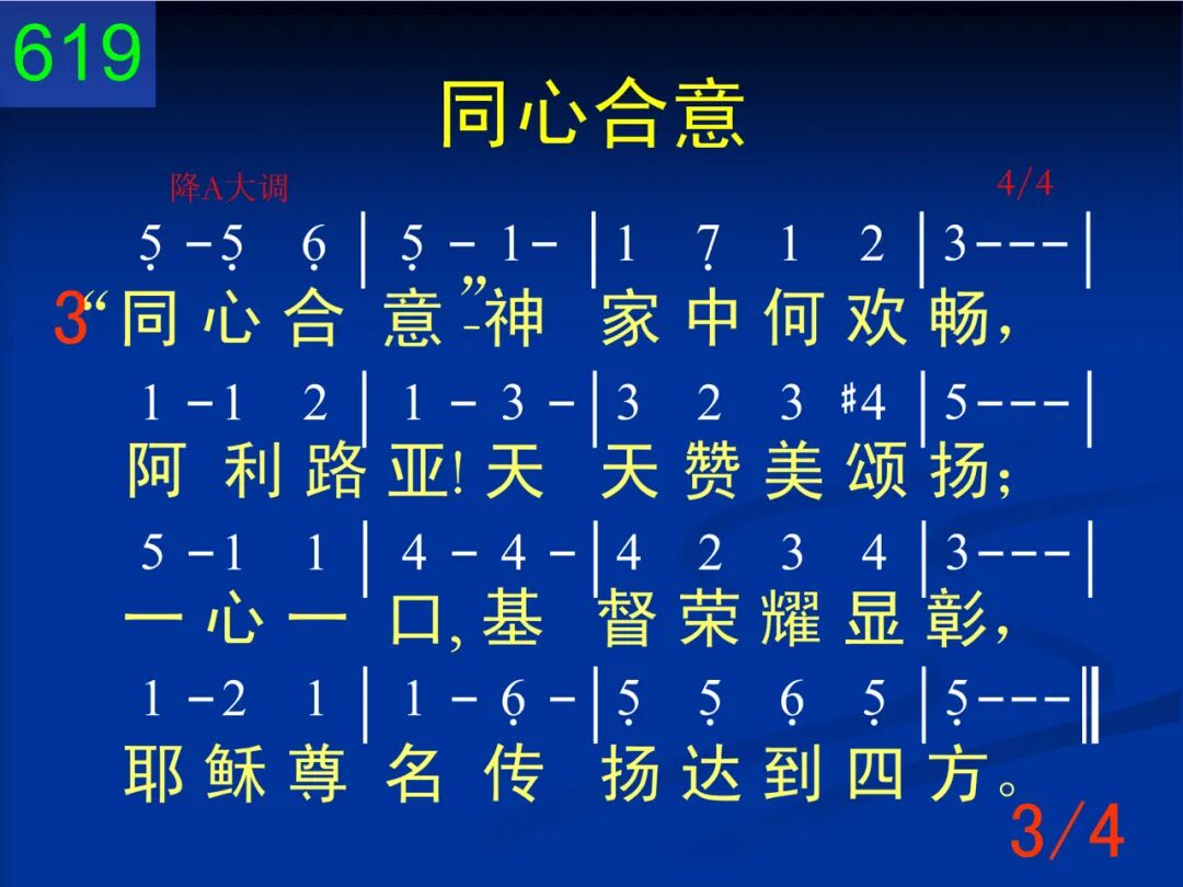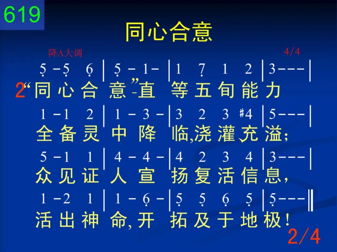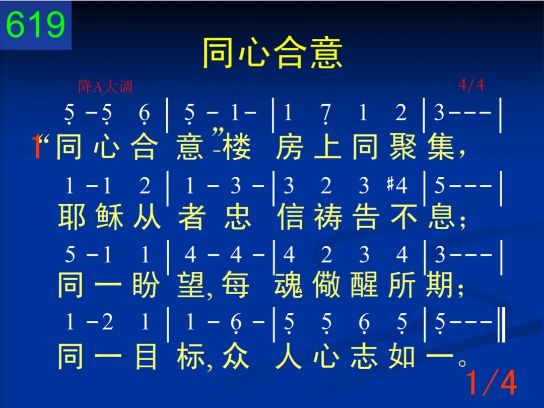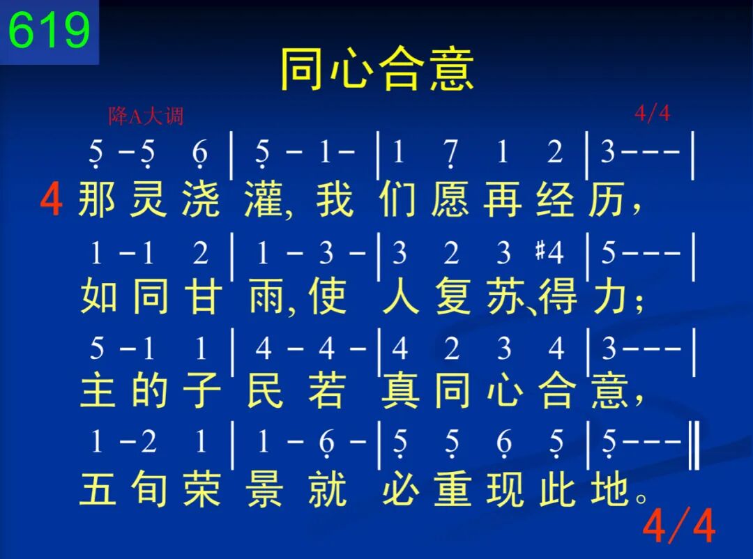 “同心合意”─楼房上同聚集,耶稣从者忠信祷告不息;同一盼望,每魂儆醒所期;同一目标,众人心志如一。 二 “同心合意”─直等五旬能力全备灵中降临,浇灌、充溢;众见证人宣扬复活信息,活出神命,开拓及于地极! 三 “同心合意”─神家中何欢畅,阿利路亚!天天赞美颂扬;一心一口,基督荣耀显彰,耶稣尊名传扬达到四方。 四 那灵浇灌,我们愿再经历,如同甘雨,使人复苏、得力;主的子民若真同心合意,五旬荣景就必重现此地。