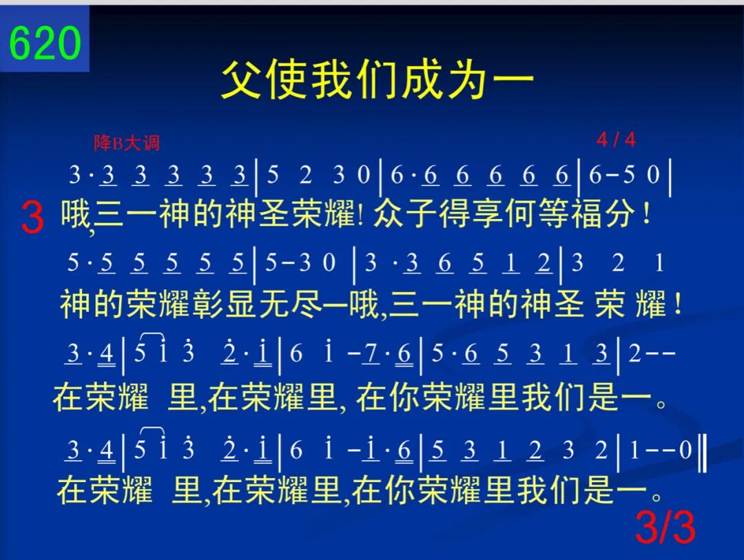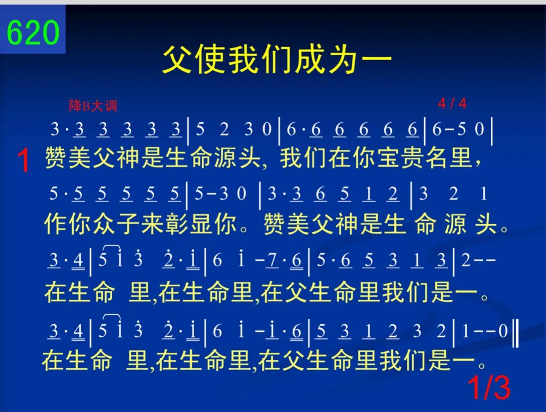 赞美父神是生命源头,我们在你宝贵名里,作你众子来彰显你。赞美父神是生命源头。 在生命里,在生命里,在父生命里我们是一。在生命里,在生命里,在父生命里我们是一。 二 感谢父藉你宝贵圣言,用你性情浸透我们,分别我们脱离俗尘。感谢父赐你宝贵圣言。 藉你圣言,藉你圣言,藉你圣言,我们成为一。藉你圣言,藉你圣言,藉你圣言,我们成为一。 三 哦,三一神的神圣荣耀!众子得享何等福分!神的荣耀彰显无尽─哦,三一神的神圣荣耀! 在荣耀里,在荣耀里,在你荣耀里我们是一。在荣耀里,在荣耀里,在你荣耀里我们是一。