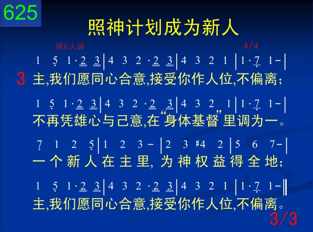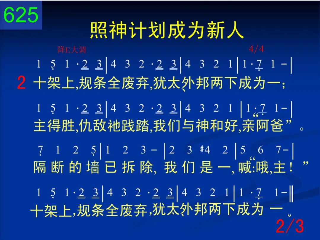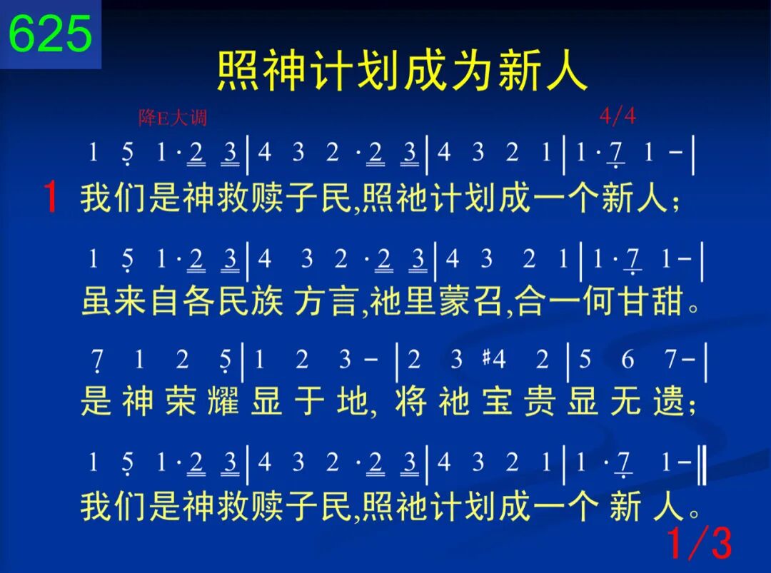 我们是神救赎子民,照祂计划成一个新人;虽来自各民族、方言,祂里蒙召,合一何甘甜。是神荣耀显于地,将祂宝贵显无遗;我们是神救赎子民,照祂计划成一个新人。 二 十架上,规条全废弃,犹太、外邦两下成为一;主得胜,仇敌祂践踏,我们与神和好,亲“阿爸”。隔断的墙已拆除,我们是一,喊:“哦,主!”十架上,规条全废弃,犹太、外邦两下成为一。 三 主,我们愿同心合意,接受你作人位,不偏离;不再凭雄心与己意,在“身体基督”里调为一。一个新人在主里,为神权益得全地;主,我们愿同心合意,接受你作人位,不偏离。