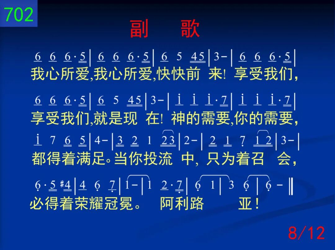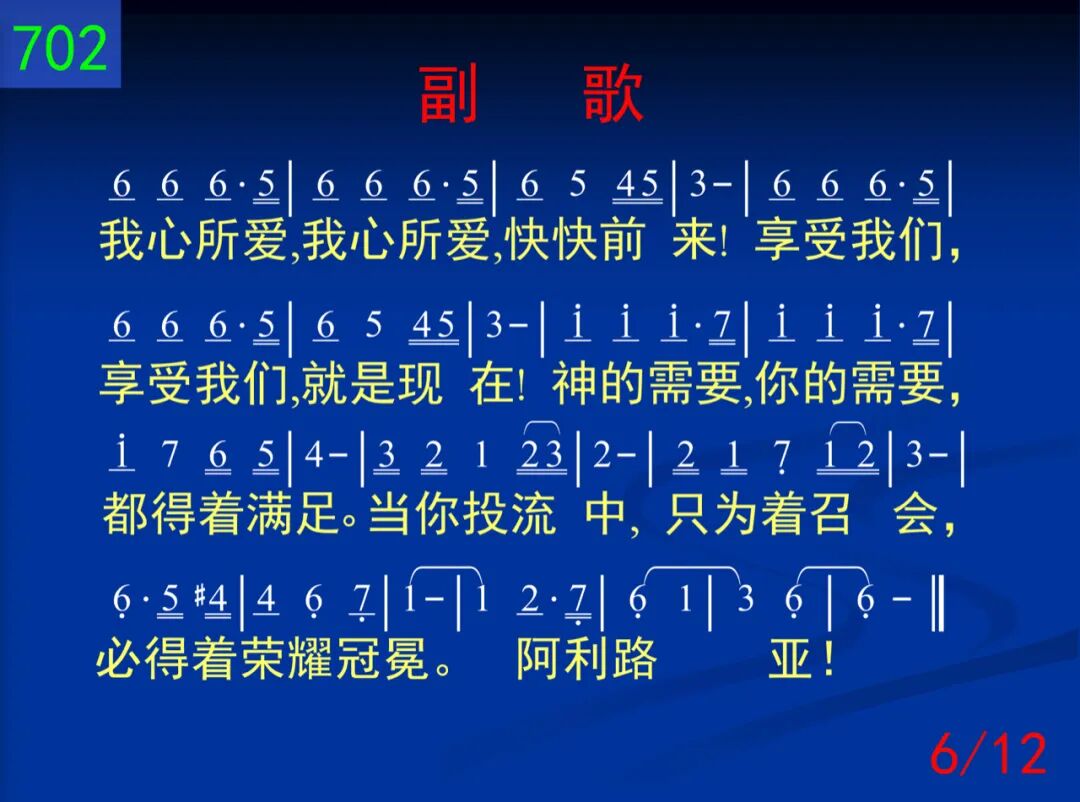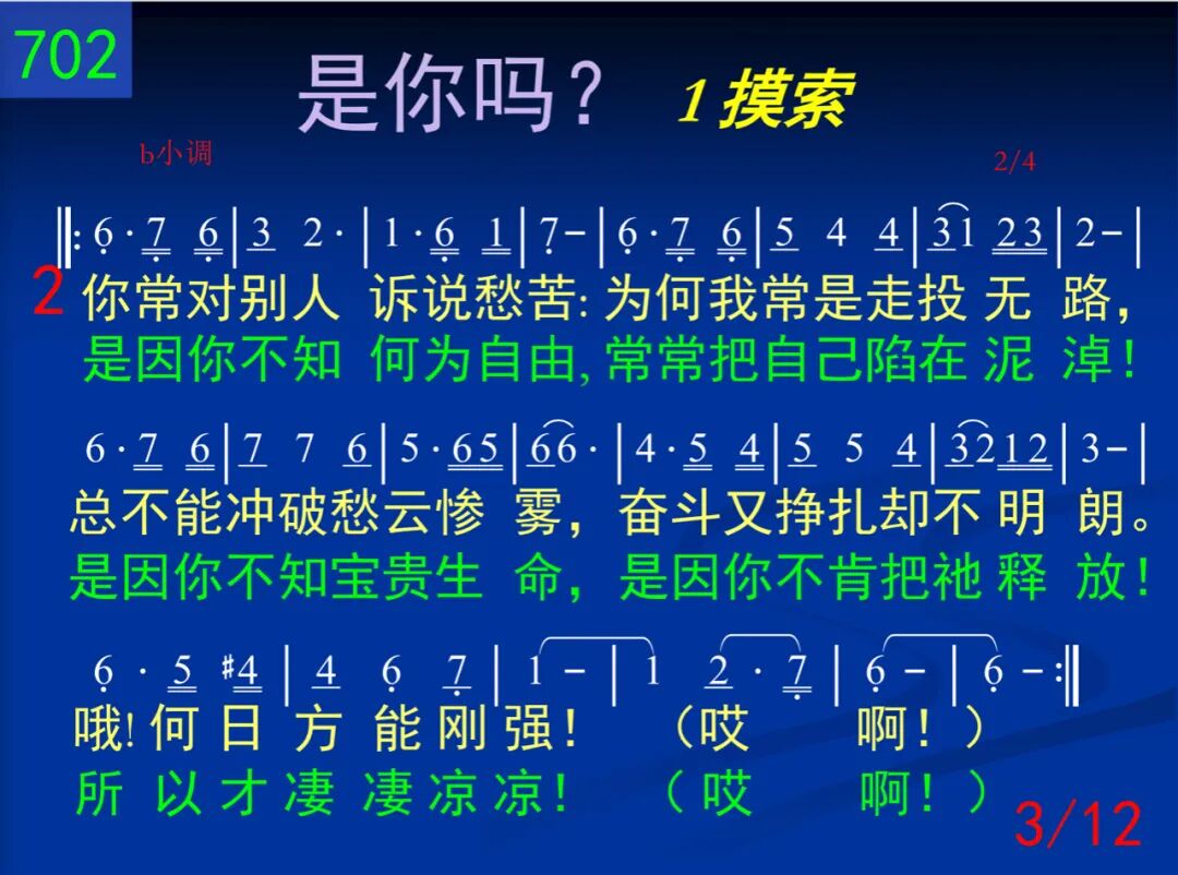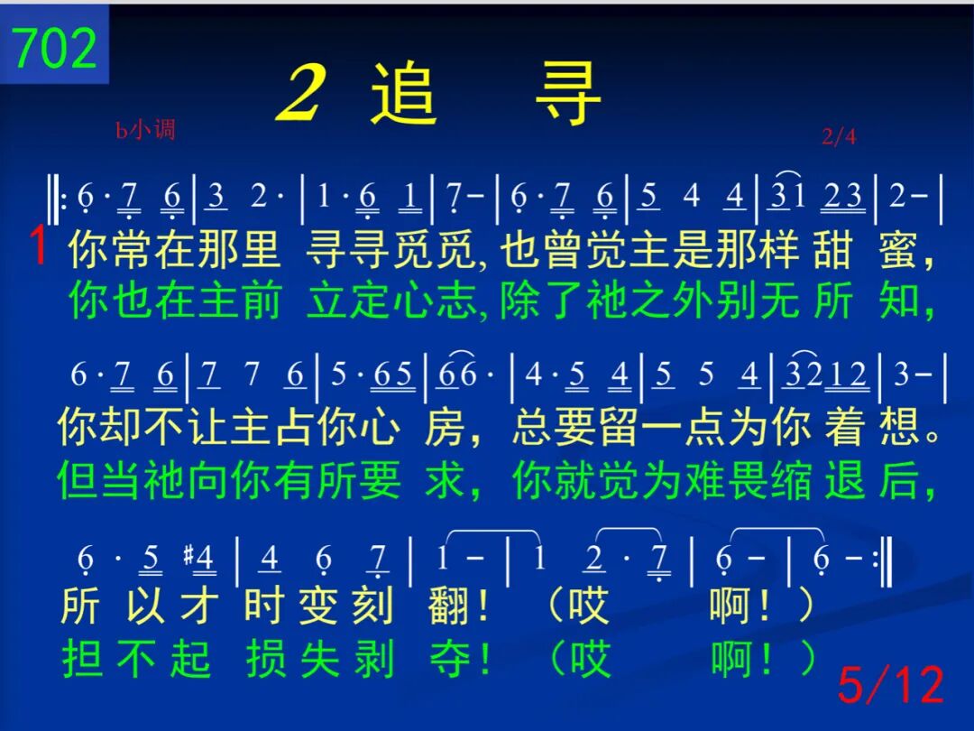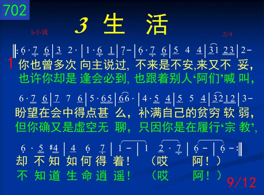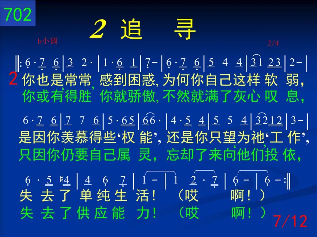 为何你常是没有喜乐,天天都平淡缺少音乐?是否你自己把你捆绑,生活的圈子窄小无望,所以才这样惆怅?(哎阿!)抑或你正是另有追求,忘记了你的宝贵的主?所以你才是经常失望,但却又不肯归回群羊,才感到如此迷惘?(哎阿!) 我心所爱,我心所爱,快快前来!享受我们,享受我们,就是现在!神的需要,你的需要,都得着满足。当你投流中,只为着召会,必得着荣耀冠冕。阿利路亚! 二 你常对别人诉说愁苦:为何我常是走投无路,总不能冲破愁云惨雾,奋斗又挣扎却不明朗。哦!何日方能刚强!(哎阿!)是因你不知何为自由,常常把自己陷在泥淖!是因你不知宝贵生命,是因你不肯把祂释放!所以才凄凄凉凉!(哎阿!) 我心所爱,我心所爱,快快前来!享受我们,享受我们,就是现在!神的需要,你的需要,都得着满足。当你投流中,只为着召会,必得着荣耀冠冕。阿利路亚! (二)追寻 三 你常在那里寻寻觅觅,也曾觉主是那样甜蜜,你却不让主占你心房,总要留一点为你着想。所以才时变刻翻!(哎阿!)你也在主前立定心志,除了祂之外别无所知,但当祂向你有所要求,你就觉为难畏缩退后,担不起损失剥夺!(哎阿!) 四 你也是常常感到困惑,为何你自己这样软弱,是因你羡慕得些“权能,”还是你只望为祂“工作,”失去了单纯生活!(哎阿!)你或有“得胜”你就骄傲,不然就满了灰心叹息,只因你仍要自己属灵,忘却了来向“他们”投依,失去了供应能力!(哎阿!) (三)生活 五 你也曾多次向主说过,不来是不安,来又不妥,盼望在会中得点什么,补满自己的贫穷软弱,却不知如何得着!(哎阿!)也许你却是逢会必到,也跟着别人“阿们”喊叫,但你确又是虚空无聊,只因你是在履行“宗教,”不知道生命逍遥!(哎阿!) 六 当你见别人投身流中,你也曾多次隔岸观望,见主在祝福你就拍掌,见别人失败你也失望,但你却总是这样!(哎阿!)你私下盼望多些责任,好叫你名声远播四方,常给人“帮助”得着“赞赏,”常流出“关切”得着“颂扬,”你的主却不这样!(哎阿!)