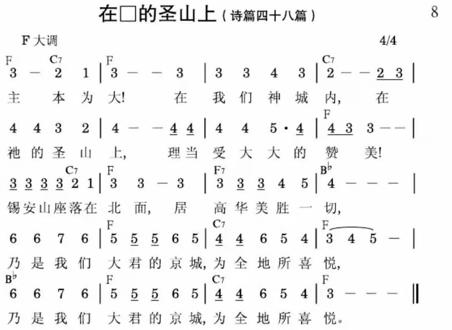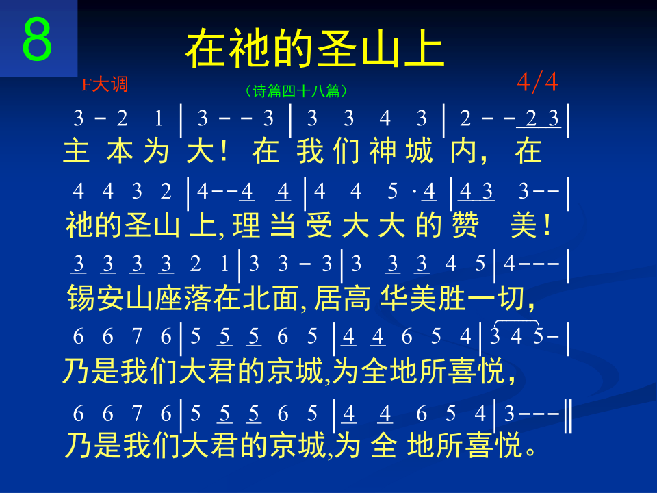 主本为大!在我们神城内,在祂的圣山上,理当受大大的赞美!锡安山座落在北面,居高华美胜一切,乃是我们大君的京城,为全地所喜悦,乃是我们大君的京城,为全地所喜悦。