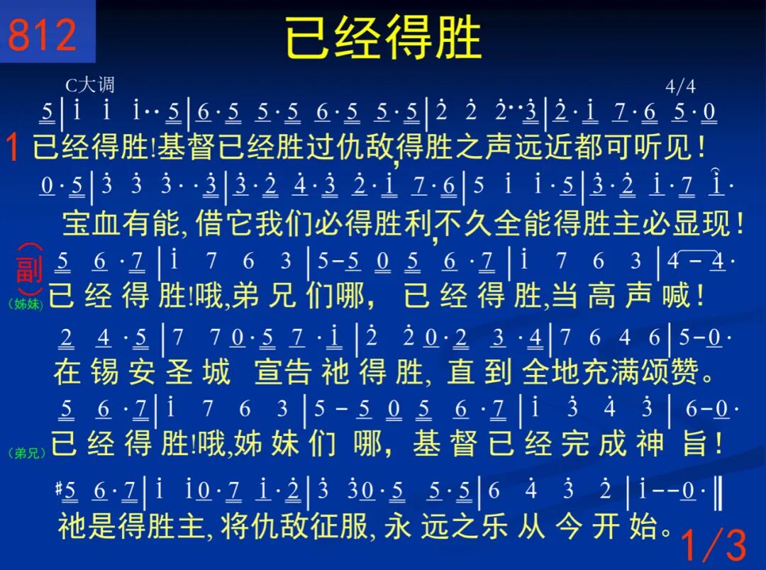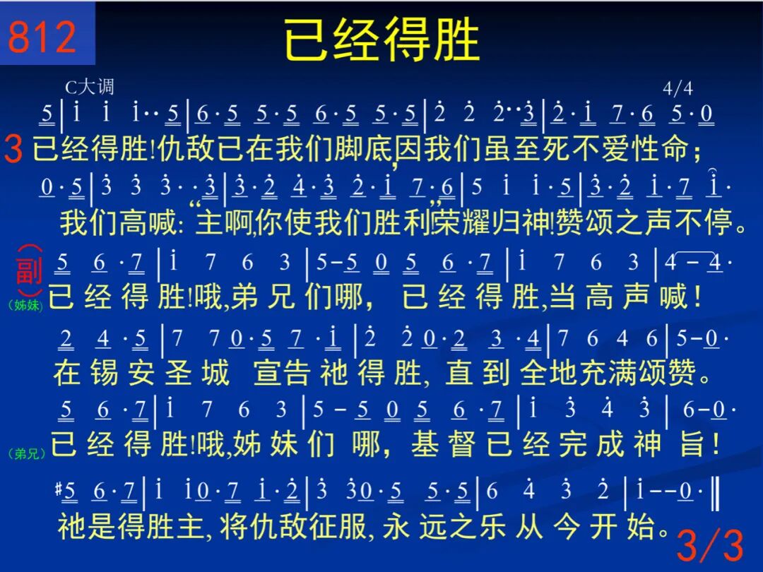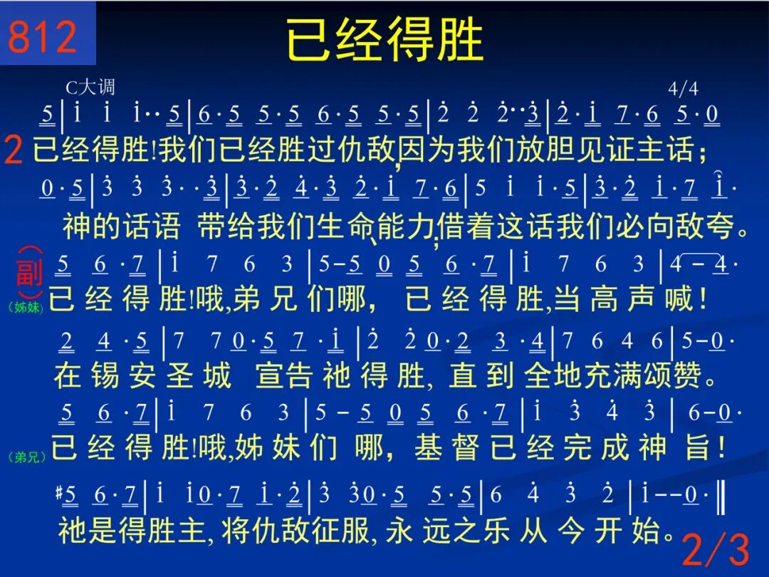 已经得胜!基督已经胜过仇敌,得胜之声远近都可听见!宝血有能,藉它我们必得胜利,不久全能得胜主必显现! (女声) 已经得胜!哦,弟兄们哪,已经得胜,当高声喊!在锡安圣城宣告祂得胜,直到全地充满颂赞。(男声)已经得胜!哦,姊妹们哪,基督已经完成神旨!祂是得胜主,将仇敌征服,永远之乐从今开始。 二 已经得胜!我们已经胜过仇敌,因为我们放胆见证主话;神的话语带给我们生命、能力;藉着这话我们必向敌夸。 (女声) 已经得胜!哦,弟兄们哪,已经得胜,当高声喊!在锡安圣城宣告祂得胜,直到全地充满颂赞。(男声)已经得胜!哦,姊妹们哪,基督已经完成神旨!祂是得胜主,将仇敌征服,永远之乐从今开始。 三 已经得胜!仇敌已在我们脚底,因我们虽至死不爱性命;我们高喊:“主阿,你使我们胜利!”荣耀归神!赞颂之声不停。 (女声) 已经得胜!哦,弟兄们哪,已经得胜,当高声喊!在锡安圣城宣告祂得胜,直到全地充满颂赞。(男声)已经得胜!哦,姊妹们哪,基督已经完成神旨!祂是得胜主,将仇敌征服,永远之乐从今开始。