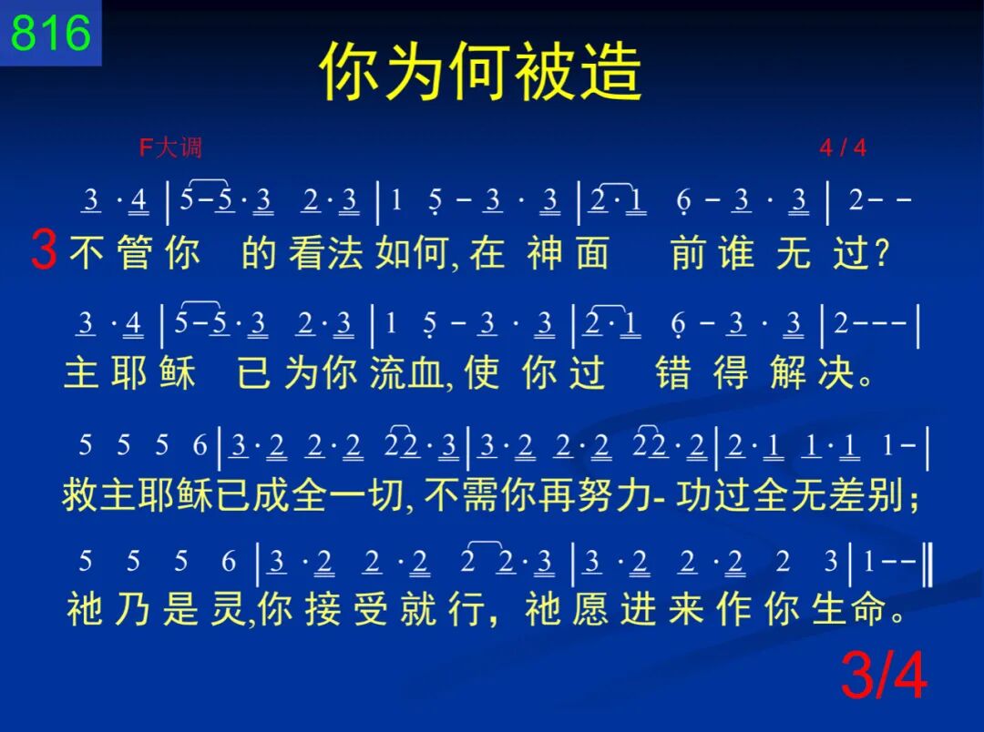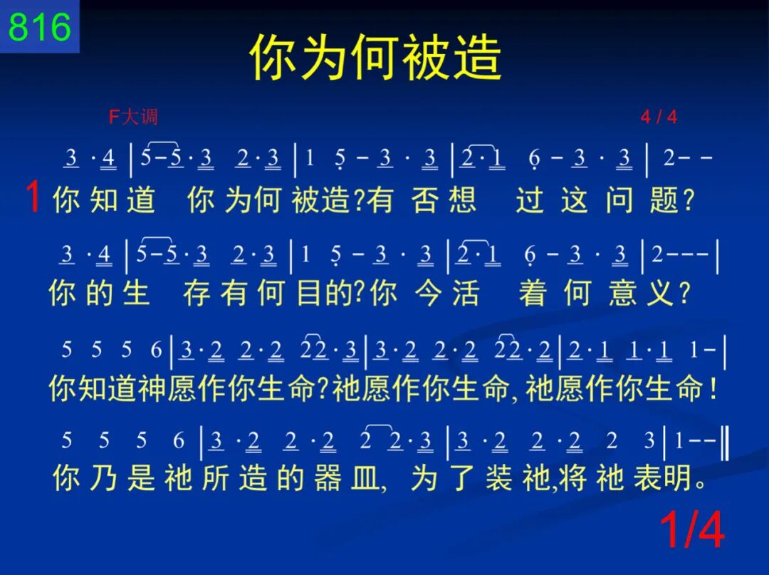 你知道你为何被造?有否想过这问题?你的生存有何目的?你今活着何意义!你知道神愿作你生命?祂愿作你生命,祂愿作你生命!你乃是祂所造的器皿,为了装祂,将祂表明。 二 你有灵,在你最深处,比你的心更深入;你的心装许多事物,但你的灵仍缺如!多少年来,你虚空度日;虽然到处尝试,总是不得满足。你的深处岂不觉渴慕;愿意敞开,尝尝耶稣? 三 不管你的看法如何,在神面前谁无过?主耶稣已为你流血,使你过错得解决。救主耶稣已成全一切,不需你再努力─功过全无差别;祂乃是灵,你接受就行,祂愿进来作你生命。 四 犹如你外面的身子,容纳自己正合式,你的灵─在你的深处,乃是专为容纳主。何不现在从深处敞开,现在让主进来,充满你的心怀;何不现在从深处敞开,呼喊主名,祂必进来。